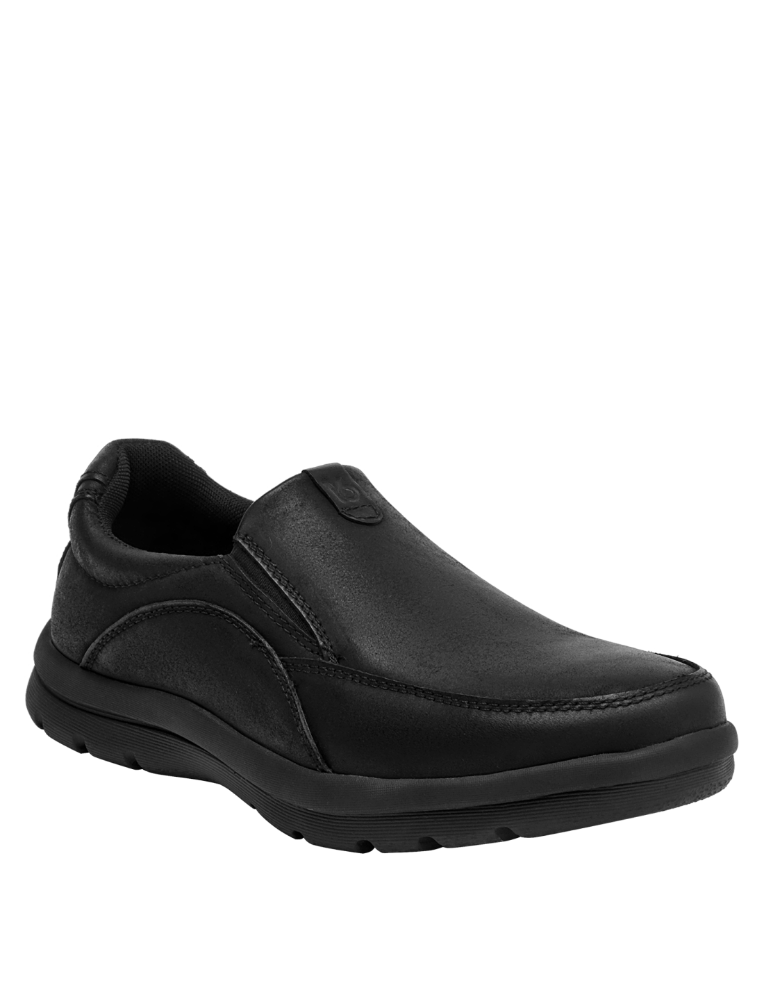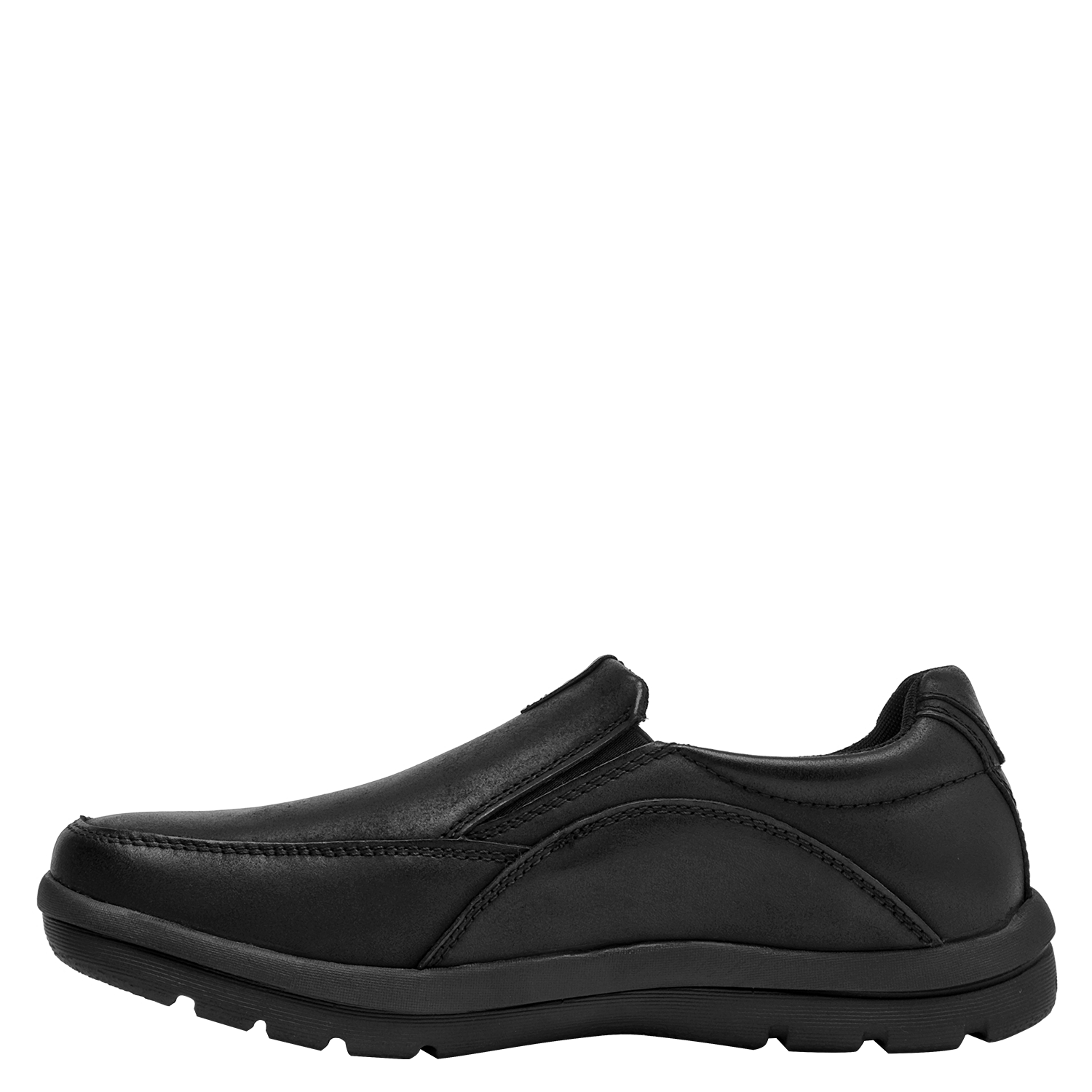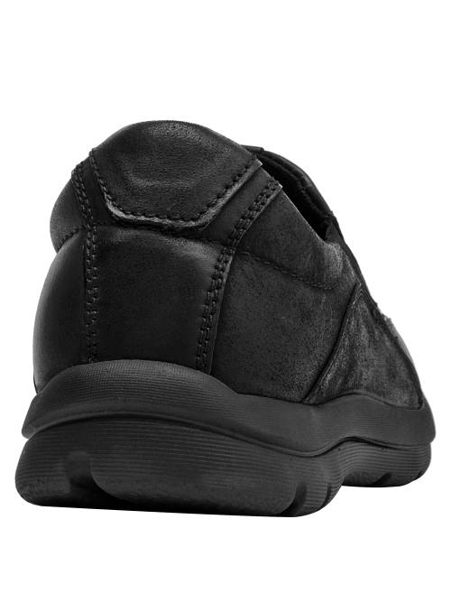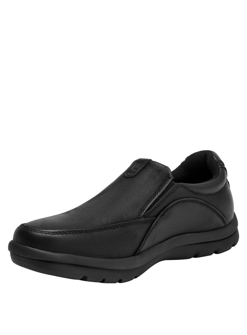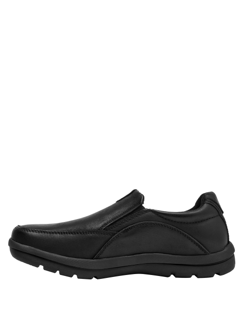 Zapatilla urbana de cuero para hombre en color negro, diseñada con punta redonda y suela plana de 3 cm. El acabado liso aporta un estilo limpio, mientras el forro de mesh favorece la ventilación. Costuras discretas completan un perfil sobrio y funcional, ideal para el uso diario y looks versátiles.