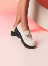 El Mocasín de mujer de Pollini ofrece un diseño clásico con un toque moderno, confeccionado en cuero para una textura suave y resistente. Su tono crema claro y adorno metálico en la parte superior aportan elegancia, mientras que la suela gruesa negra añade un aire contemporáneo y casual, ideal para quienes buscan un estilo utilitario.