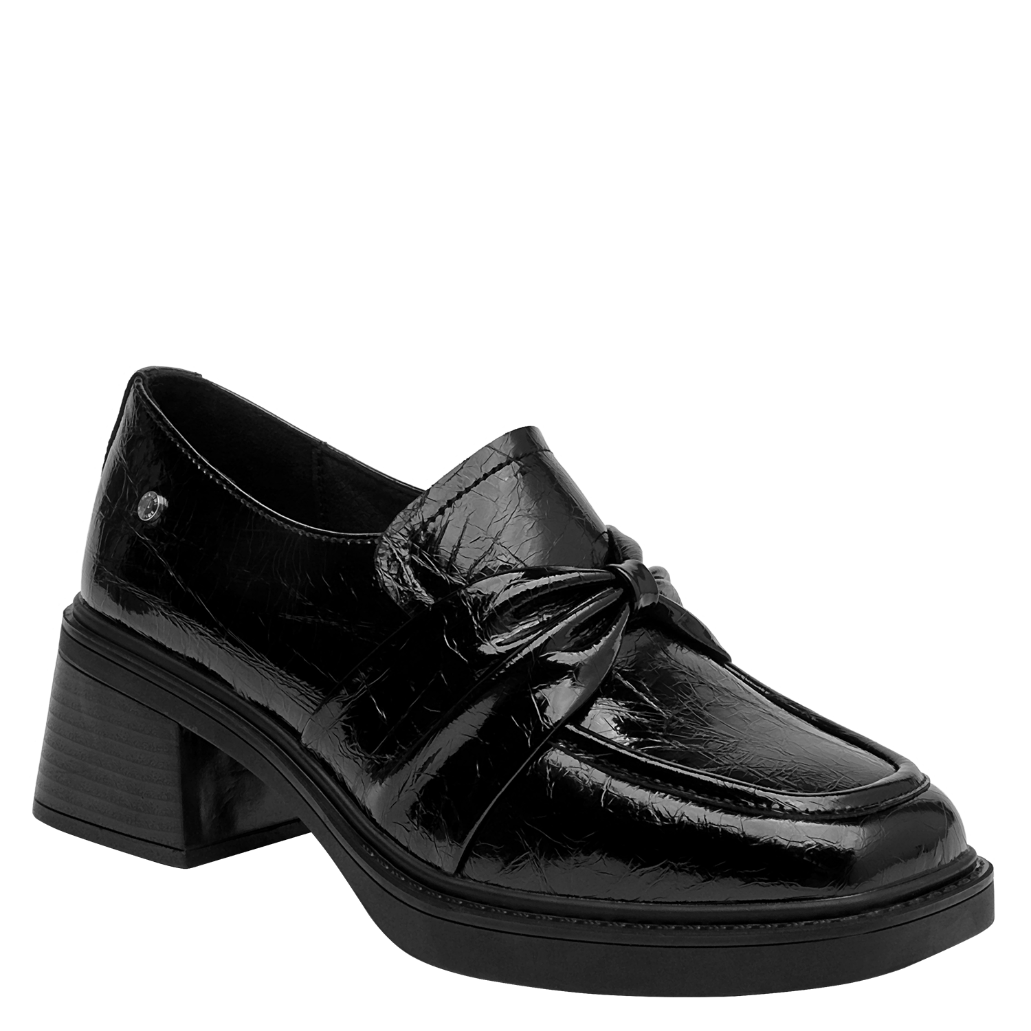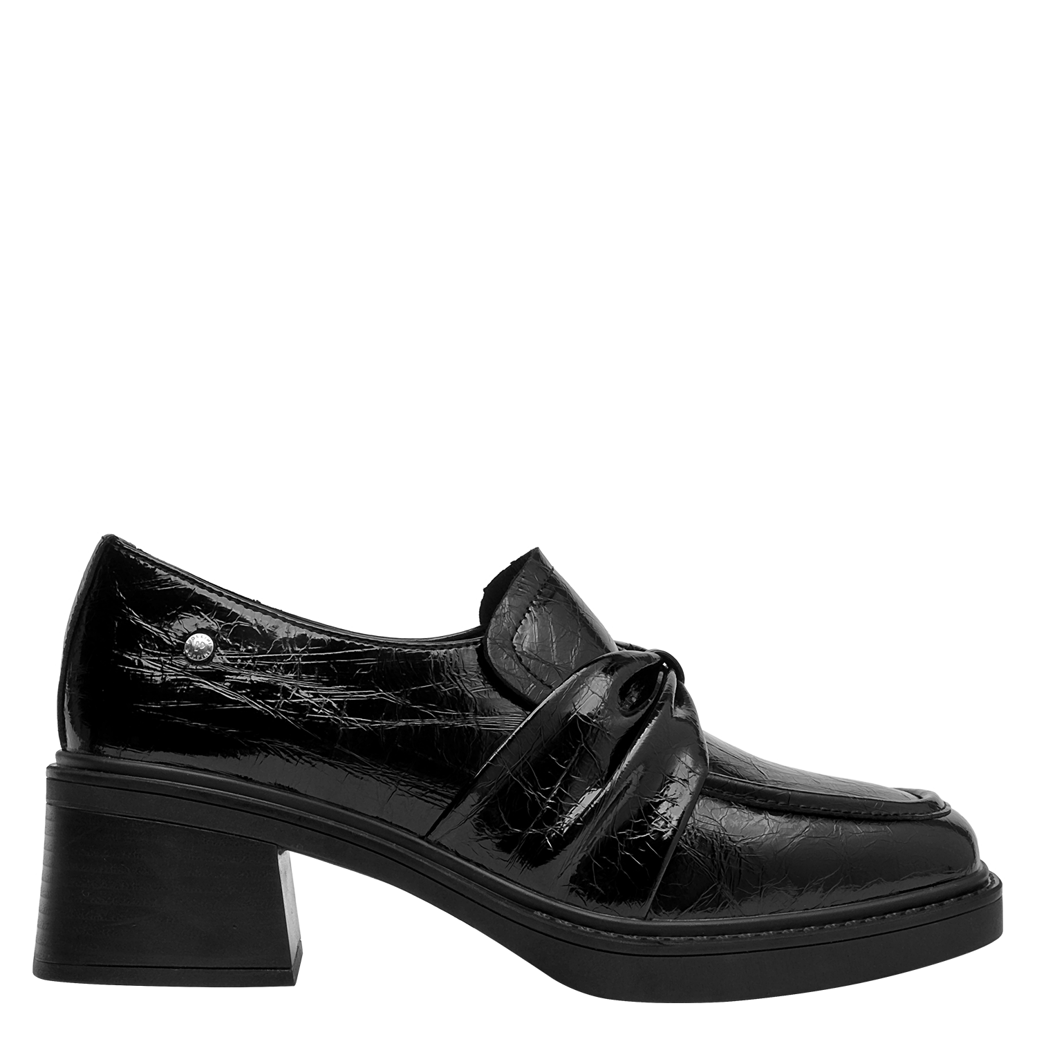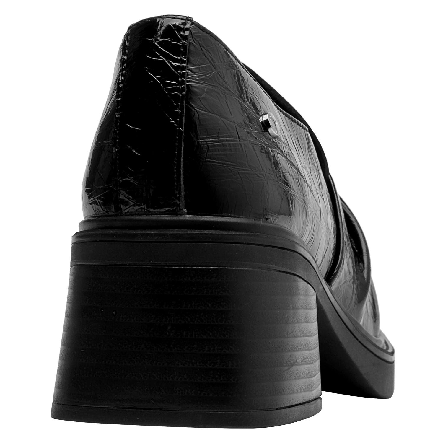Zapato de tacón bloque para mujer en cuero negro, con punta cuadrada y un taco de 5,5 cm que ofrece altura moderada y estabilidad. La capellada de cuero luce un acabado limpio y elegante, con líneas minimalistas que estilizan el pie y lo hacen versátil para el día a día o eventos semiformales. Forro de microfibra para una sensación suave al contacto.
