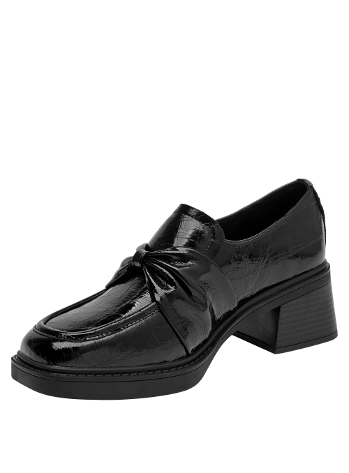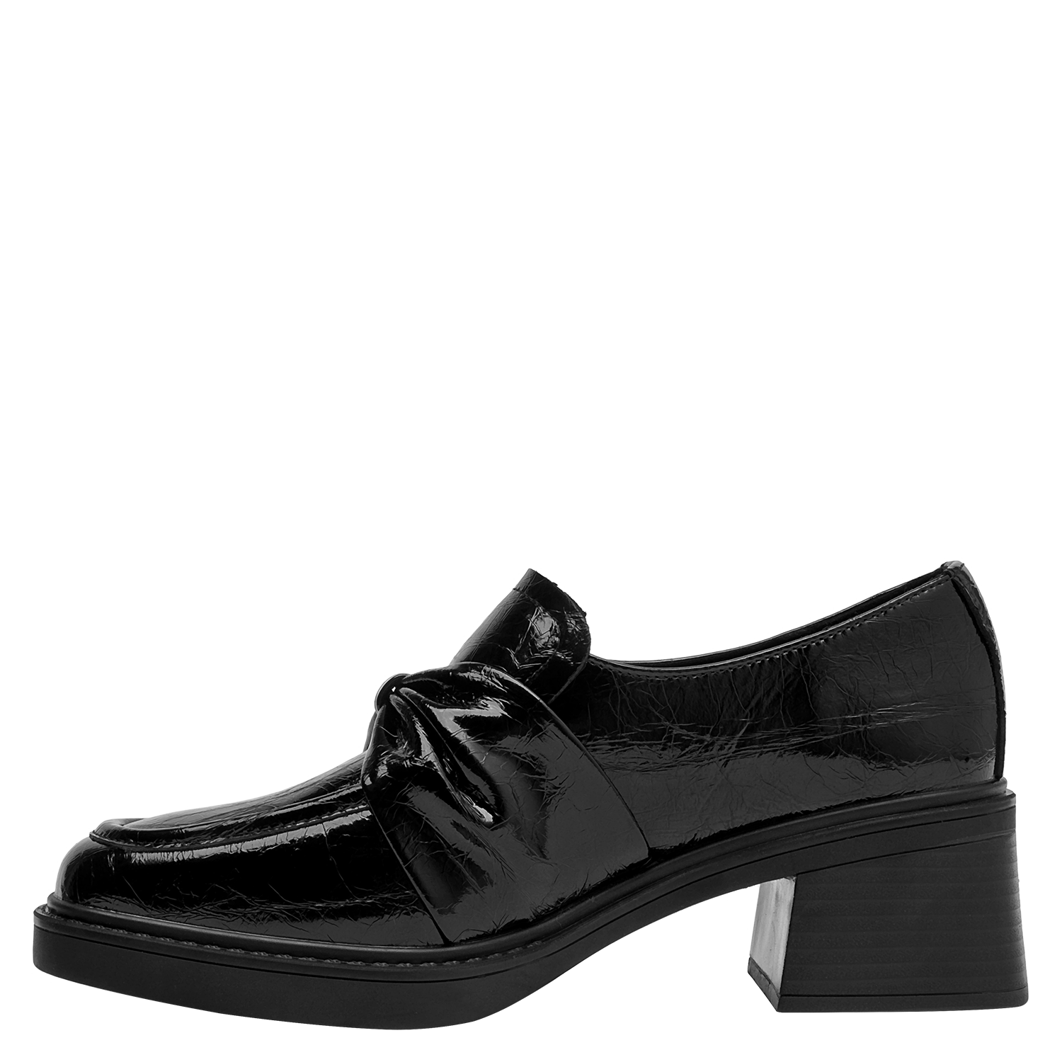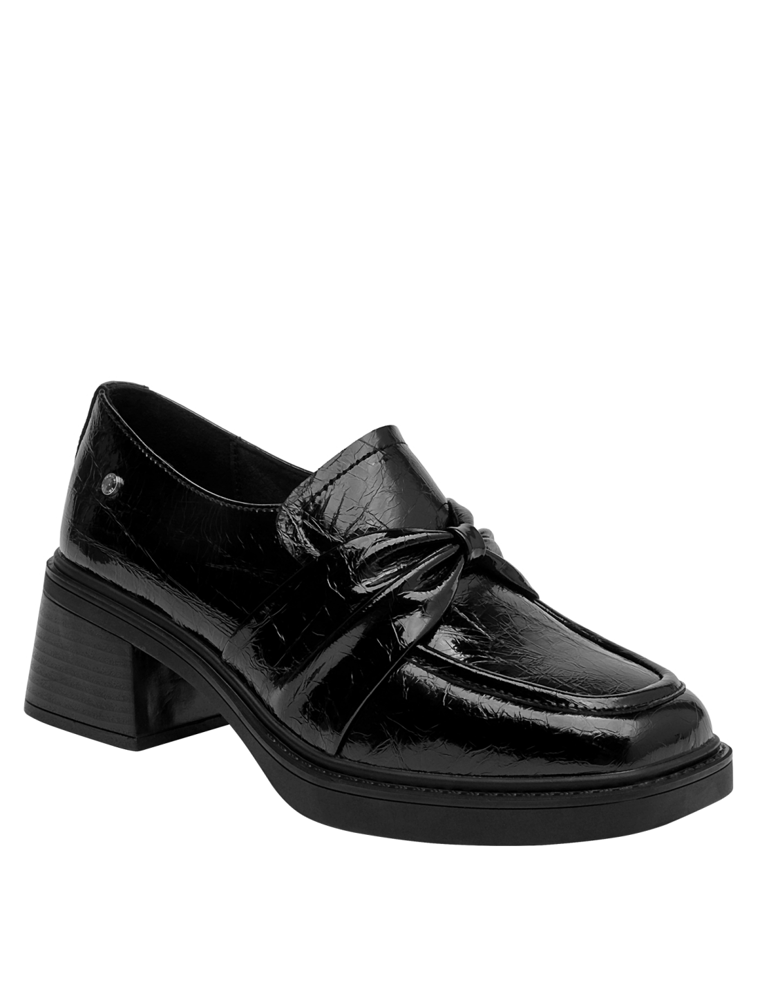 Zapato de tacón bloque para mujer en cuero negro, con punta cuadrada y un taco de 5,5 cm que ofrece altura moderada y estabilidad. La capellada de cuero luce un acabado limpio y elegante, con líneas minimalistas que estilizan el pie y lo hacen versátil para el día a día o eventos semiformales. Forro de microfibra para una sensación suave al contacto.