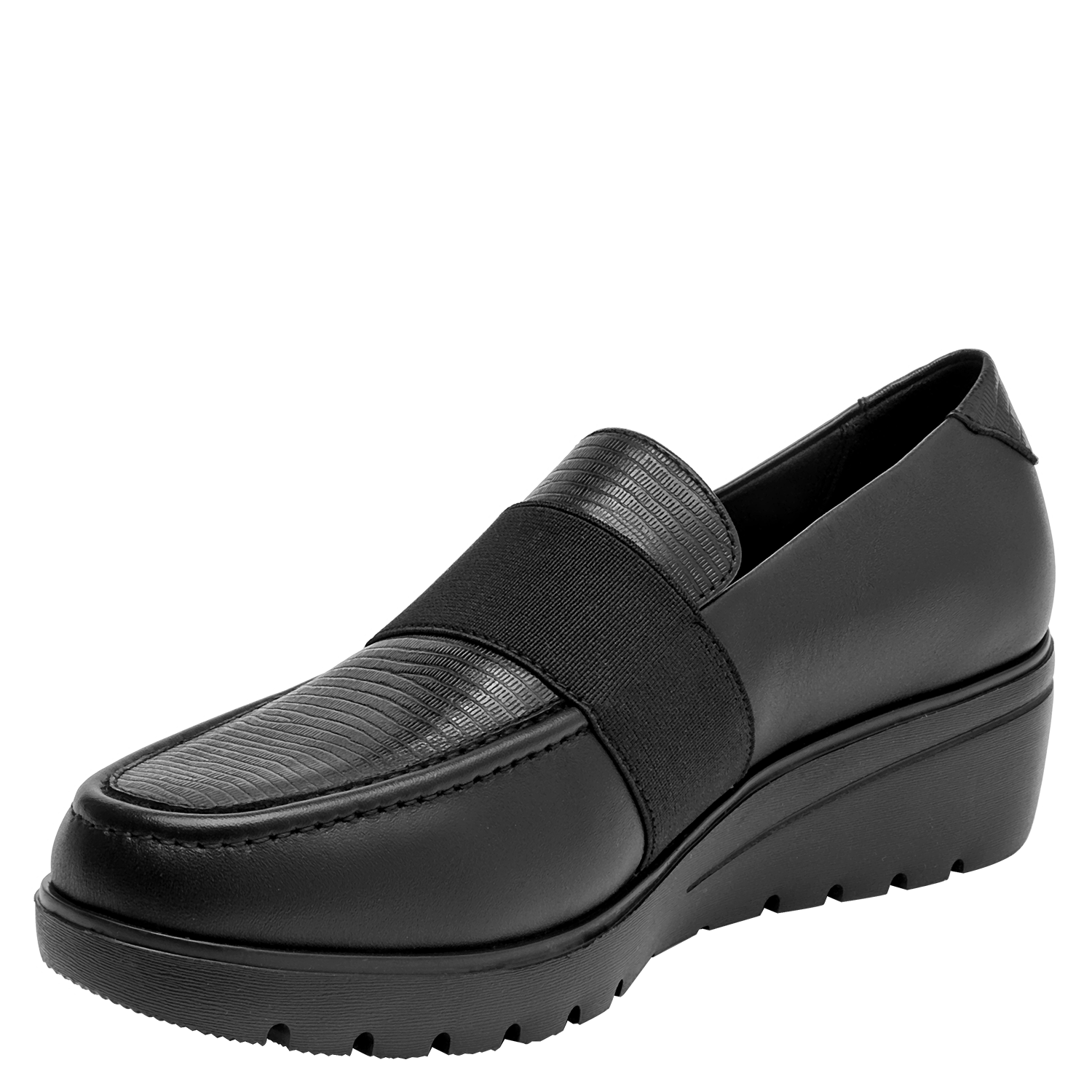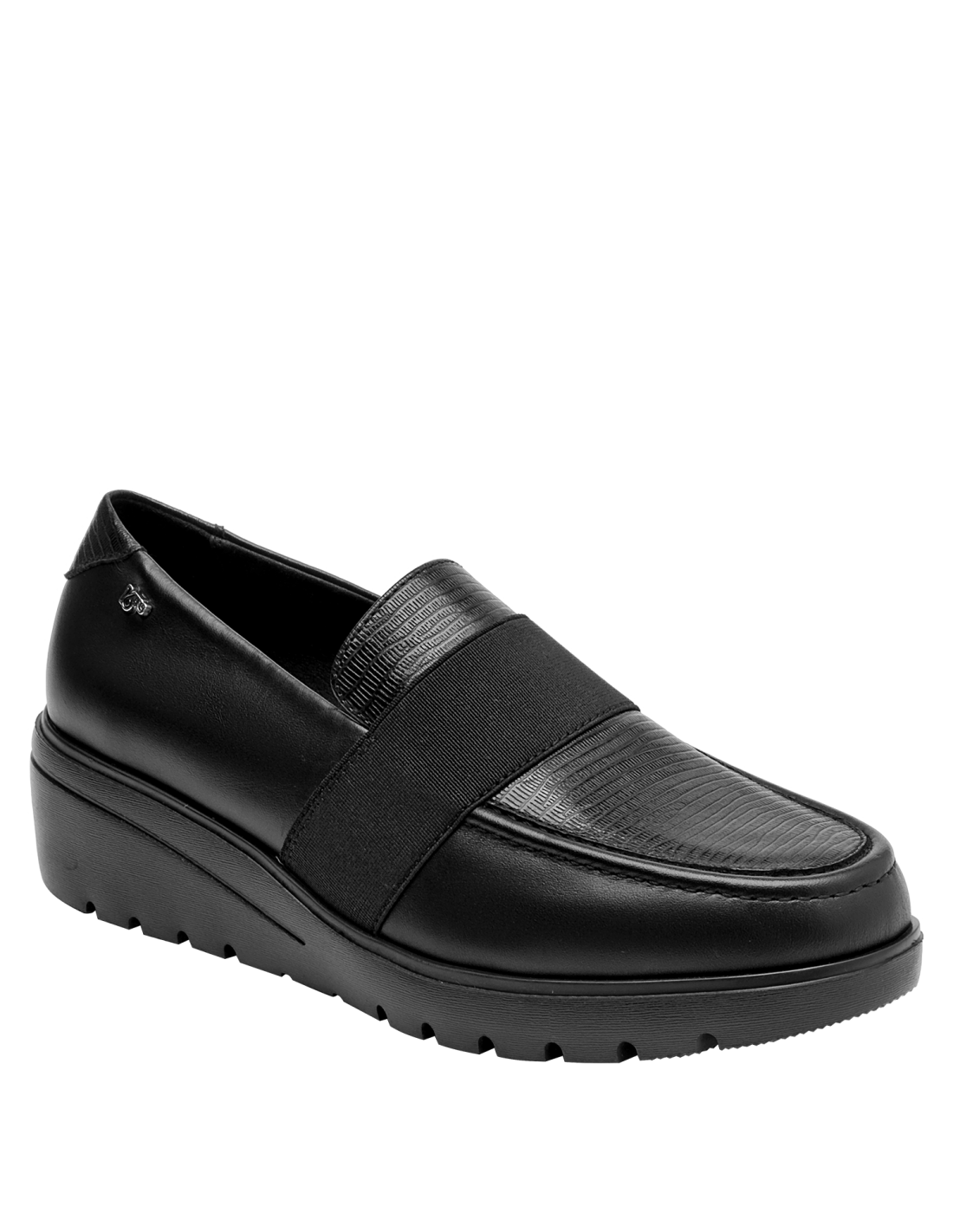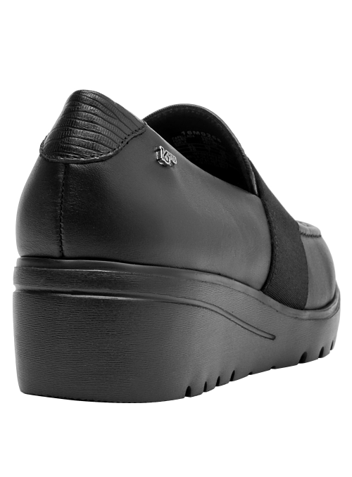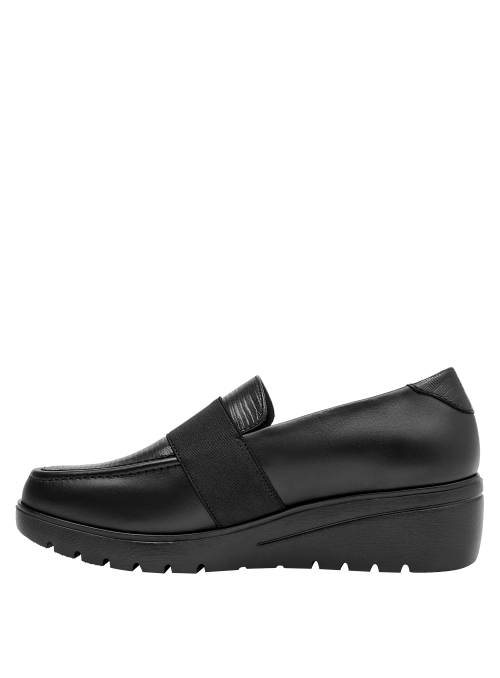Botín de cuero con cuña para mujer en color negro, con punta redonda y altura de 5 cm, pensado para aportar estabilidad y una sutil elevación. Confeccionado en cuero y forro suave y respirable, abraza el pie con sensación agradable. La cuña media estiliza la silueta sin renunciar a la practicidad del día a día, y su diseño limpio favorece combinaciones versátiles.