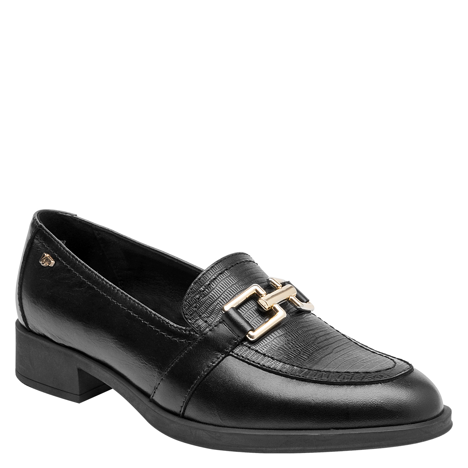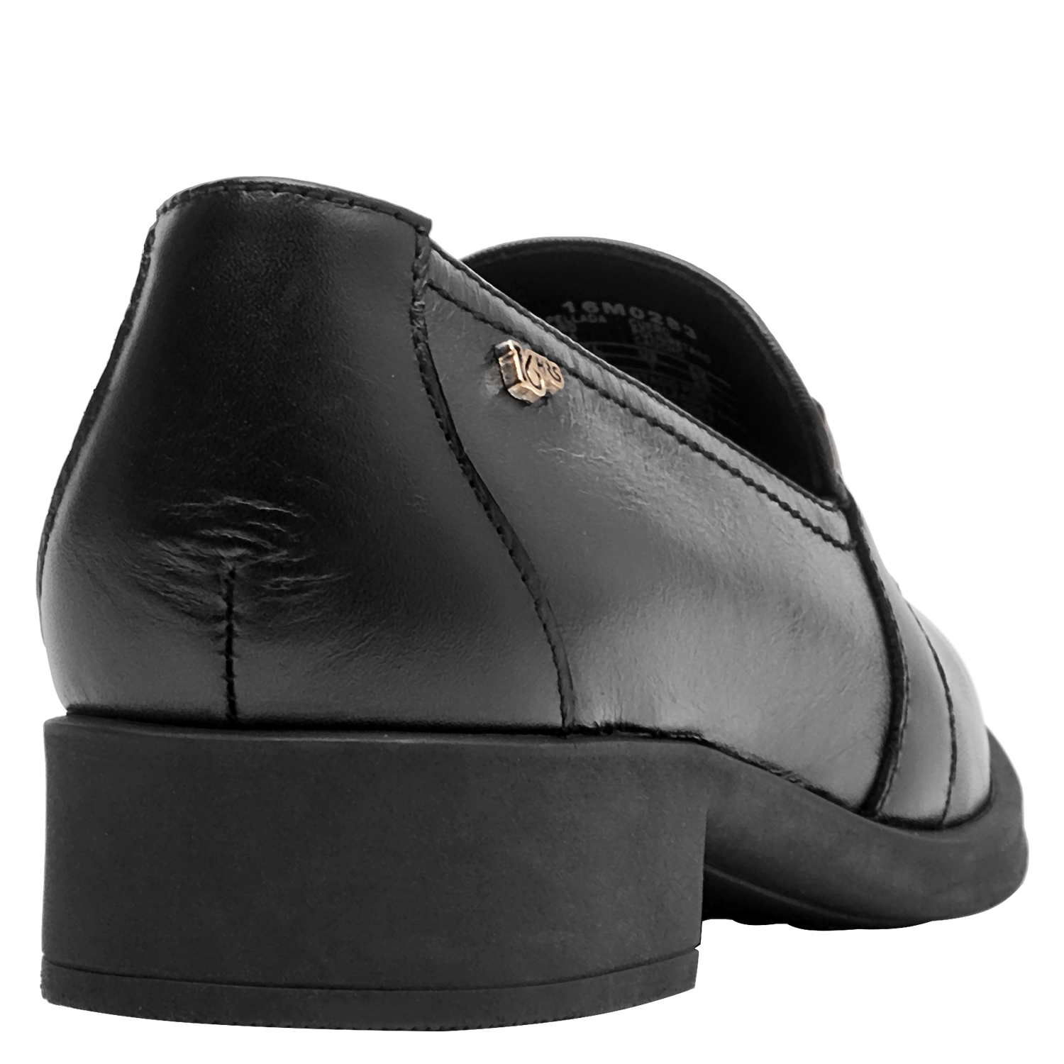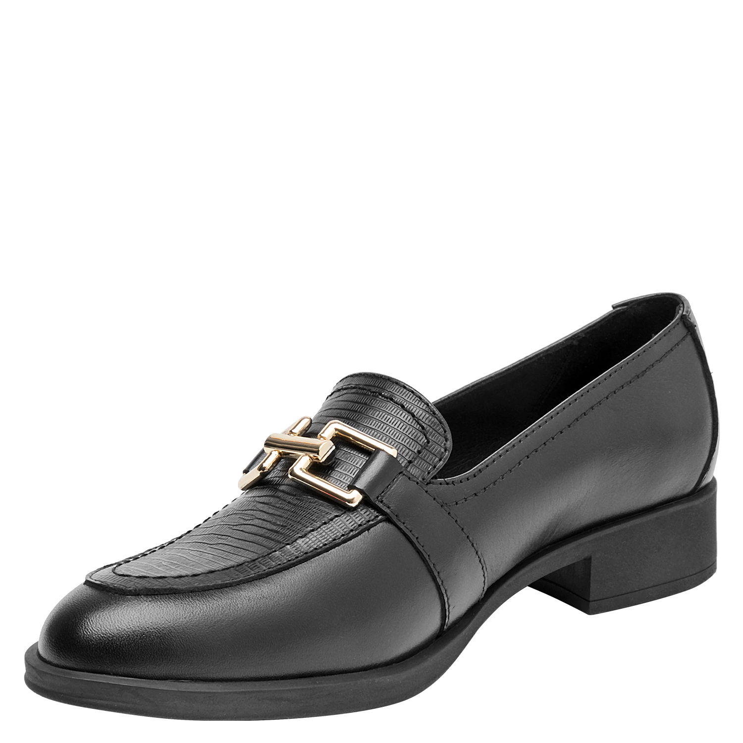 Mocasín plano de cuero para mujer en color negro, de estilo minimalista con punta redonda y taco de 2,5 cm. Su acabado liso y las costuras discretas aportan una estética pulida, mientras el forro suave aporta confort al contacto. La horma redondeada entrega una silueta clásica y fácil de combinar, adecuada para looks casuales y semi-formales.