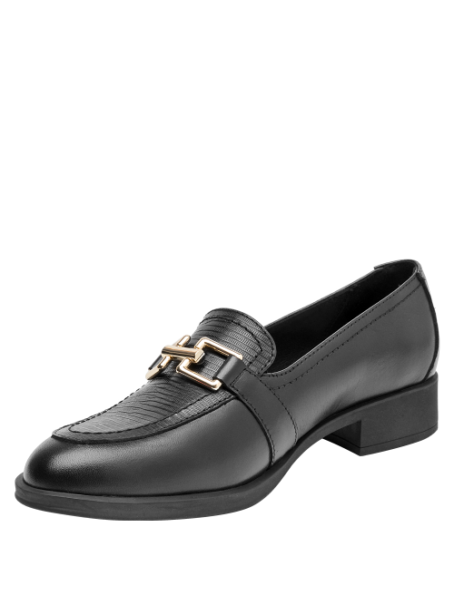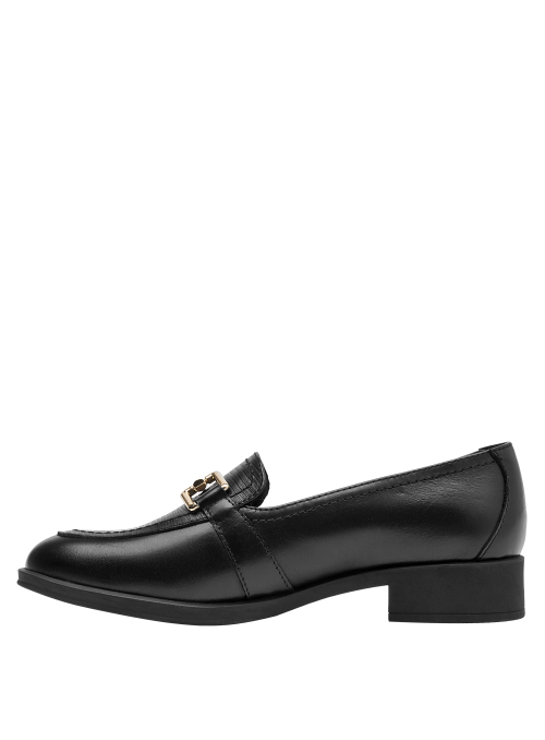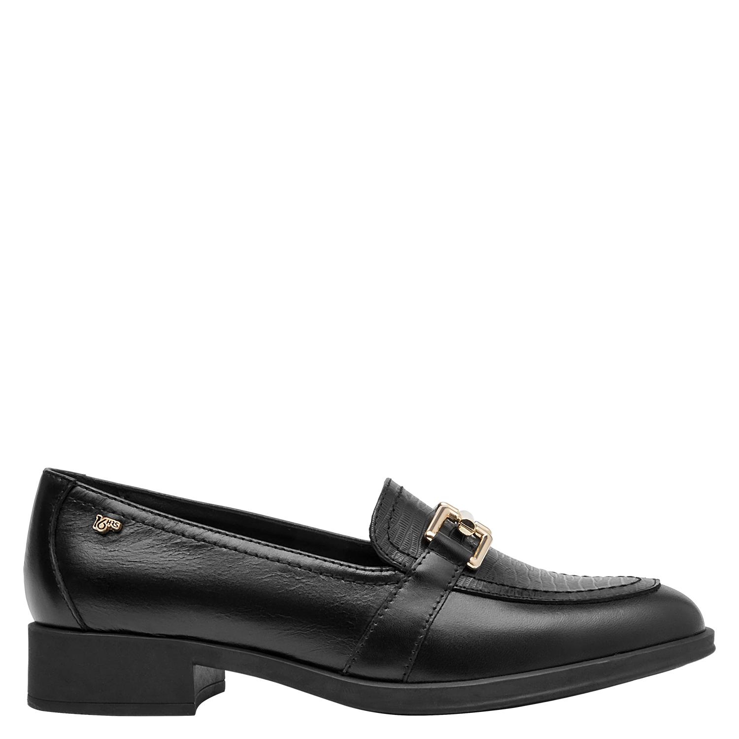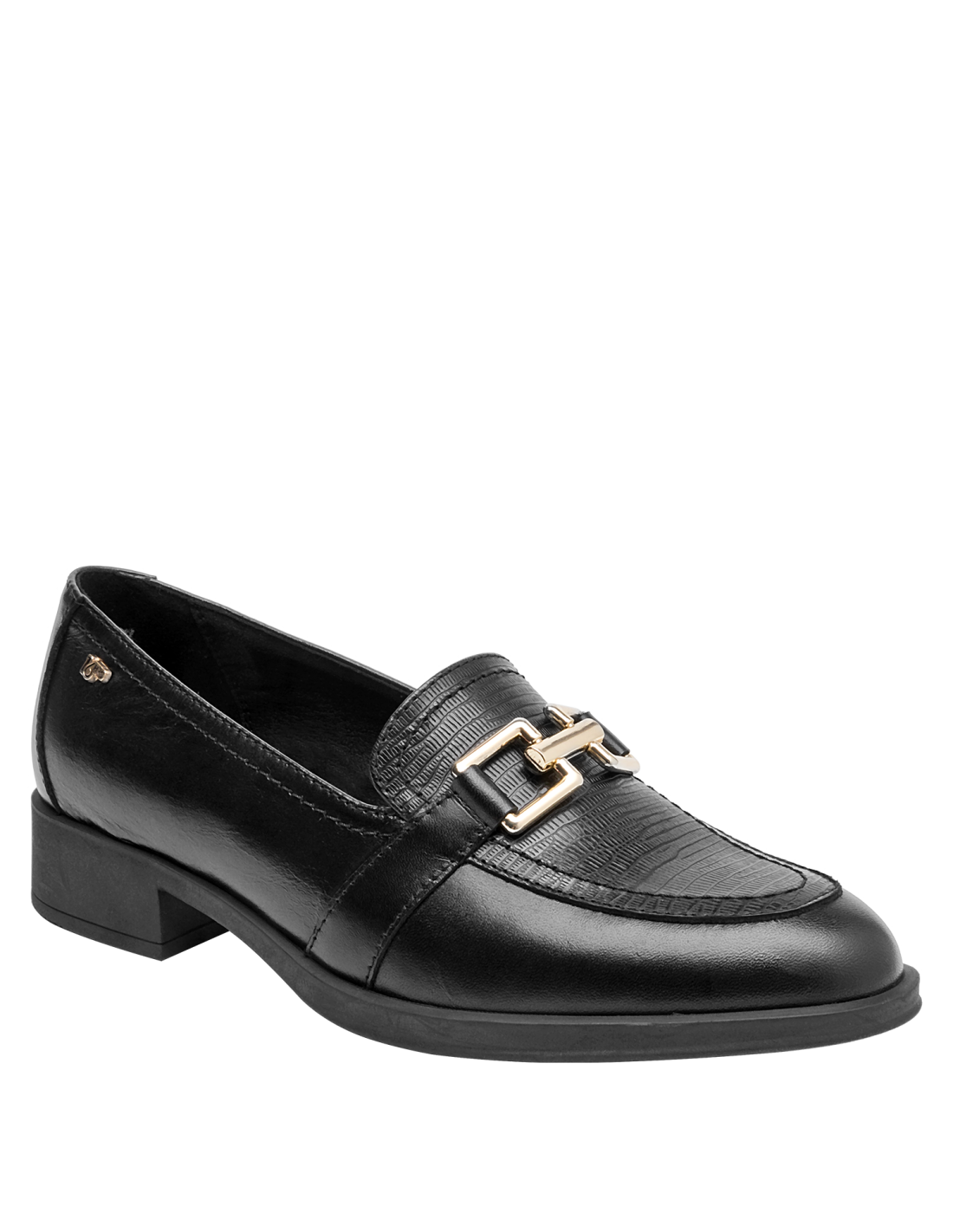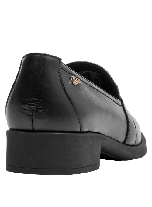Mocasín plano de cuero para mujer en color negro, de estilo minimalista con punta redonda y taco de 2,5 cm. Su acabado liso y las costuras discretas aportan una estética pulida, mientras el forro suave aporta confort al contacto. La horma redondeada entrega una silueta clásica y fácil de combinar, adecuada para looks casuales y semi-formales.