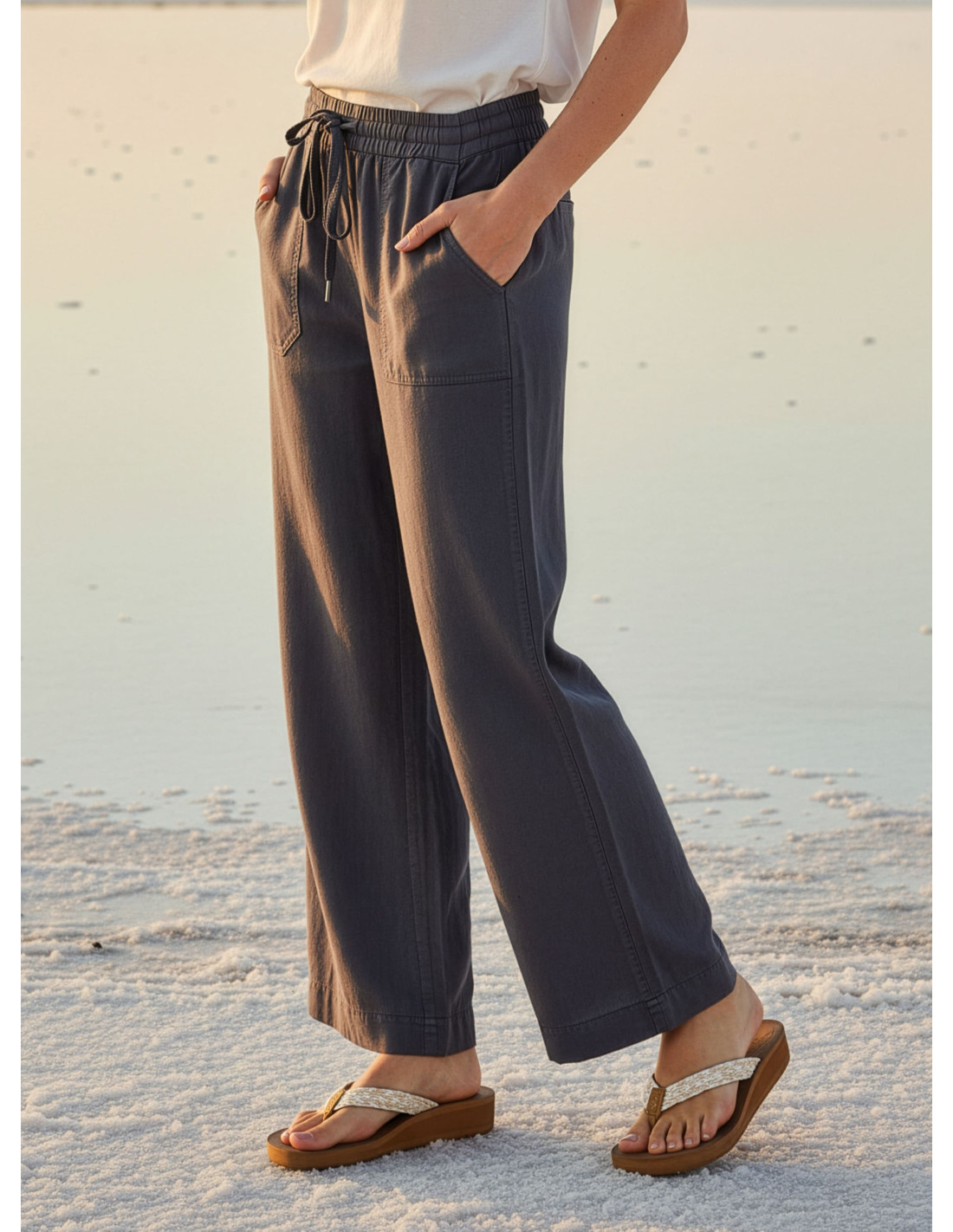 Pantalón de mujer de estilo casual-contemporáneo en color azul, confeccionado en 98% Tencel y 2% spandex para una caída fluida y tacto suave. Presenta tiro medio, pierna recta y pretina con pasadores para cinturón. Incluye bolsillos laterales y traseros discretos y cierre frontal limpio, ideal para un look pulido de todos los días. La leve elasticidad aporta movilidad sin perder estructura.