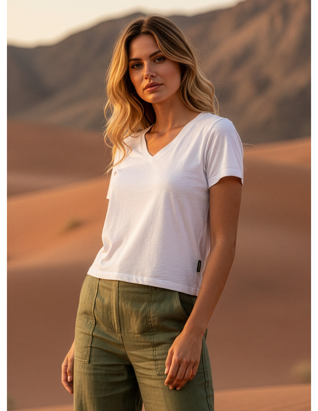 Polera casual para mujer en color blanco, confeccionada en una mezcla de 65% algodón y 35% poliéster que equilibra suavidad y resistencia. De corte clásico y liviano, ofrece un look limpio gracias a su acabado liso y una caída natural que facilita la combinación en el día a día.