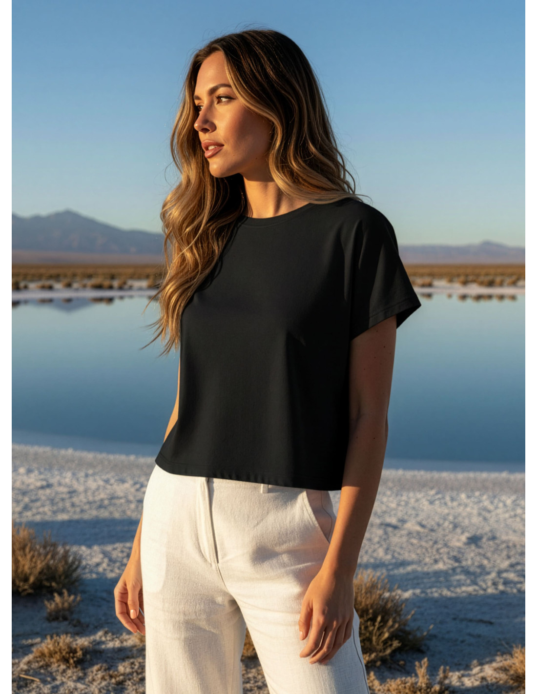 Polera casual para mujer en color negro, confeccionada en una mezcla 65% algodón y 35% poliéster que ofrece suavidad y fácil cuidado. Su diseño versátil y minimalista se adapta a múltiples estilos, con caída ligera y confort para el día a día. Ideal para crear looks desde relajados hasta urbanos, fácil de combinar en cualquier temporada.