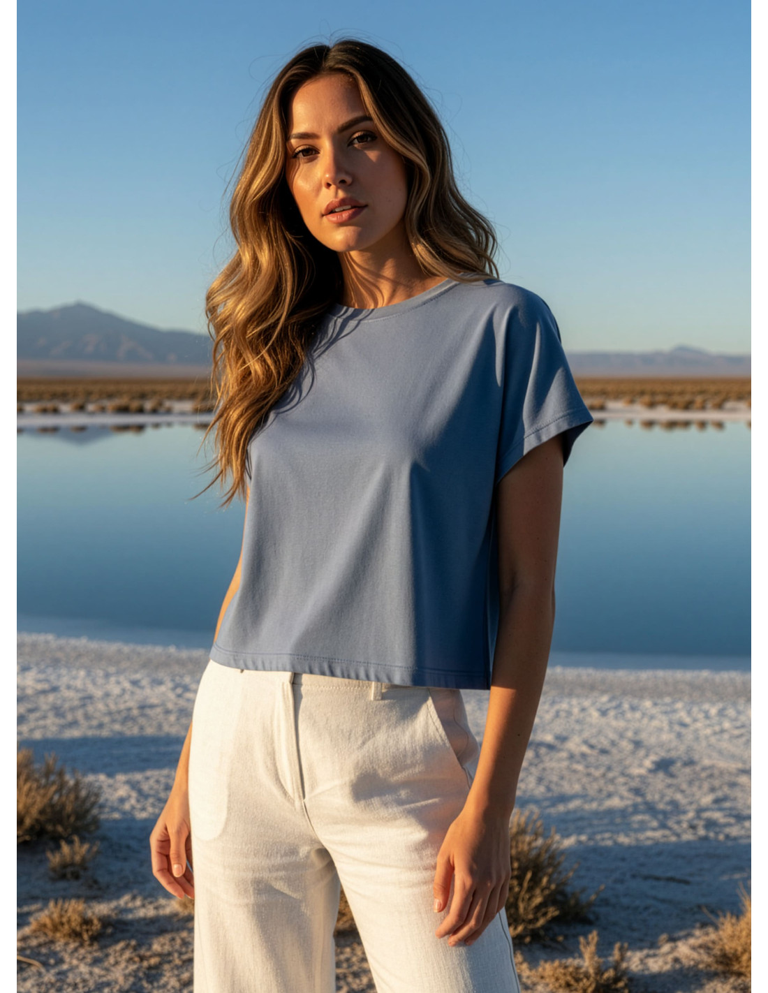 Polera casual para mujer en color celeste, confeccionada en una mezcla 65% algodón y 35% poliéster. Presenta un diseño de líneas limpias y acabado liso, sin adornos ni estampados visibles, pensado para un look simple y versátil. La combinación de materiales aporta suavidad y una sensación ligera al tacto, ideal para el uso diario en distintas temporadas.