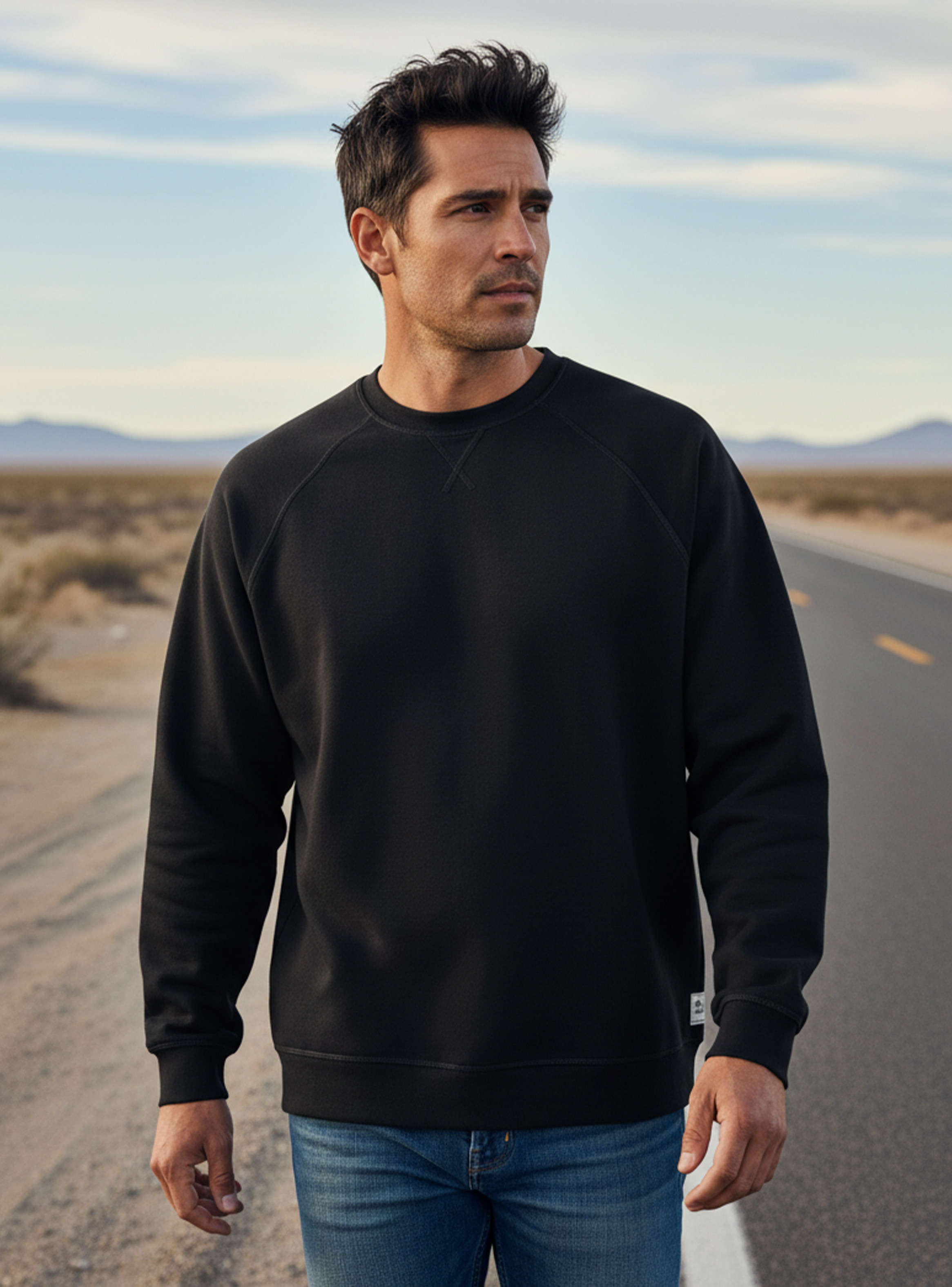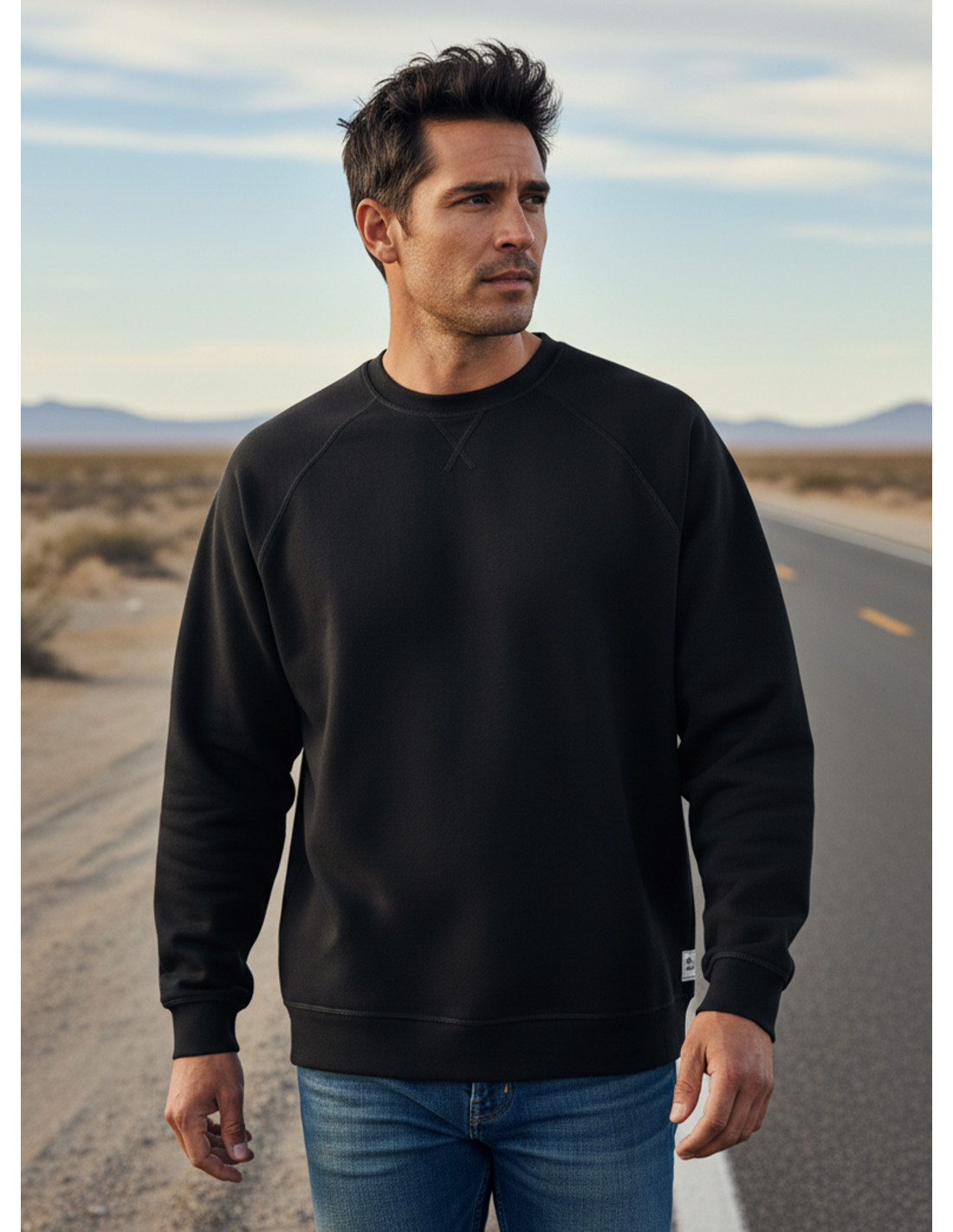 Polerón de hombre de corte clásico en color negro, ideal para el día a día. Con diseño de manga larga y confección en tejido mixto 85% algodón / 15% poliéster, ofrece tacto suave, buena respirabilidad y durabilidad. Presenta ajuste cómodo para superponer prendas y un acabado limpio y versátil que combina con todo.
