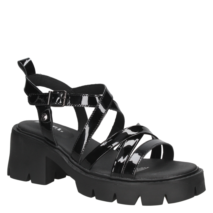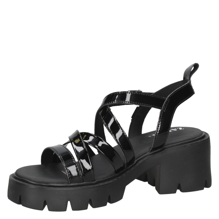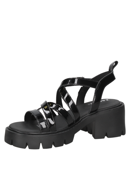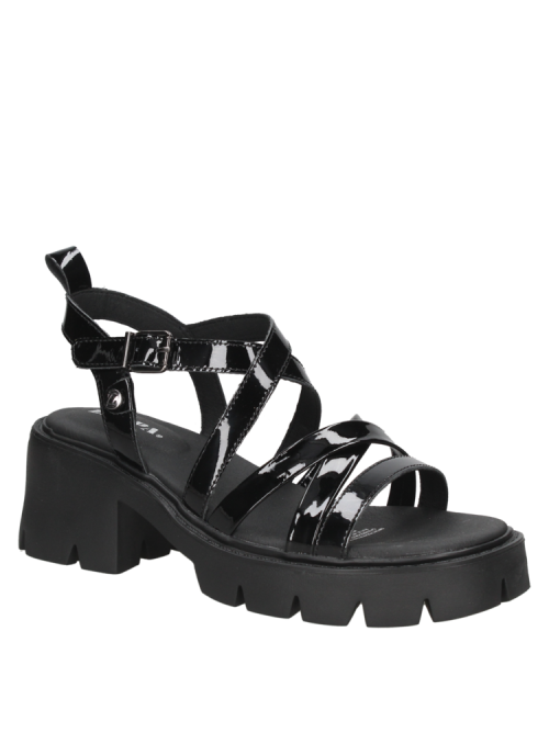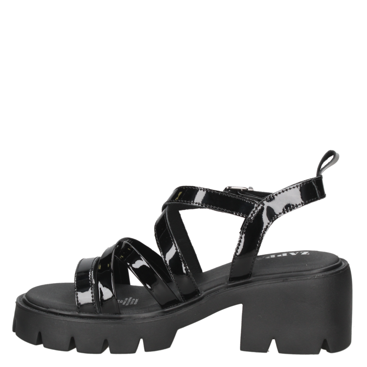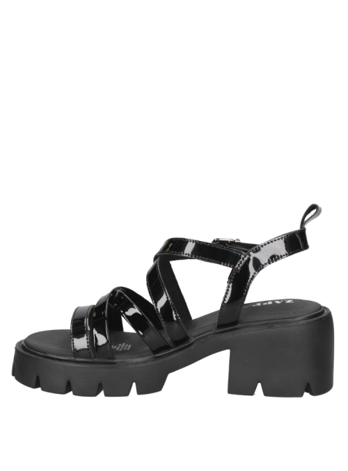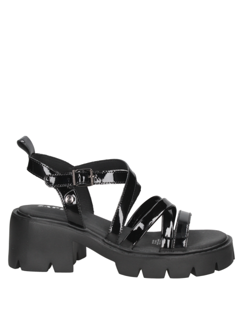 Sandalia negra de charol para mujer con tiras cruzadas y hebilla lateral, ideal para moda urbana.