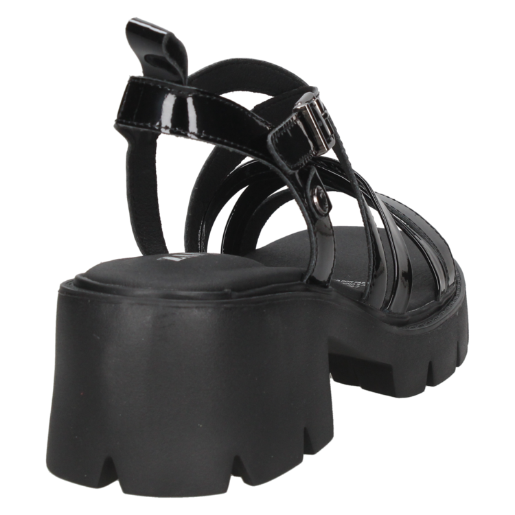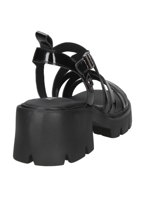 Sandalia negra de charol para mujer con tiras cruzadas y hebilla lateral, ideal para moda urbana. Calzado plataforma chunky de cuero negro, cómodo y perfecto para eventos informales. Sandalia moderna y audaz de cuero negro con suela gruesa, adaptable a looks veraniegos o street style. Sandalia de cuero negro con tiras cruzadas y cierre de hebilla, combinable con vestidos, jeans o faldas midi. Calzado femenino de charol negro con plataforma robusta, ideal para paseos urbanos o salidas casuales con amigos.