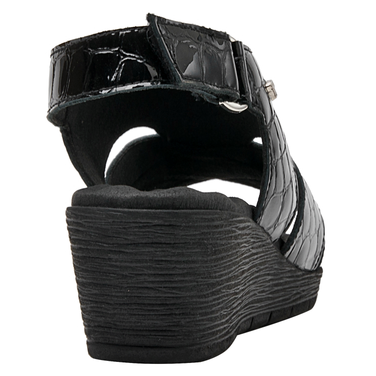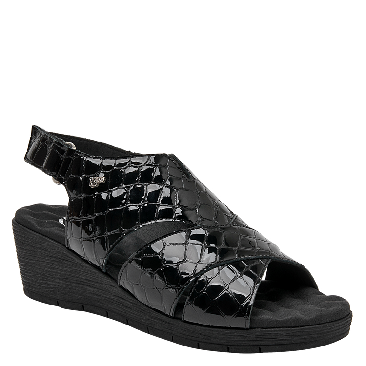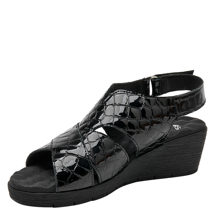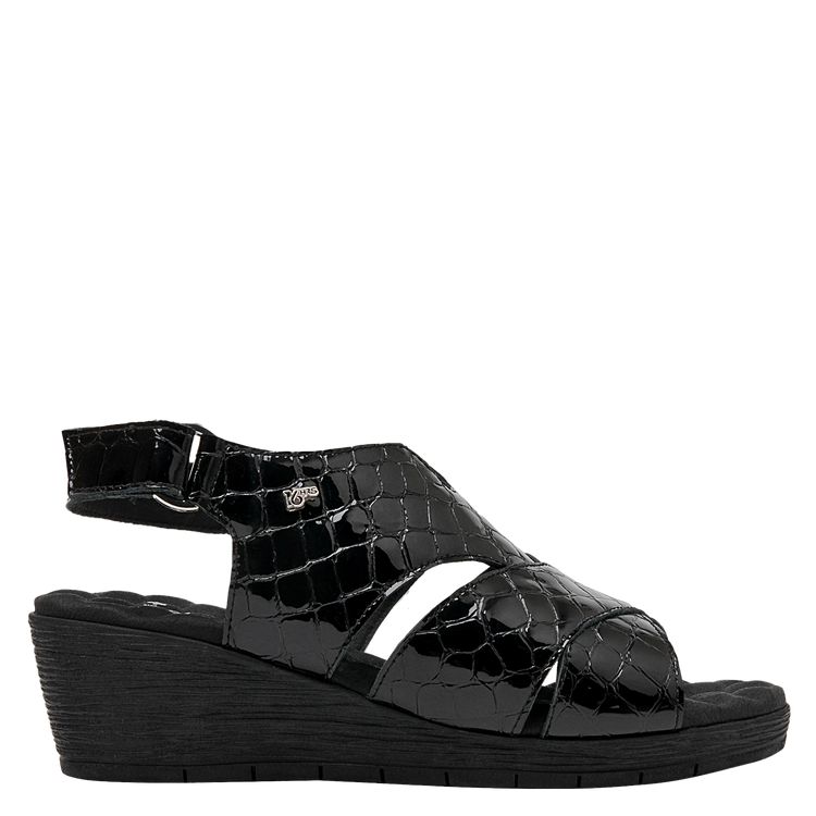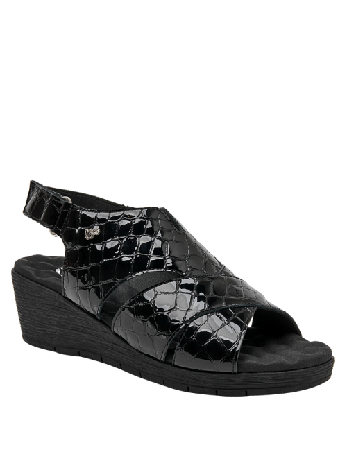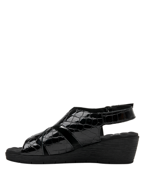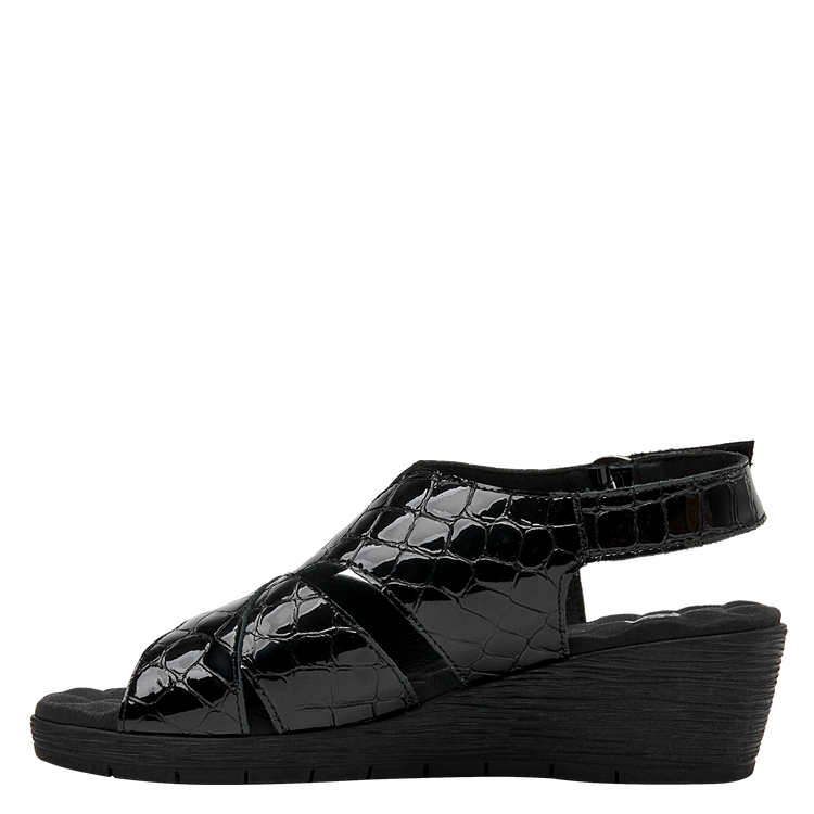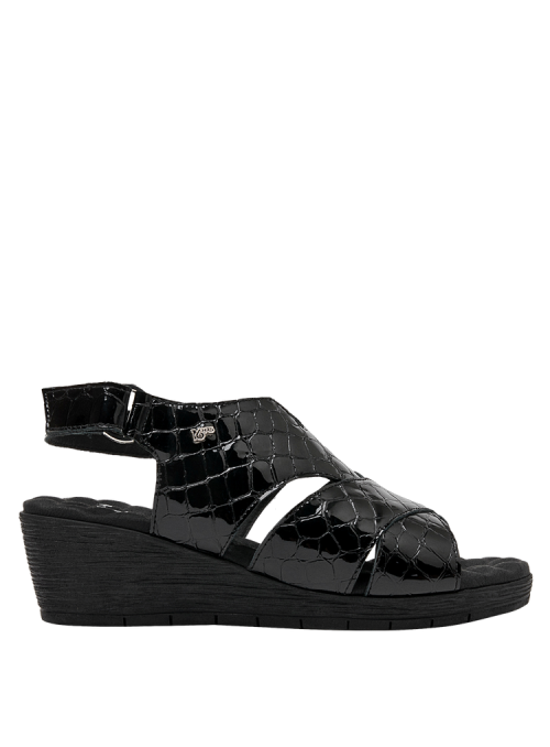 Lo que hace especial a esta sandalia es su diseño y los excelentes materiales empleados, que son tanto resistentes como ligeros. En el exterior, está elaborada de cuero charol, de calidad premium. El diseño se completa con un taco cuña de 5 cm lo suficientemente alto para estilizar tu figura sin sacrificar comodidad. La punta abierta brinda el equilibrio perfecto entre estilo y practicidad.