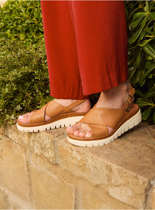 La Sandalia de mujer de 16 HRS combina un diseño moderno con funcionalidad, destacando por su exterior de cuero en color café claro que ofrece una apariencia sofisticada. La textura lisa y el diseño cruzado en la parte delantera aportan interés visual y comodidad, mientras que la suela gruesa y dentada asegura tracción para el uso diario.
