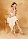 Sandalia casual de mujer en color beige. Confeccionada en material sintético y forro PU, luce punta abierta y taco plano de 4 cm, ofreciendo una base estable sin añadir exceso de altura. Su diseño minimalista y de líneas limpias la vuelve versátil y fácil de combinar, ideal para climas cálidos y para completar looks relajados con un toque prolijo.