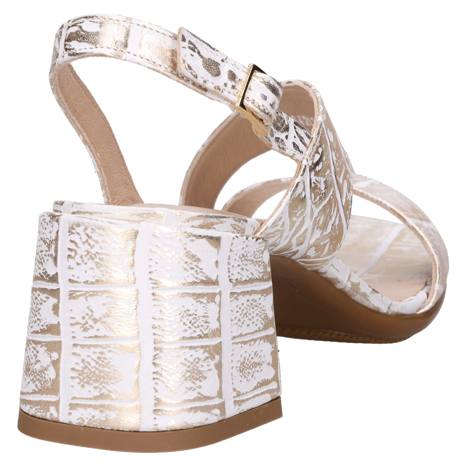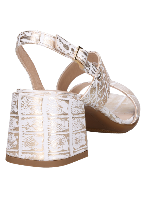 Sandalia de cuero para mujer en color oro, de estilo elegante y minimal. Presenta punta abierta y taco bloque de 5 cm que aporta estabilidad y una altura equilibrada. El exterior en cuero se complementa con forro de cuero, en un acabado pulcro y atemporal. Ideal para sumar un toque de brillo a tus looks de día o noche.