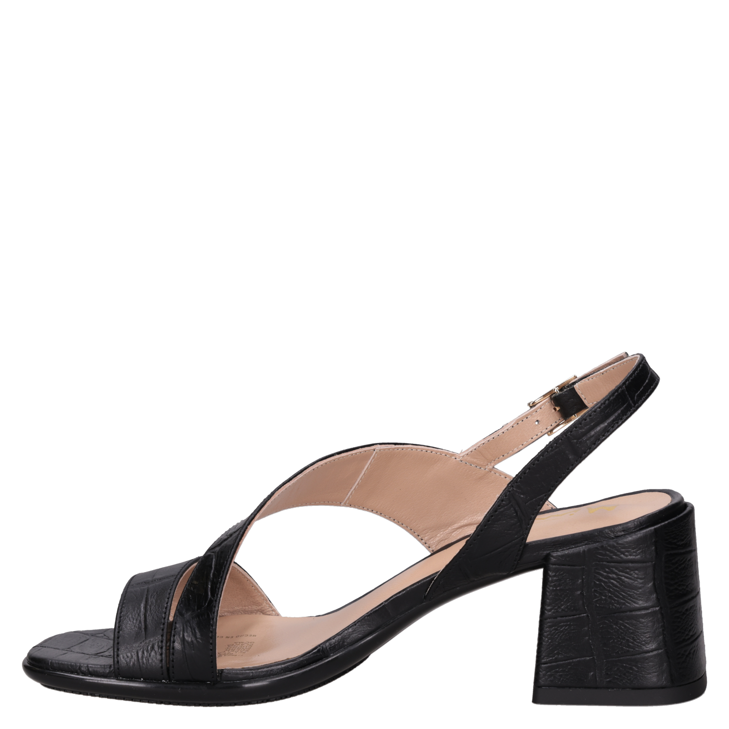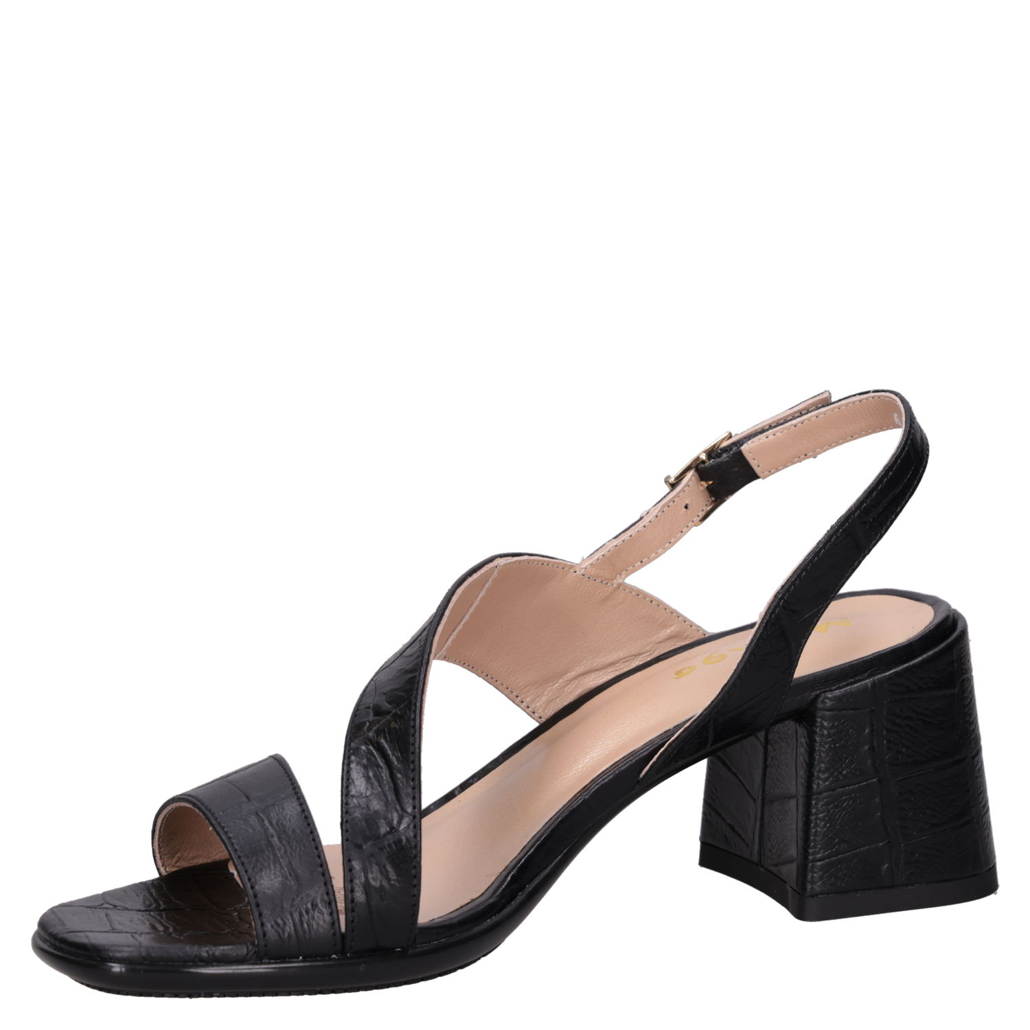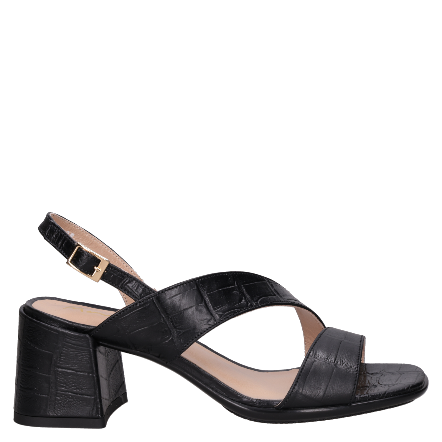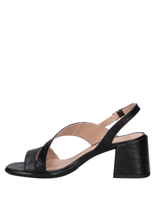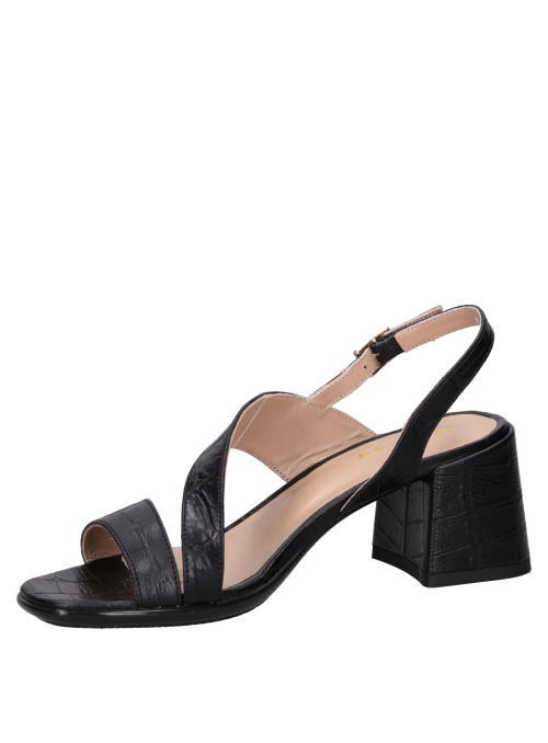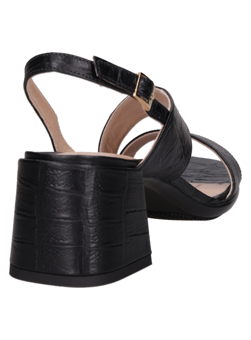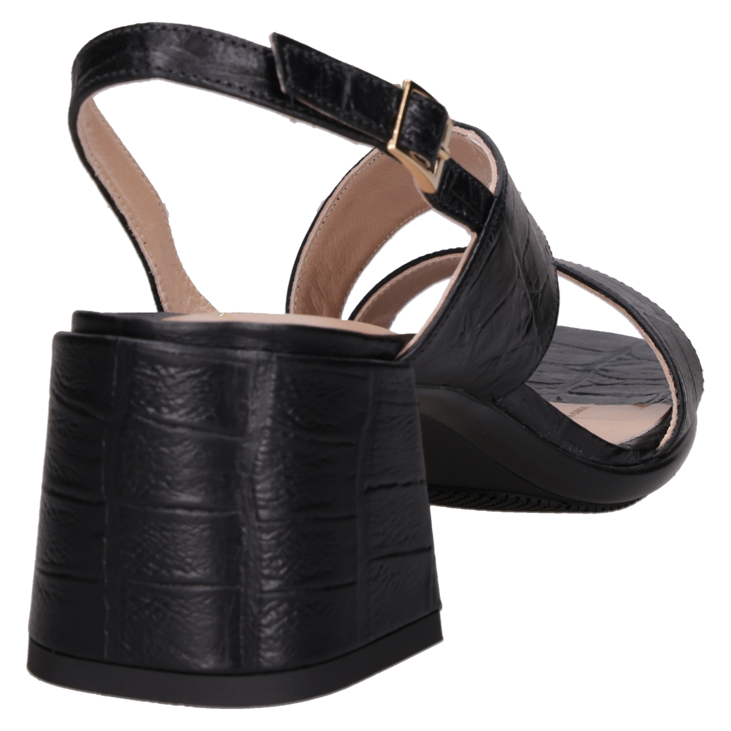 Sandalia de cuero para mujer en color negro, de diseño atemporal. Presenta punta abierta y taco bloque de 5 cm que aporta altura moderada con buena estabilidad. El interior está forrado en cuero para una sensación agradable al contacto y un acabado pulido que potencia su versatilidad, ideal para transiciones del día a la noche.