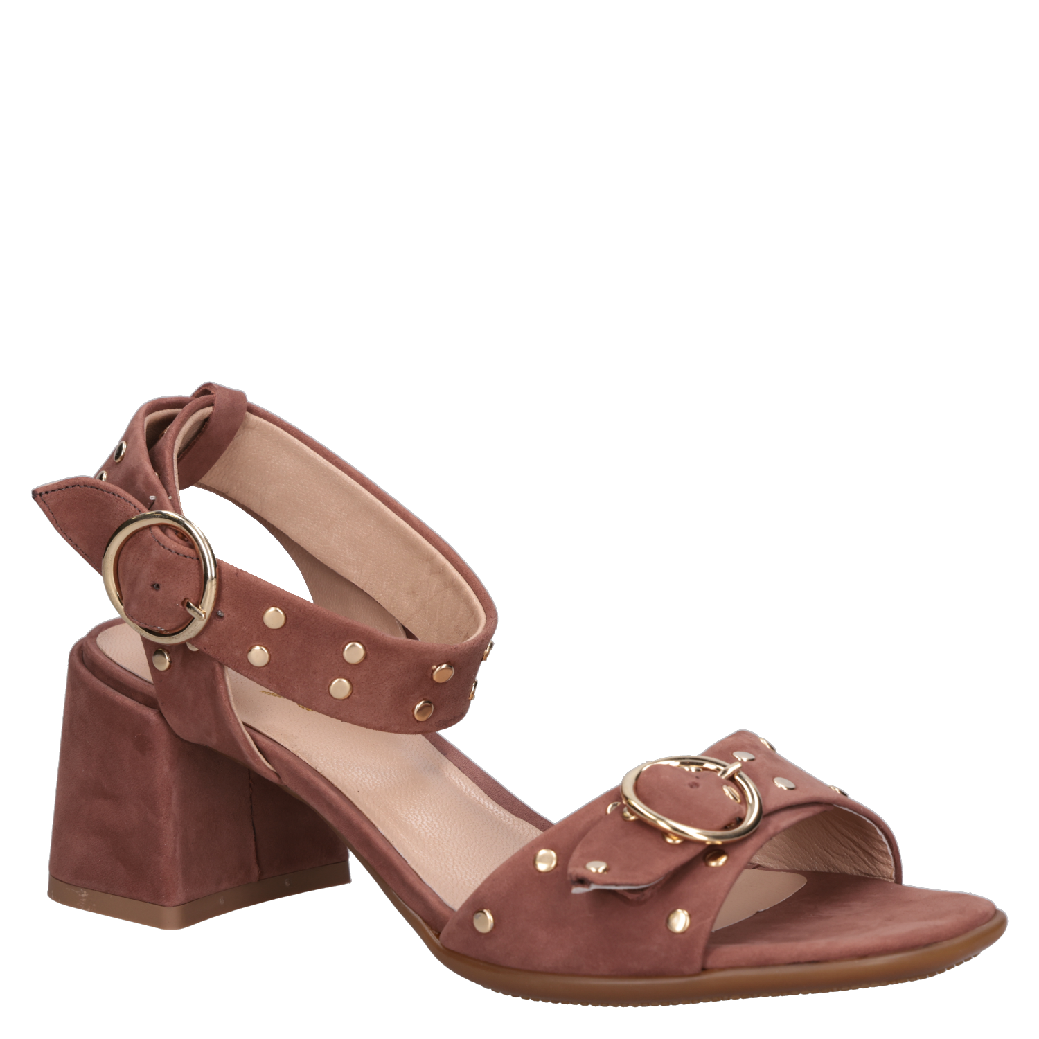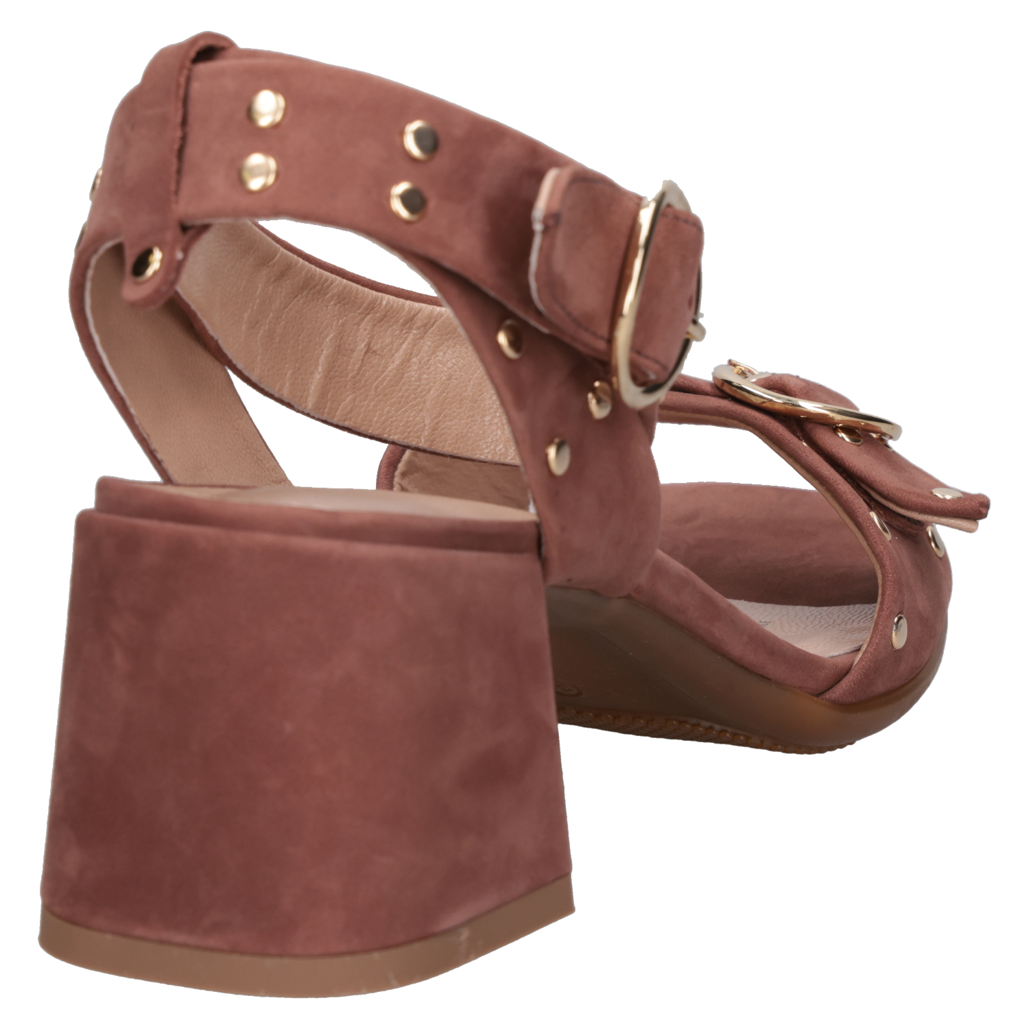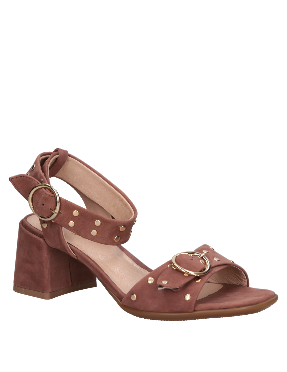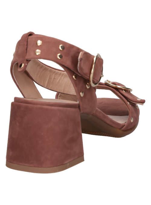 Sandalia de cuero para mujer en color café, de diseño atemporal con punta abierta y taco bloque de 5 cm que aporta estabilidad y altura moderada. La capellada y el forro en cuero entregan una sensación agradable al contacto, mientras su silueta limpia complementa looks desde lo casual a lo semi formal.