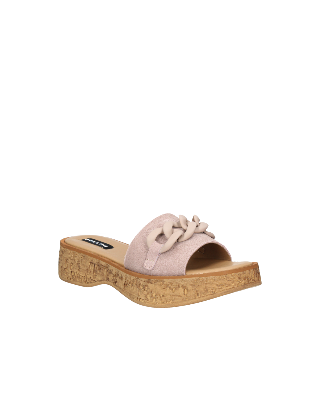 Descubre la elegancia y comodidad que ofrece la sandalia de mujer de Pollini G230, un modelo tipo mule que redefine el estilo casual chic. Esta sandalia presenta una plataforma de taco bajo de 3.5 cm que garantiza confort sin sacrificar altura. Su exterior en cuero se complementa con una tira ancha adornada con una llamativa cadena de eslabones del mismo tono, aportando un toque moderno y sofisticado. El acabado que imita el corcho en la plataforma añade un aire natural, creando un contraste perfecto con la cadena, ideal para quienes buscan destacar en cada paso.