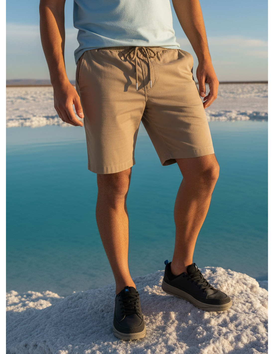 Short casual para hombre en color beige, confeccionado en 96% algodón y 4% spandex para una sensación suave con leve elasticidad. Presenta corte recto a la altura de la rodilla, pretina con trabillas para cinturón, cierre con botón y cremallera, bolsillos laterales oblicuos y bolsillos traseros. Terminación limpia y versátil para uso diario o fines de semana.
