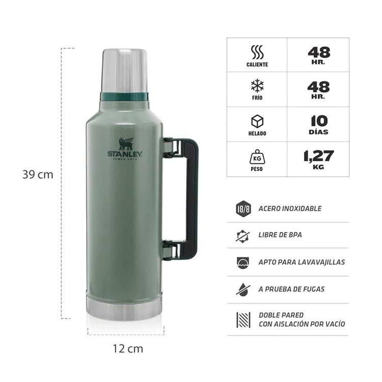 ¡El legendario termo de Stanley i989 llega para desafiar los límites! No es solo resistente y robusto, ¡es una declaración de durabilidad! Con un diseño que resalta: 14 x 11,9 x 39,6 cm es pura calidad en acero inoxidable. Equipado con aislamiento al vacío de doble pared, ¡te asegura mantener la frescura a cualquier hora del día! Y mantiene la intensidad de tus líquidos, ¡calientes y frios durante 48 horas!