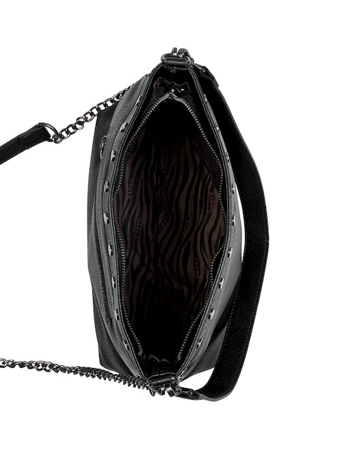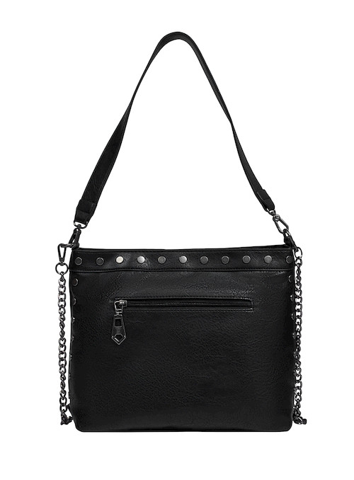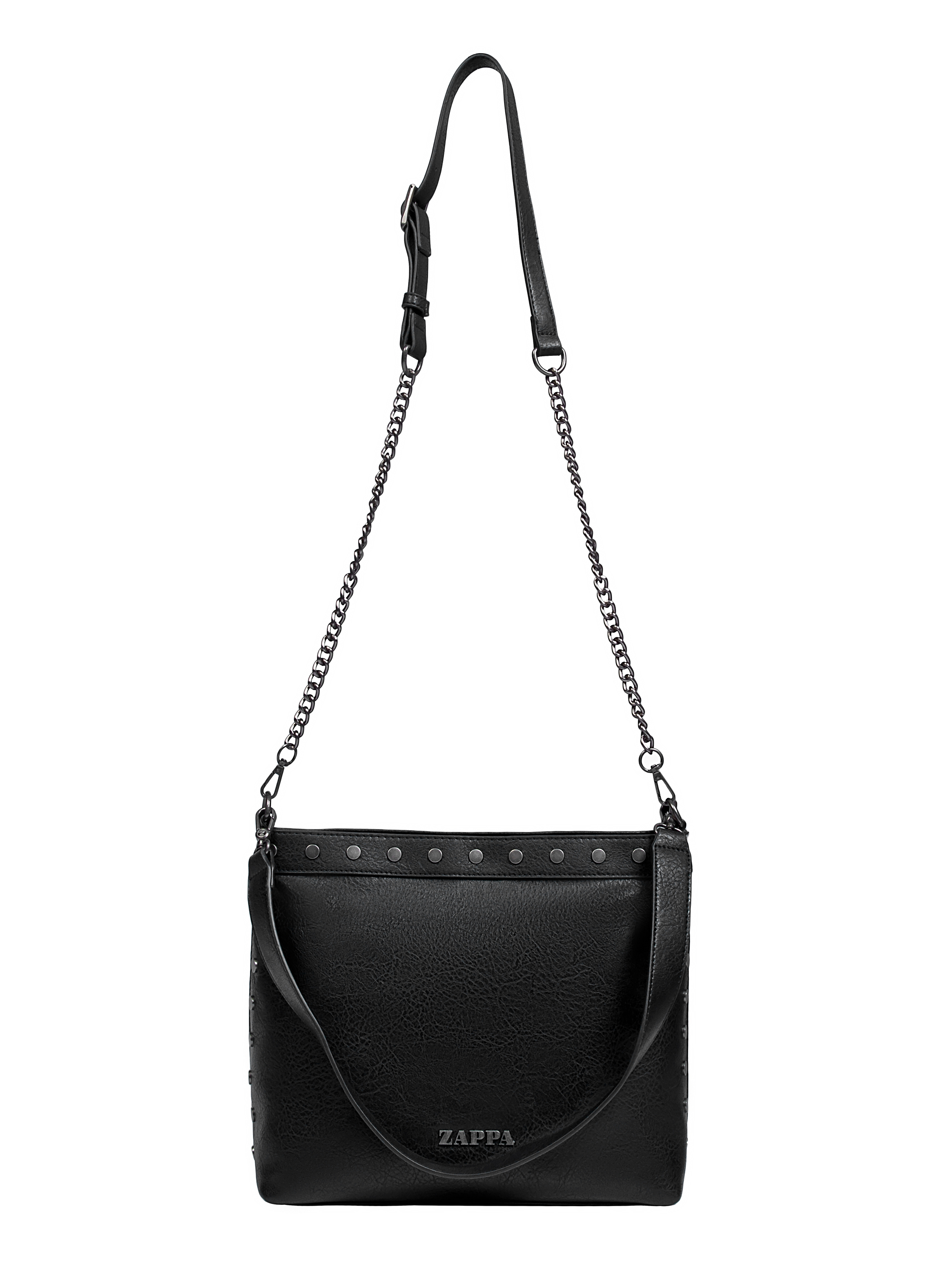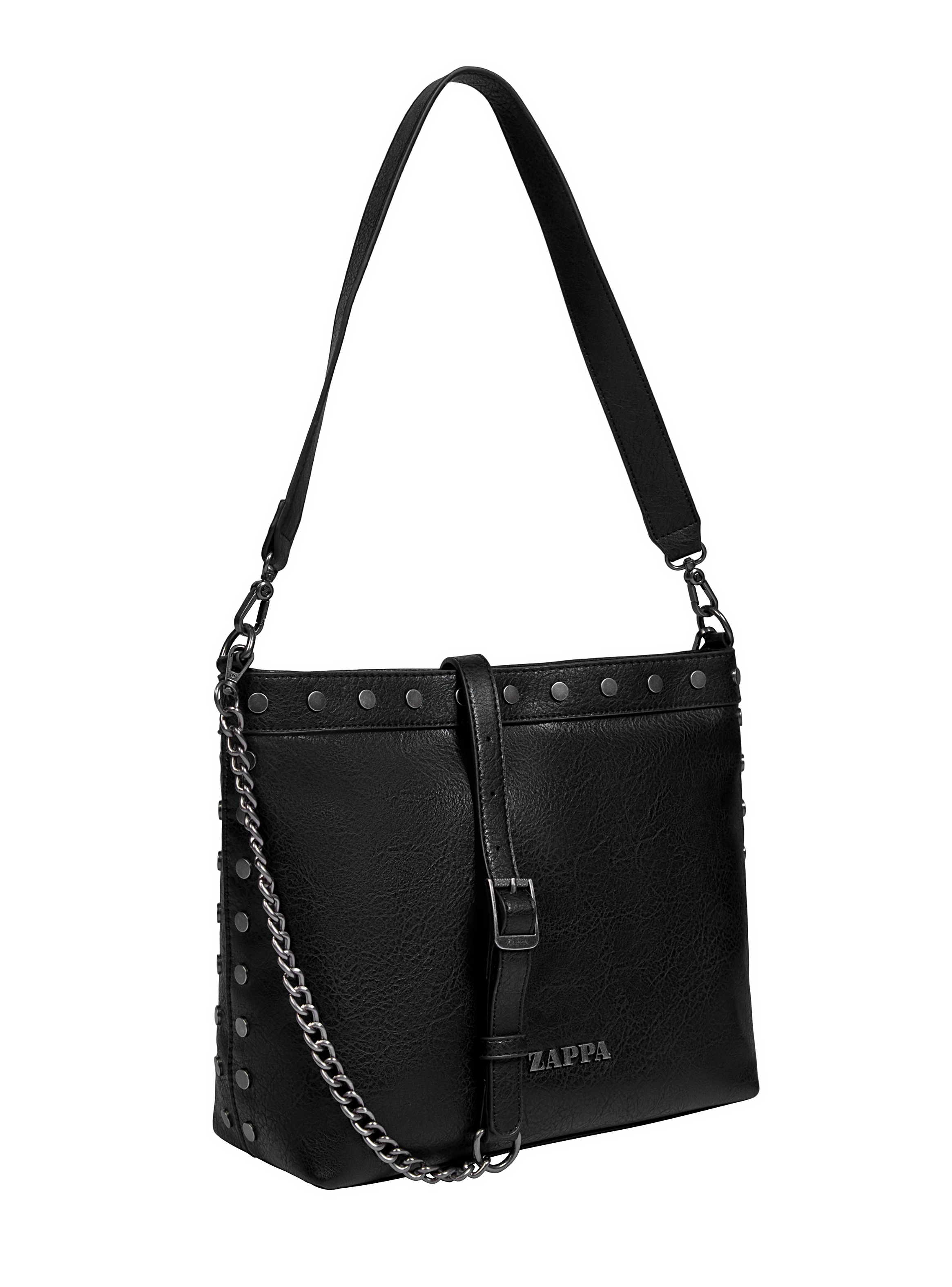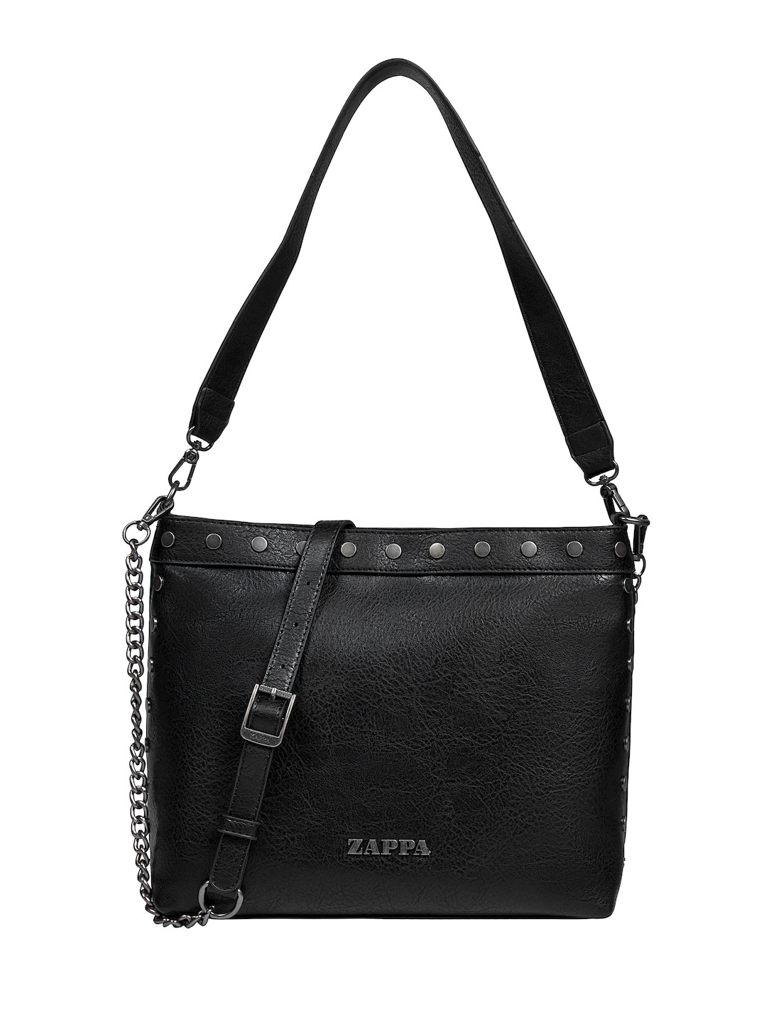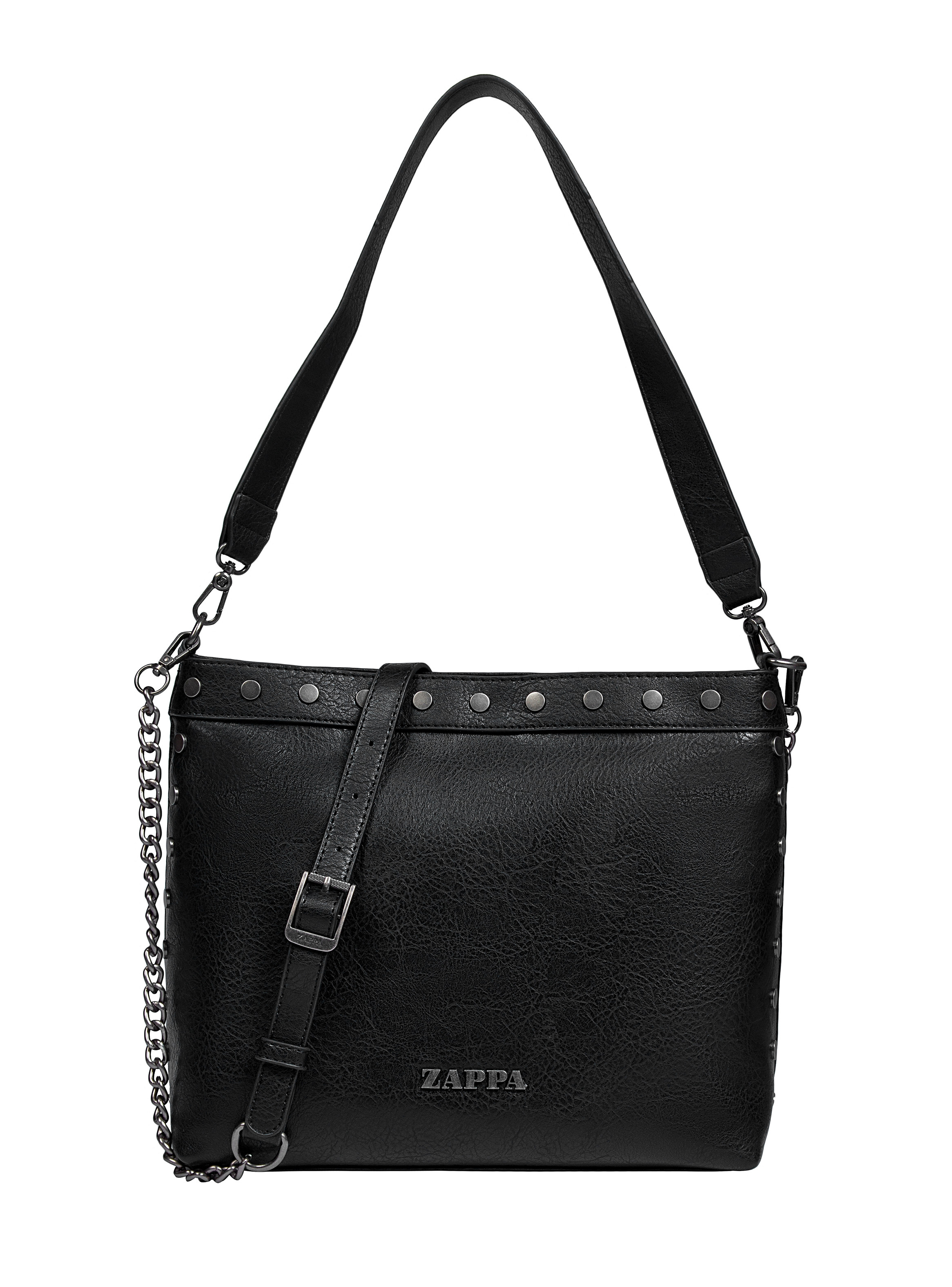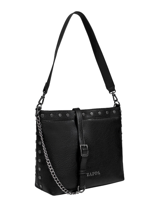 Esta Tote Bag negra de Zappa destaca por su audaz diseño y funcionalidad. Con medidas de 26 cm de alto, 33 cm de ancho y 11 cm de profundidad, y un robusto cierre metálico, es ideal para llevar lo esencial en entornos laborales o académicos. Su textura única y los detalles de tachas metálicas añaden un toque vanguardista. La correa ajustable y extraíble, combinada con una cadena metálica, ofrece versatilidad y estilo. Lleva contigo la esencia de Zappa, donde cada detalle cuenta.