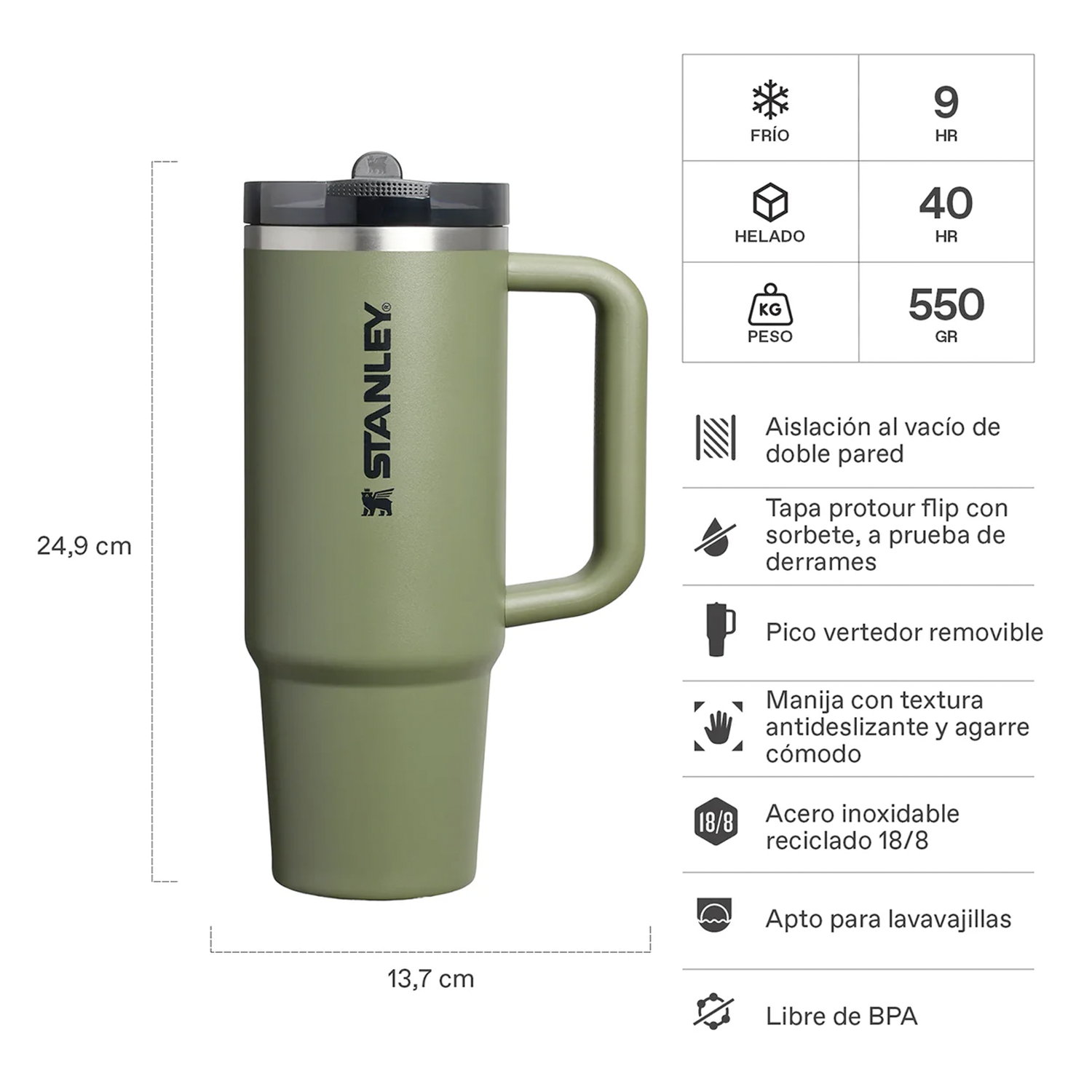 Mantente hidratado con el Quencher Protour Toast 887 ml, una versión renovada del clásico vaso Stanley. Fabricado en acero inoxidable reciclado con aislamiento al vacío de doble pared, conserva tus bebidas frías por 9 horas y con hielo hasta 40. Su tapa hermética Flip Straw y su mango texturizado ofrecen practicidad y comodidad en cada uso, ideal para llevar contigo a cualquier lugar.