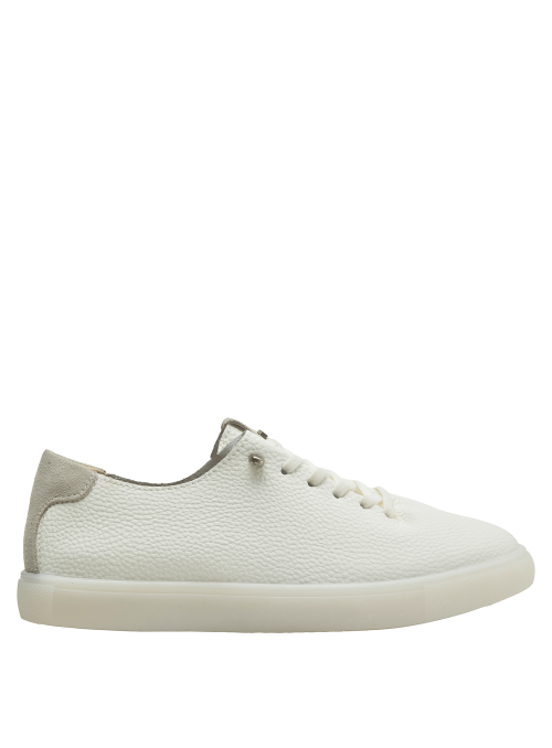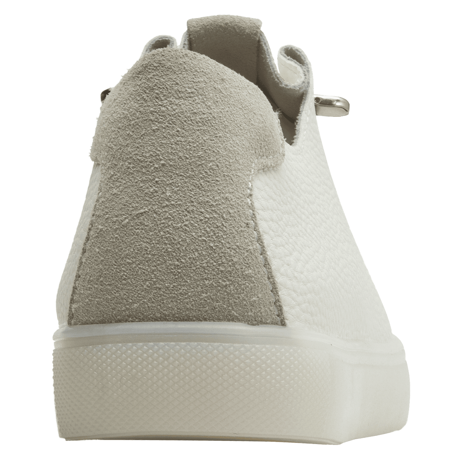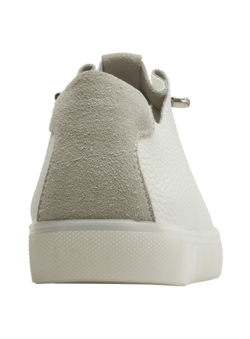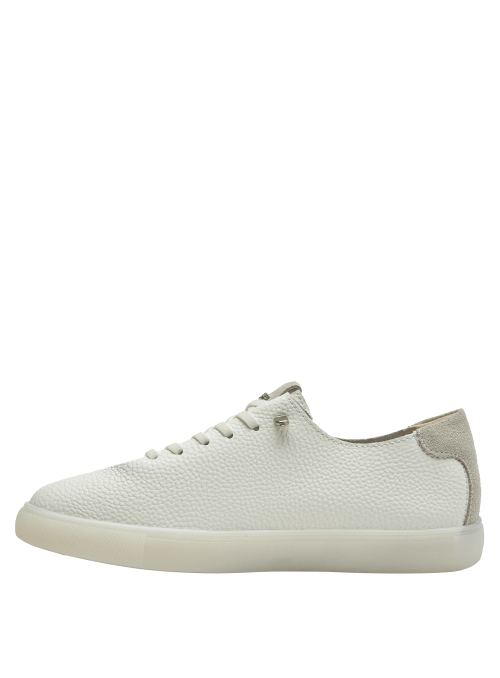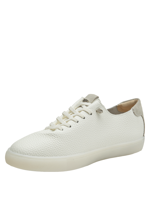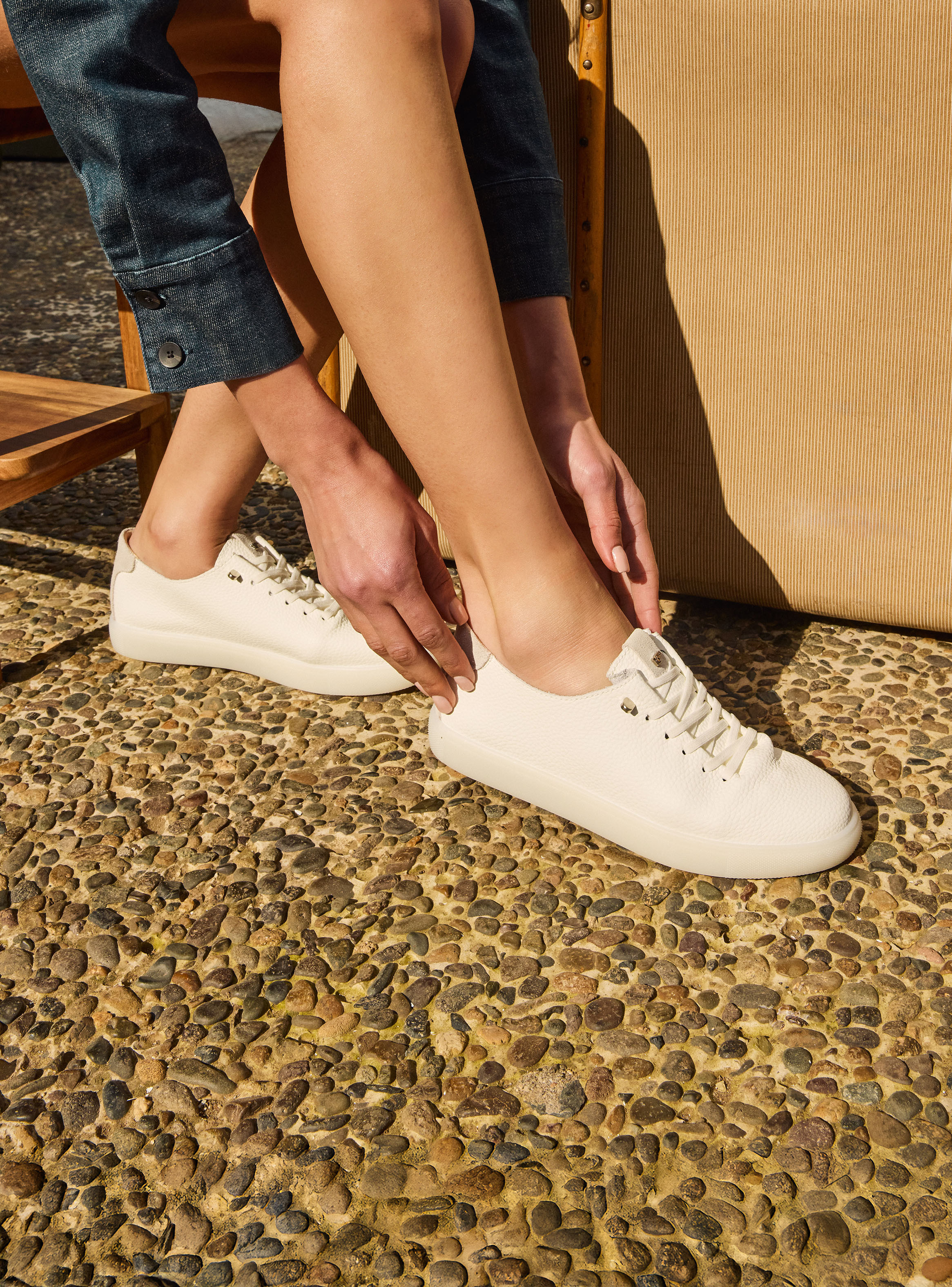 La Zapatilla de mujer de 16 HRS destaca por su exterior de cuero con textura granulada, ofreciendo un diseño elegante y sofisticado. El blanco marfil predomina, aportando versatilidad, mientras los detalles en gris claro en el talón añaden un contraste sutil. Con un taco bajo de 2 cm, estas zapatillas combinan estilo y comodidad.