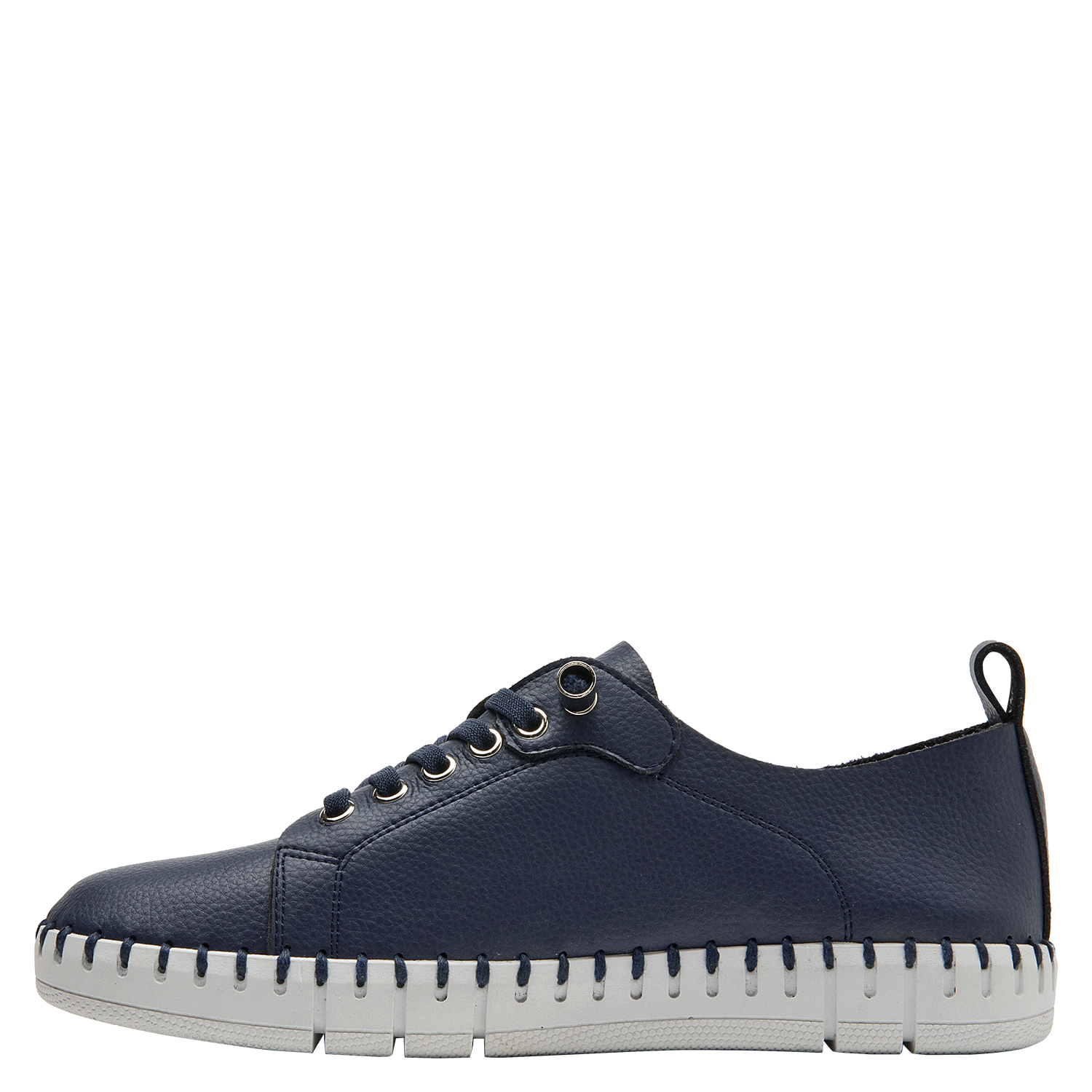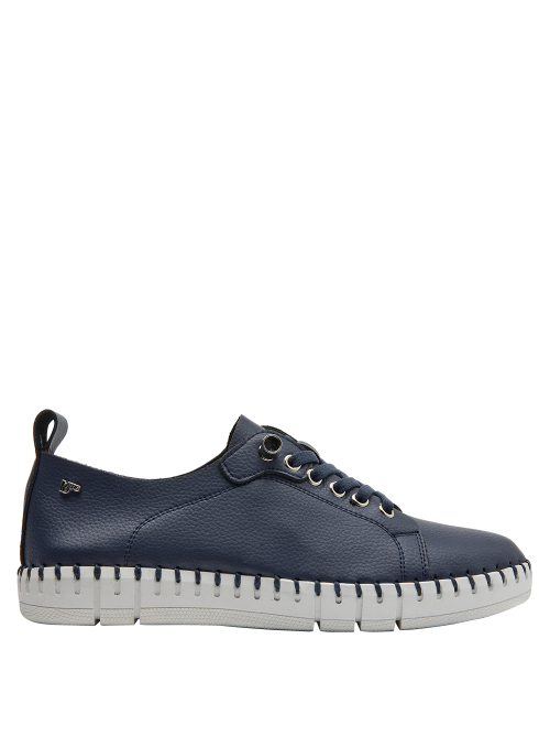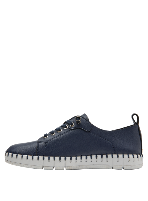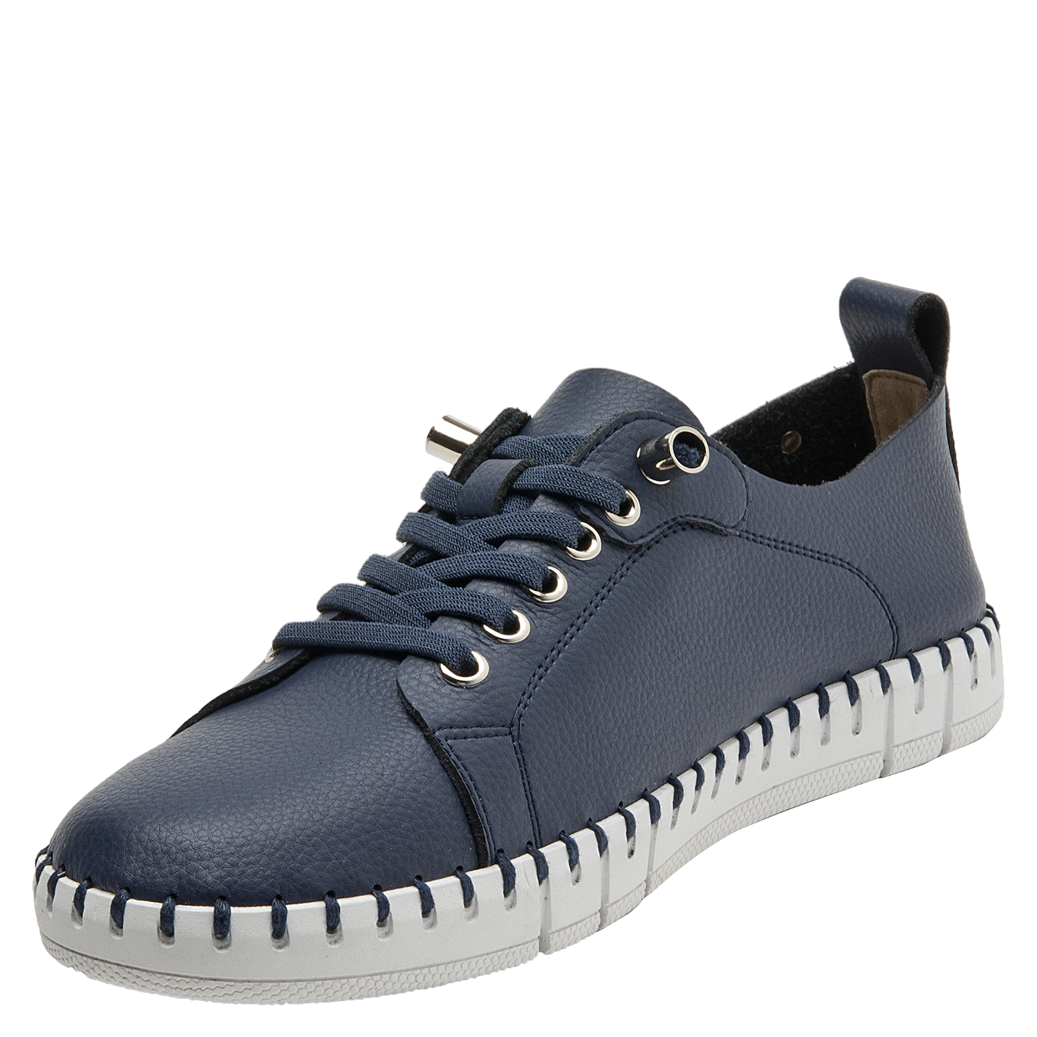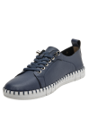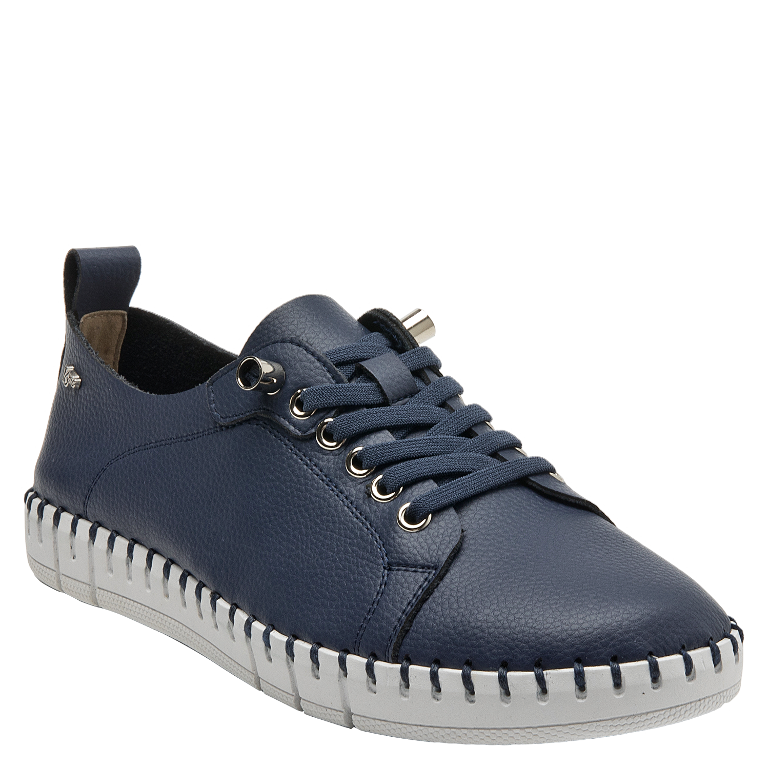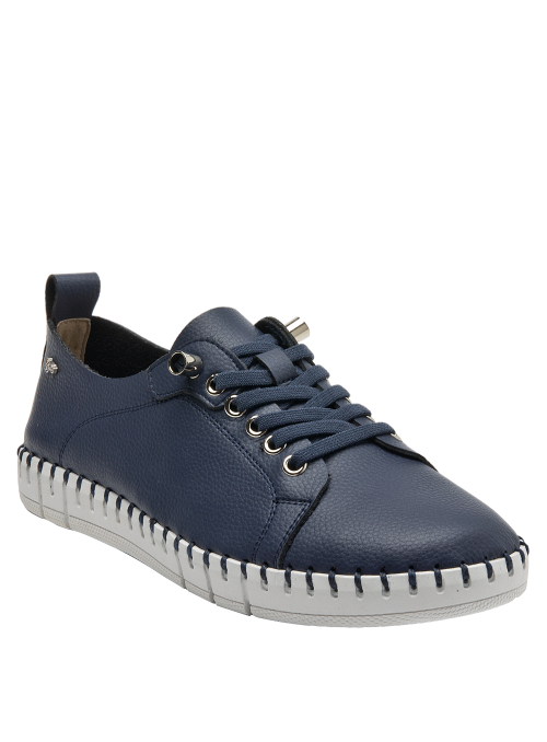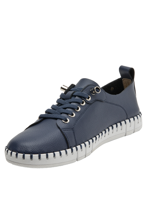 Zapato casual de cuero para mujer en color azul, de punta redonda y taco plano de 2 cm. Su capellada lisa aporta un look limpio y versátil, mientras el forro de microfibra brinda una sensación suave al contacto. La horma clásica y la altura baja favorecen un uso diario cómodo, ideal para quienes buscan un calzado práctico con estética depurada.