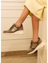 La Zapatilla Cuña en color café de Bruno Rossi es la elección perfecta para un estilo funcional y actual. Con una altura de taco de 5.5 cm y una punta puntiaguda, combina un acabado sintético brillante con detalles en gamuza, proporcionando un look sofisticado y versátil. La cremallera lateral no solo aporta un toque moderno, sino que facilita el calzado. Combínala con jeans ajustados y una blusa fluida o con una falda midi para lograr un estilo equilibrado y elegante en cualquier ocasión.