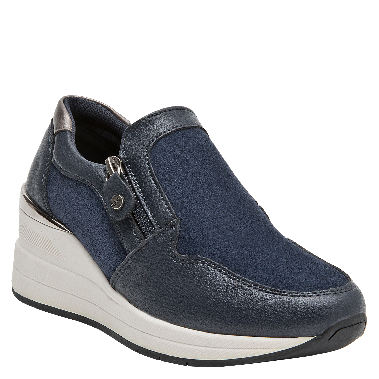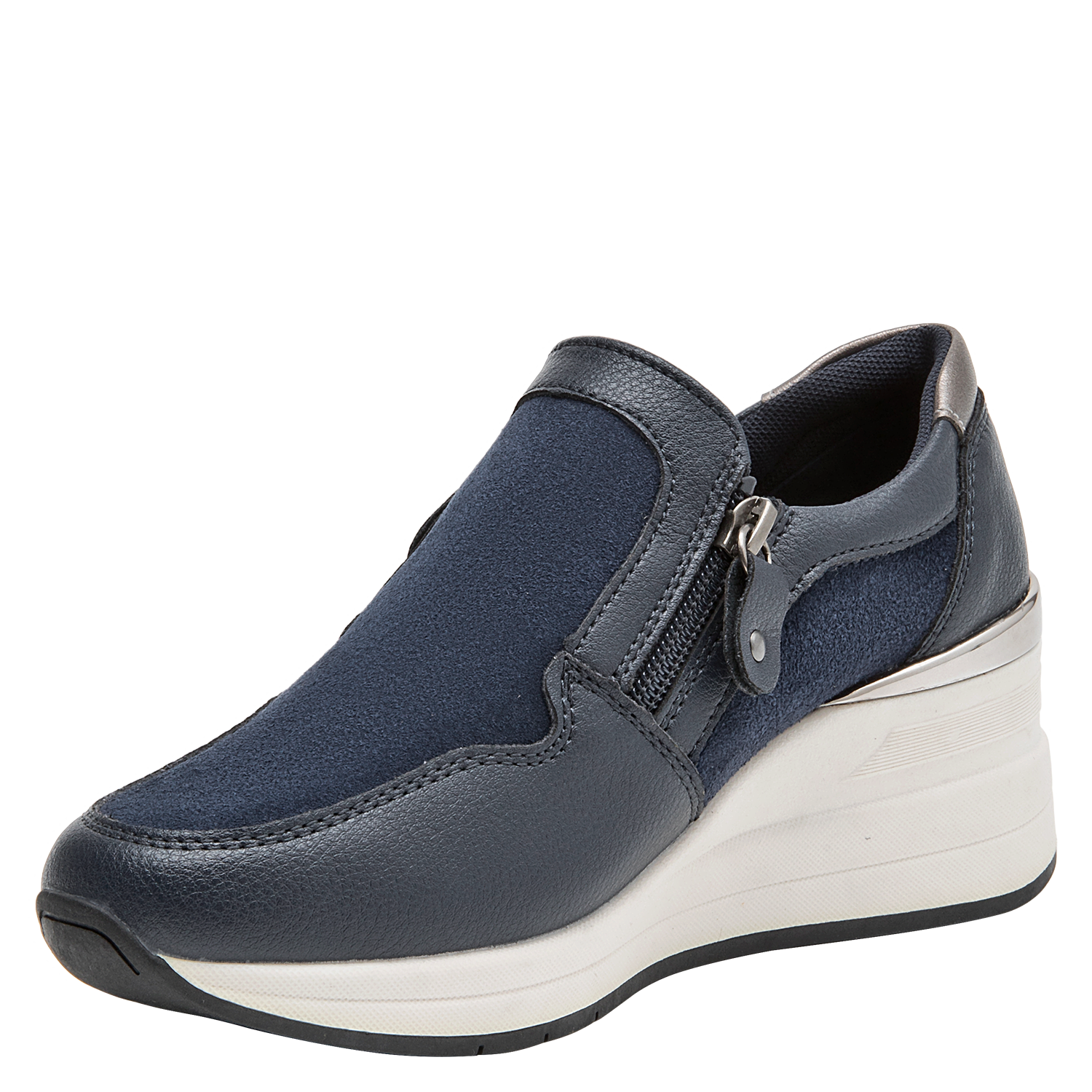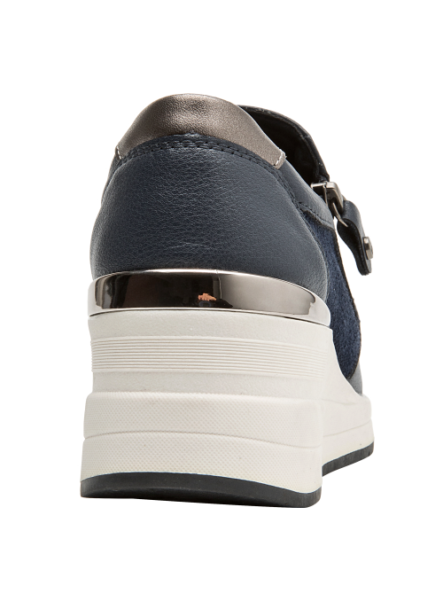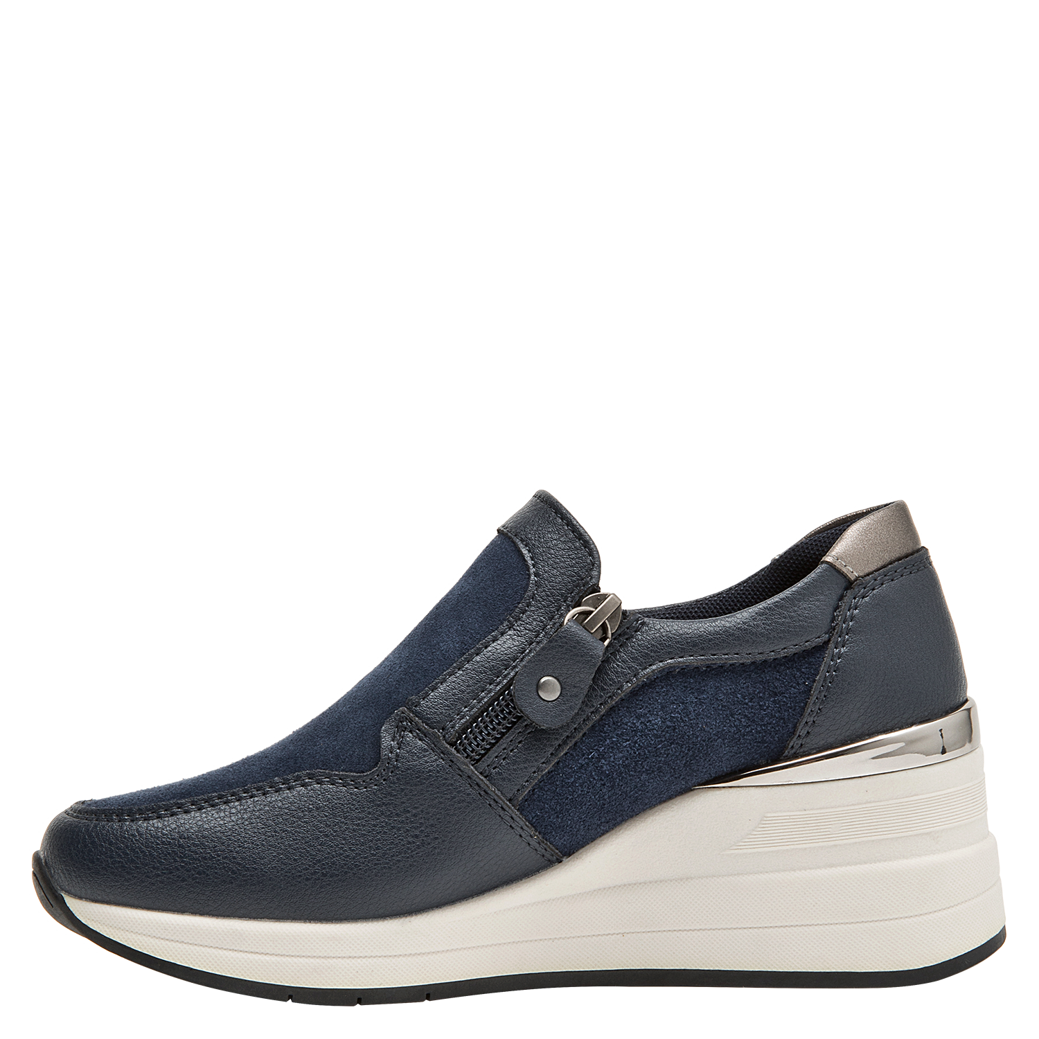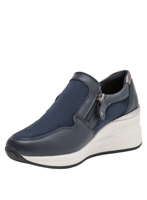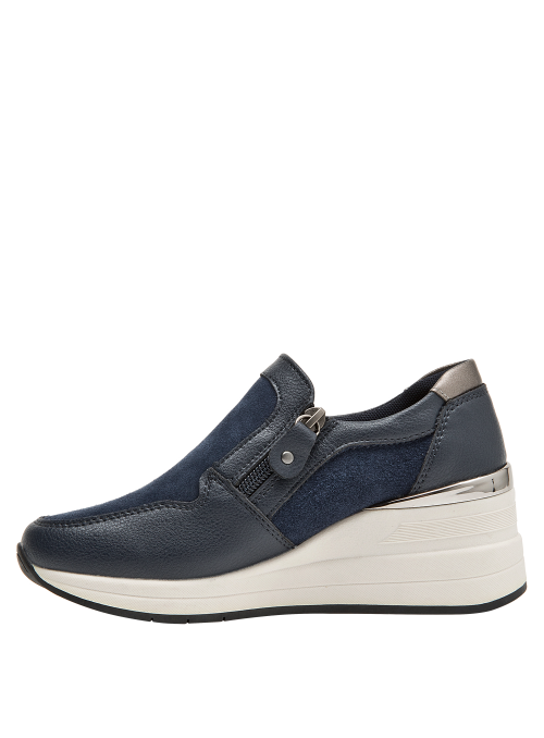 Zapatilla de cuero con taco cuña para mujer en color azul, de punta puntiaguda y acabado limpio. El tacón cuña de 5.5 cm aporta una elevación sutil y equilibrada, mientras el forro sintético/textil acompaña la estructura del upper. Silueta estilizada y diseño sobrio, pensado para acompañar diferentes momentos del día.