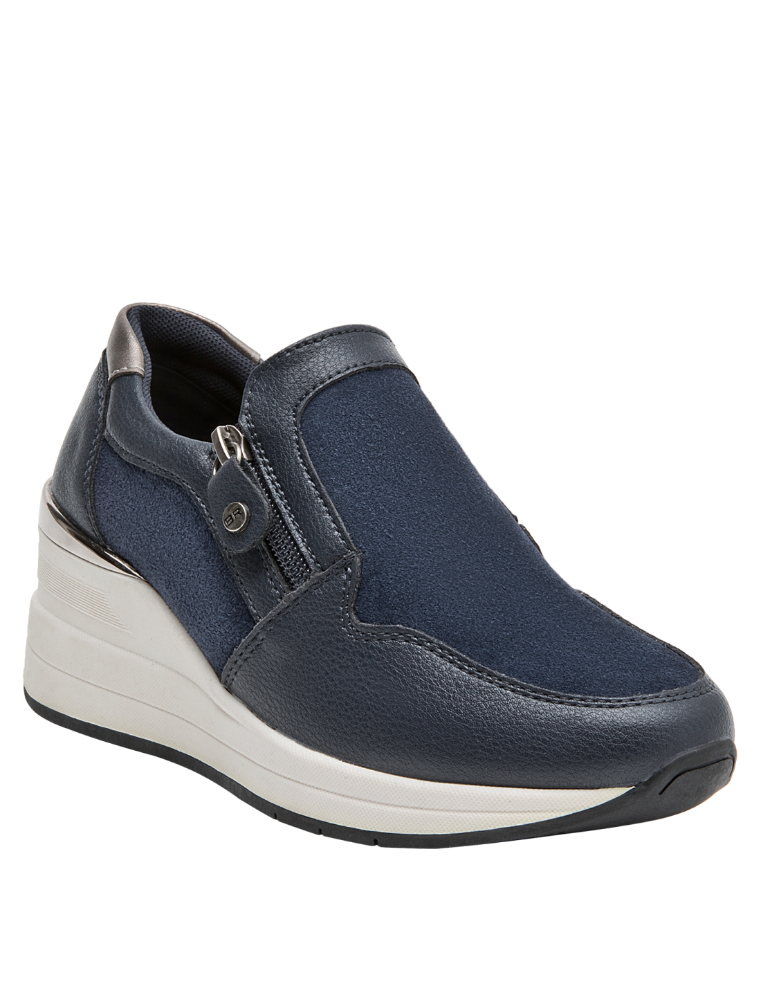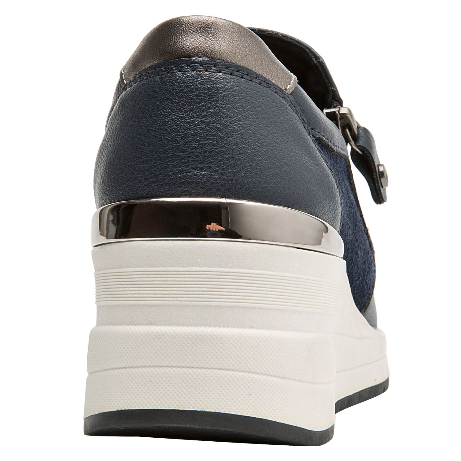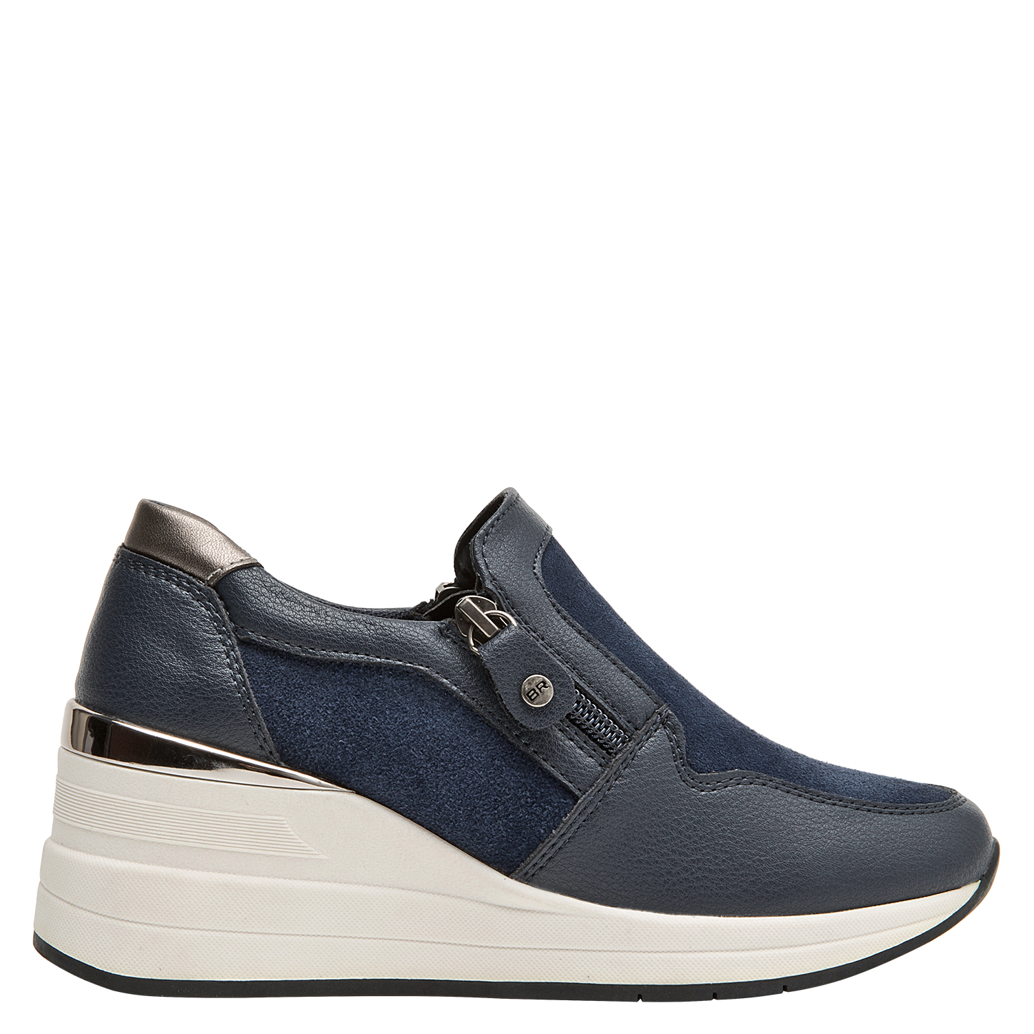 Zapatilla de cuero con taco cuña para mujer en color azul, de punta puntiaguda y acabado limpio. El tacón cuña de 5.5 cm aporta una elevación sutil y equilibrada, mientras el forro sintético/textil acompaña la estructura del upper. Silueta estilizada y diseño sobrio, pensado para acompañar diferentes momentos del día.