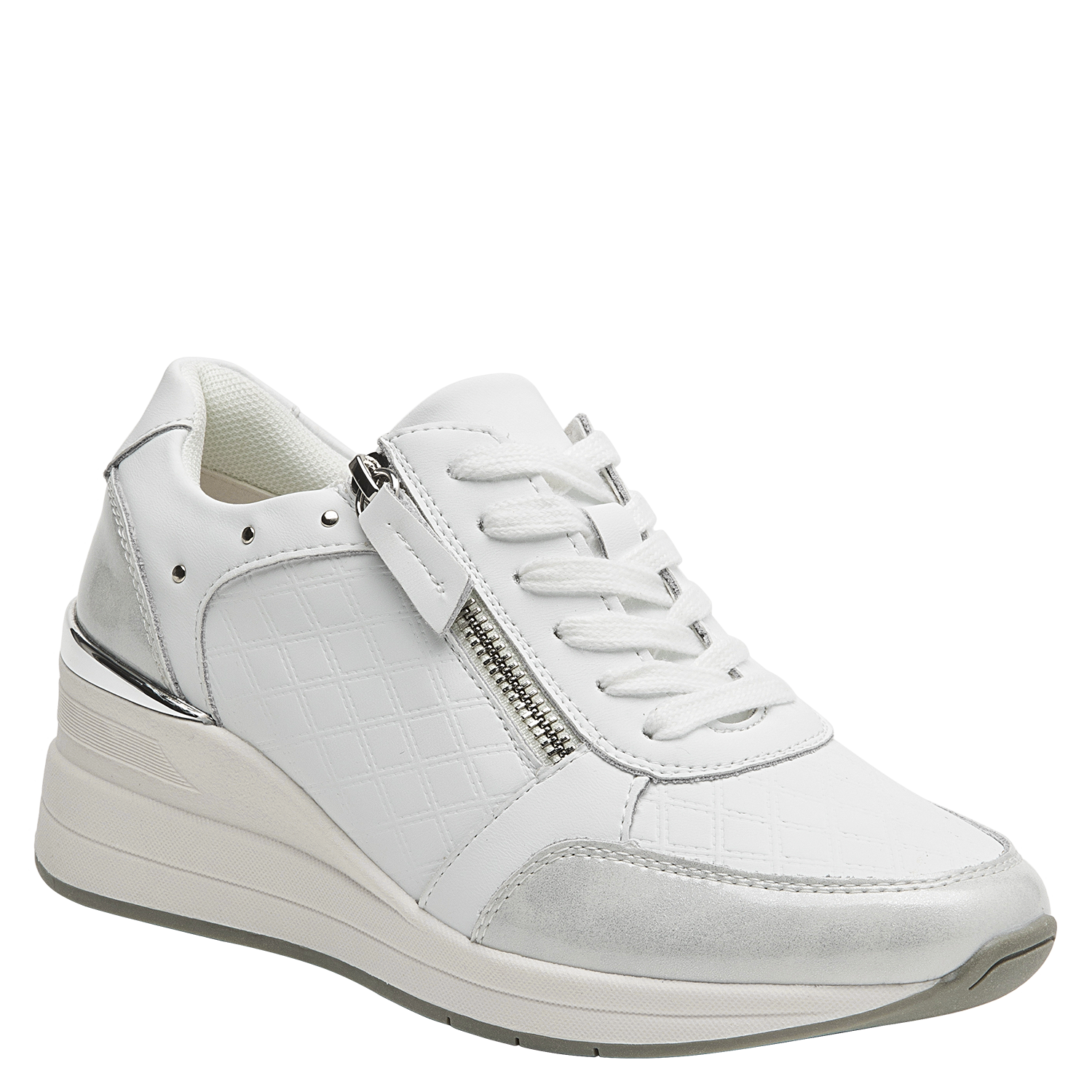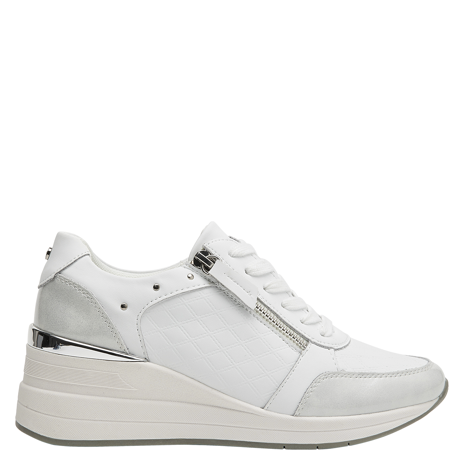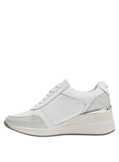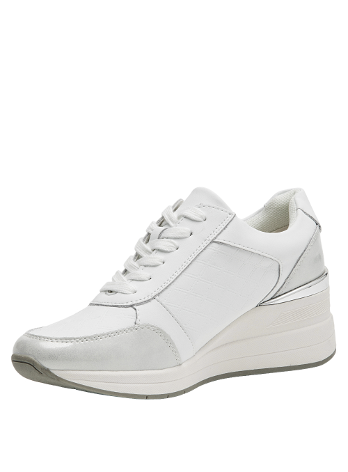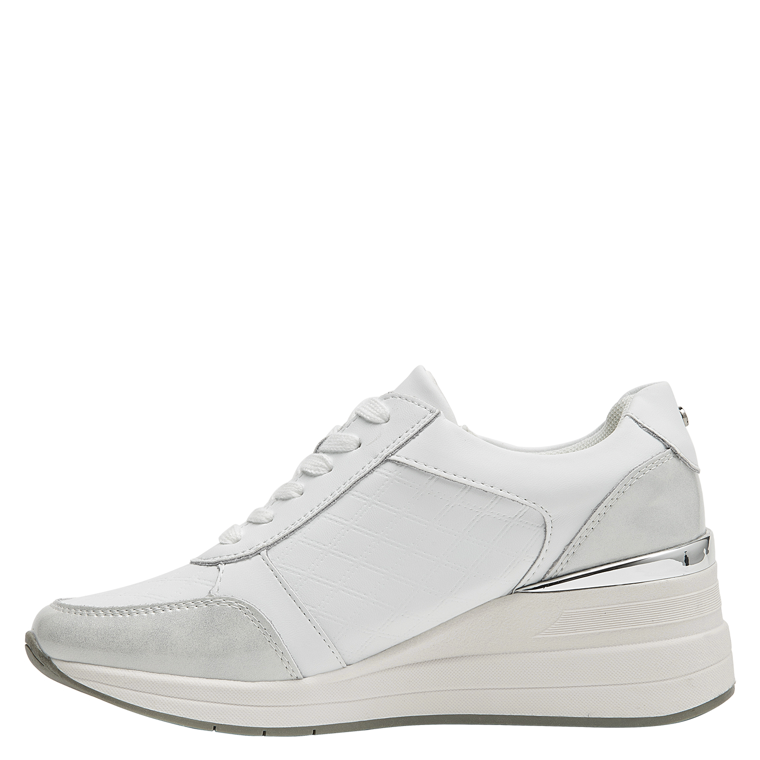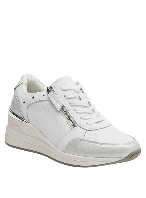 Zapatilla de cuña para mujer en cuero blanco, de perfil limpio y contemporáneo. Incorpora punta puntiaguda y un taco de cuña de 5,5 cm que estiliza la silueta sin perder estabilidad. El forro mixto sintético/textil acompaña la estructura del empeine, mientras los acabados minimalistas realzan su versatilidad para el día a día y ocasiones semiformales.