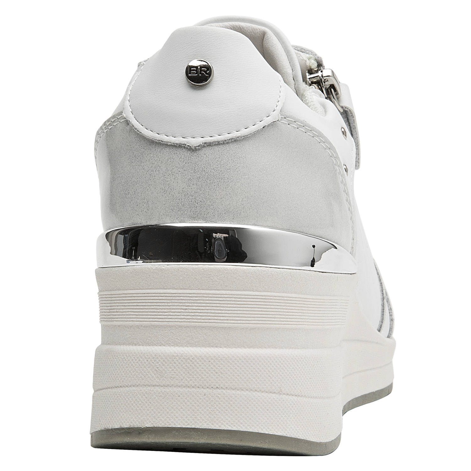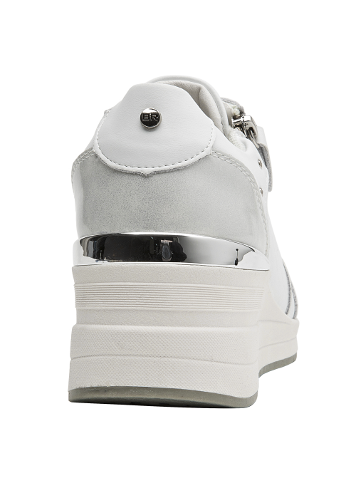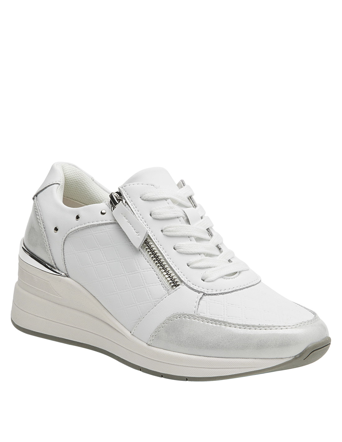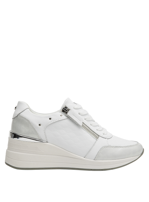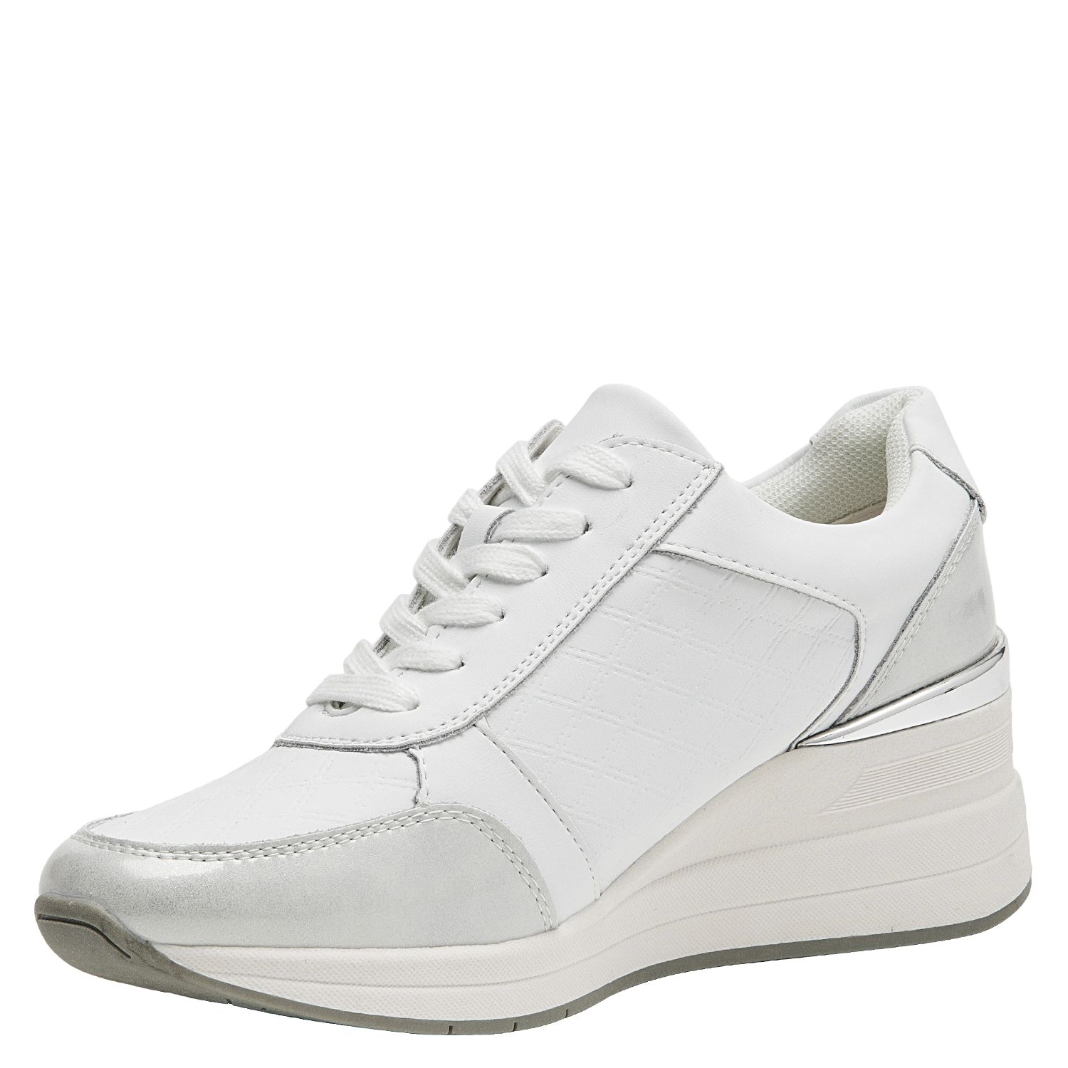 Zapatilla de cuña para mujer en cuero blanco, de perfil limpio y contemporáneo. Incorpora punta puntiaguda y un taco de cuña de 5,5 cm que estiliza la silueta sin perder estabilidad. El forro mixto sintético/textil acompaña la estructura del empeine, mientras los acabados minimalistas realzan su versatilidad para el día a día y ocasiones semiformales.