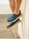 Los mocasines de hombre de 16 HRS destaca por su diseño slip-on, permitiendo un calce fácil y sin esfuerzo. Confeccionada en textil, ofrece una textura resistente y cómoda, ideal para el uso diario. Su color azul profundo y el parche de cuero café en el talón aportan un toque clásico y versátil, mientras que la suela beige con textura moteada asegura tracción y confort.