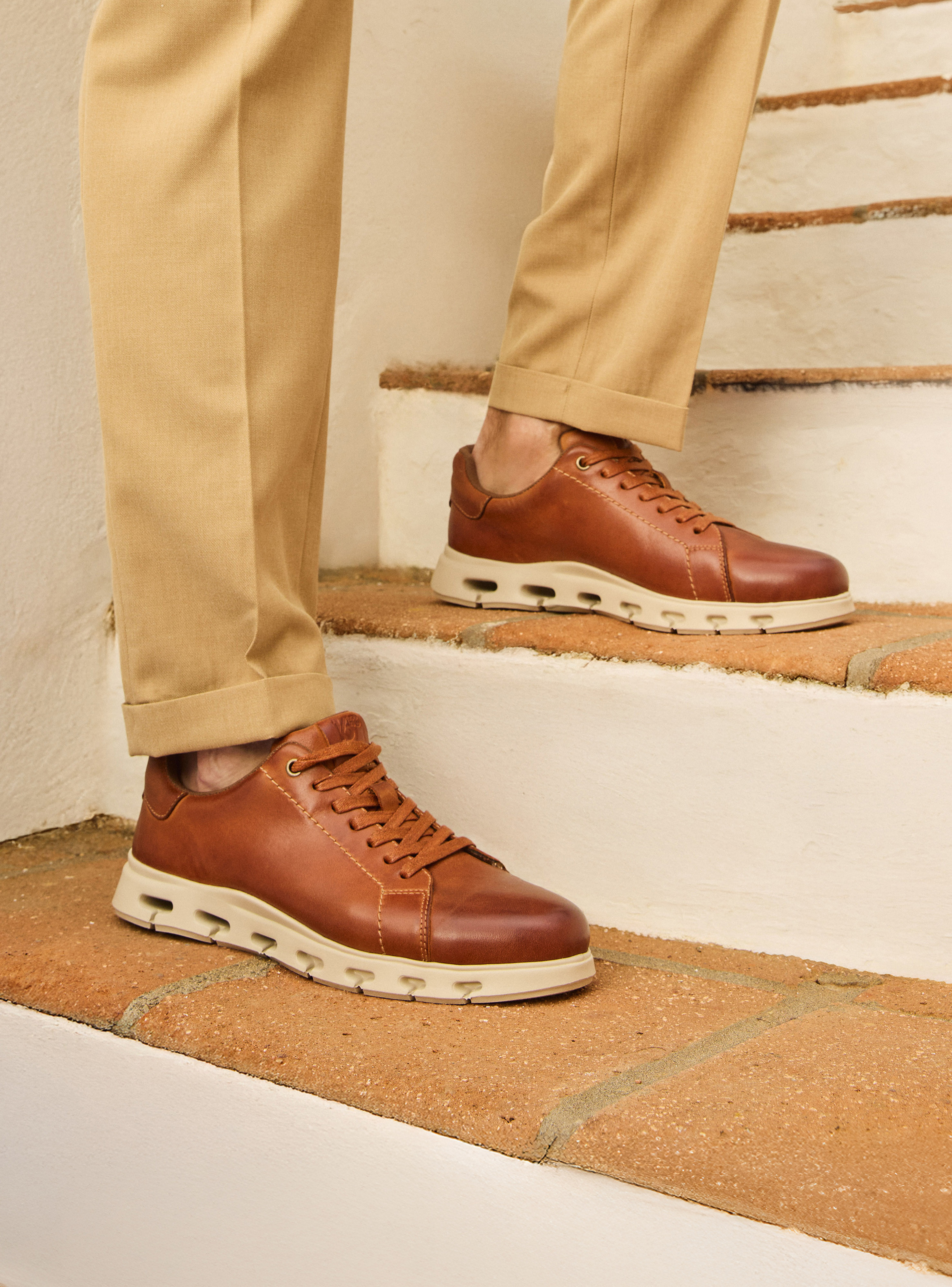 Descubre la sofisticación del Zapato de hombre de 16 HRS, diseñado para el estilo urbano y relajado. Con un exterior de cuero café, este zapato ofrece un acabado elegante y duradero. Las costuras visibles y la suela crema contrastante añaden un toque moderno que eleva tu look casual chic.