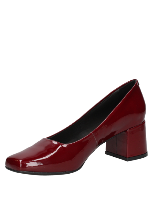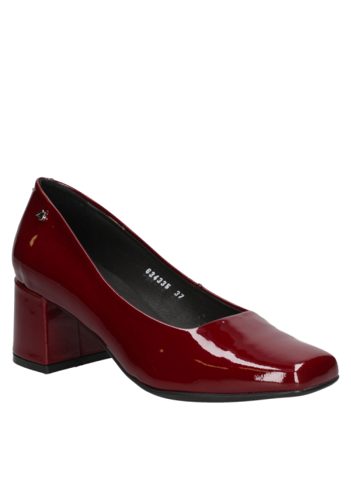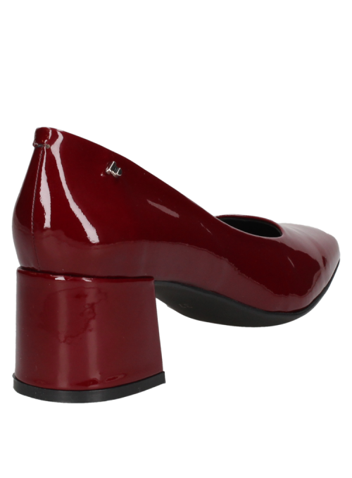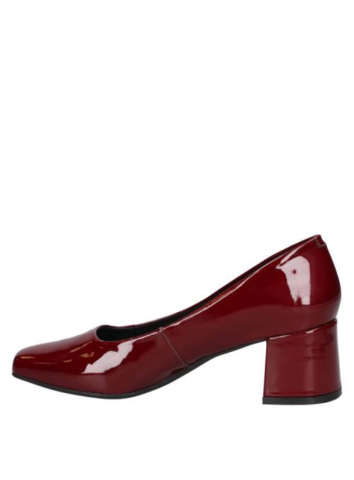 Zapato de mujer burdeo en charol de cuero, diseño clásico y elegante con taco grueso, ideal para eventos formales.