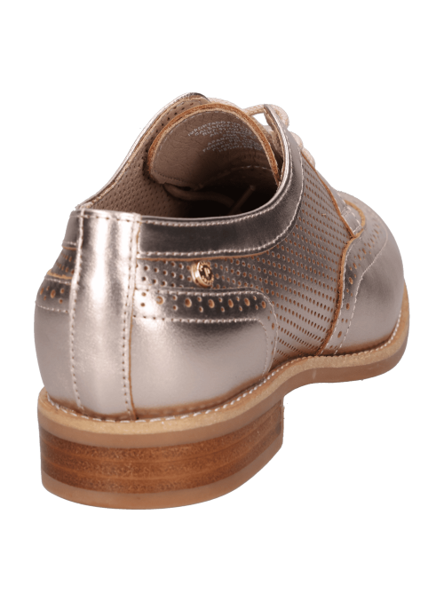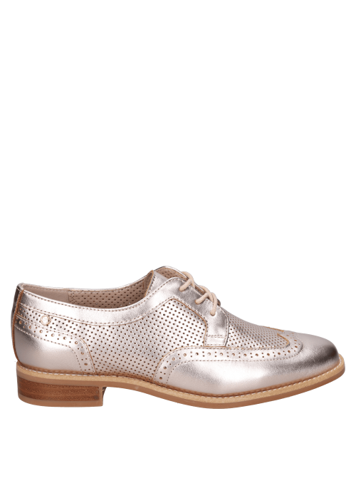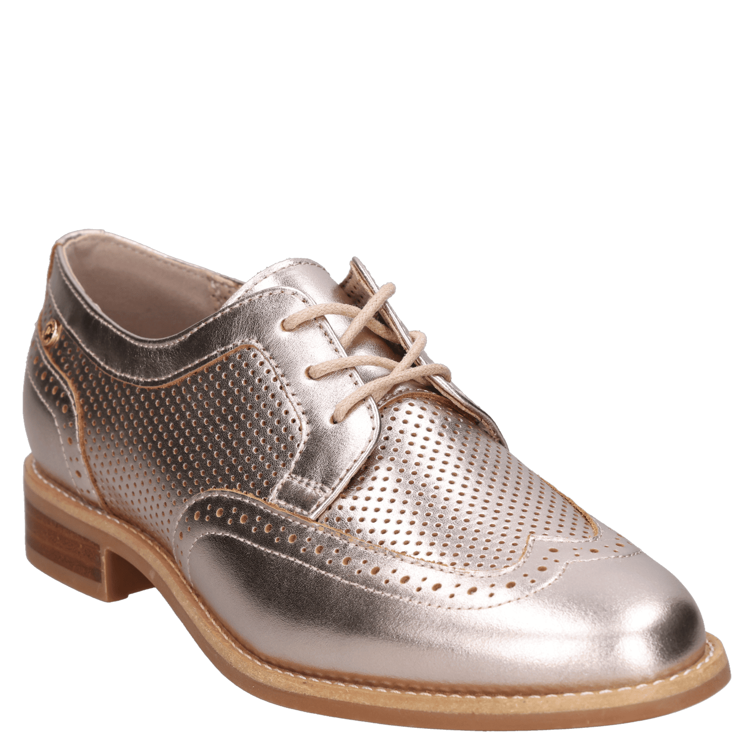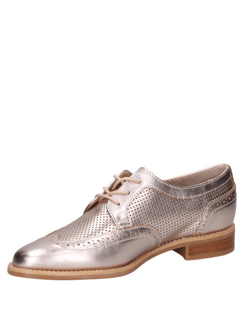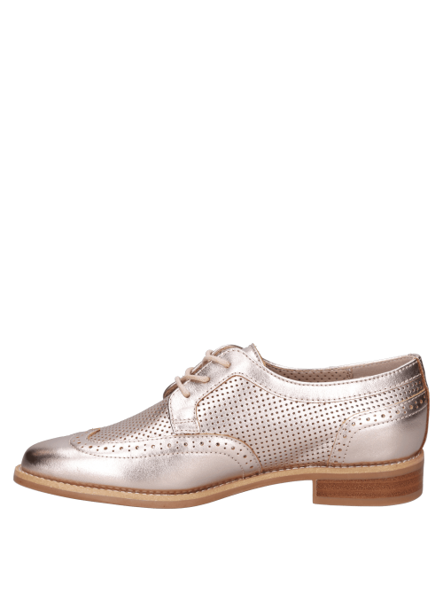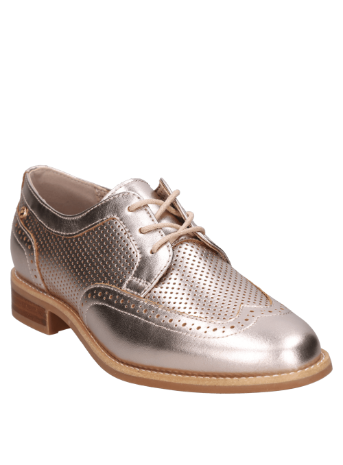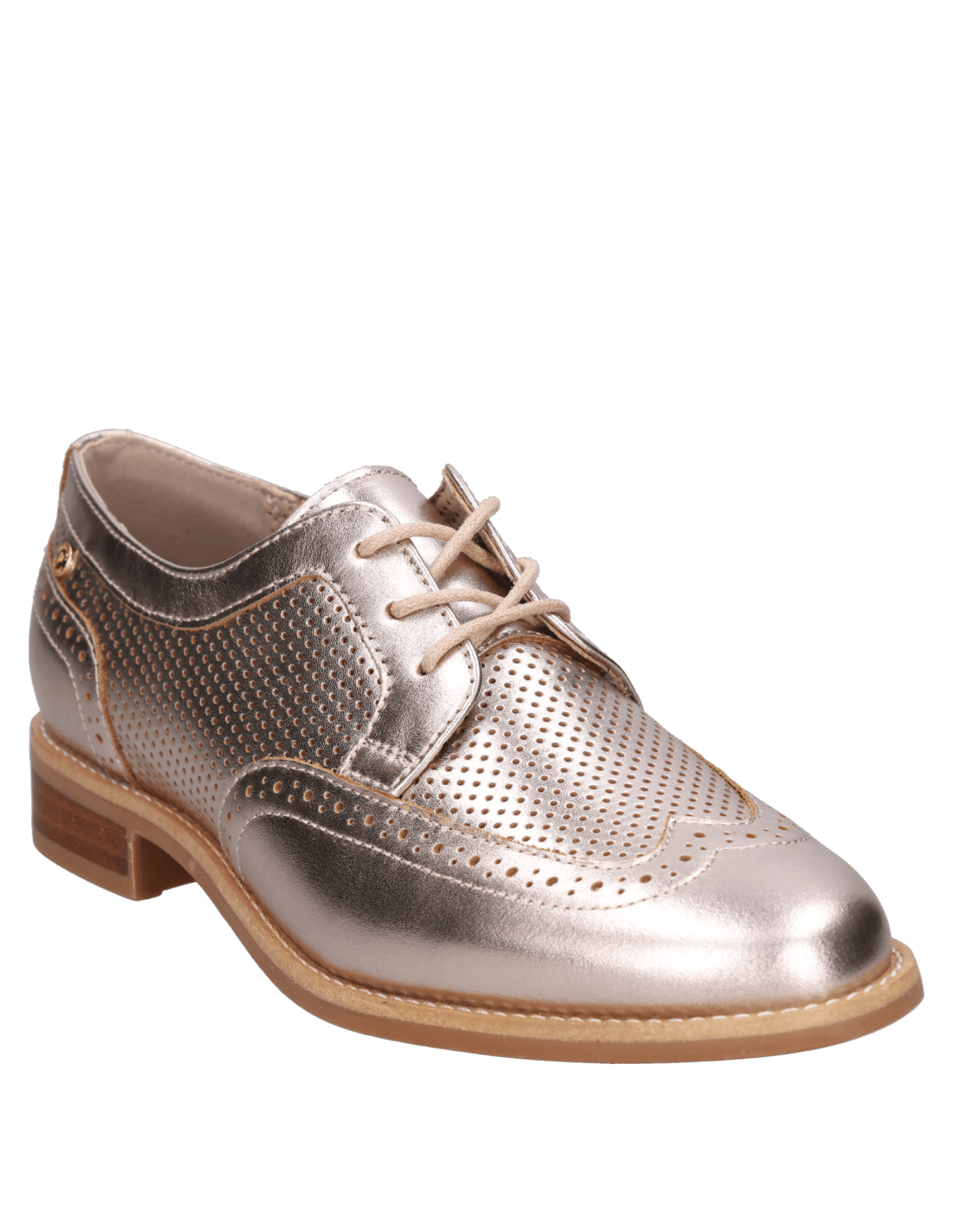 El zapato oxford de mujer de Pollini se destaca por su diseño tipo oxford, elaborado en cuero dorado metálico que aporta elegancia y sofisticación. Los perforados estilo brogue añaden un toque decorativo único. Su taco bajo de 3 cm y su suela de goma beige aseguran comodidad sin sacrificar estilo.
