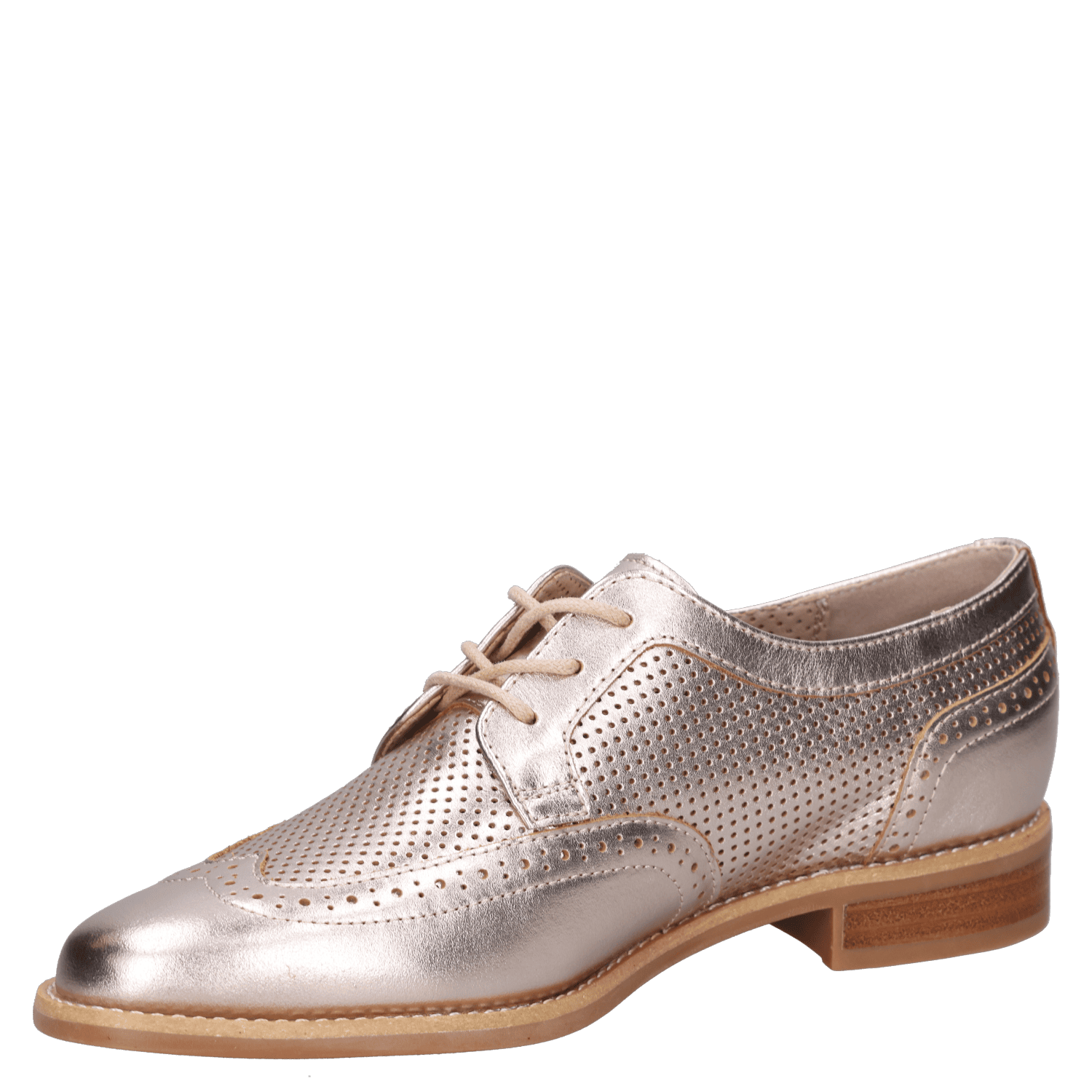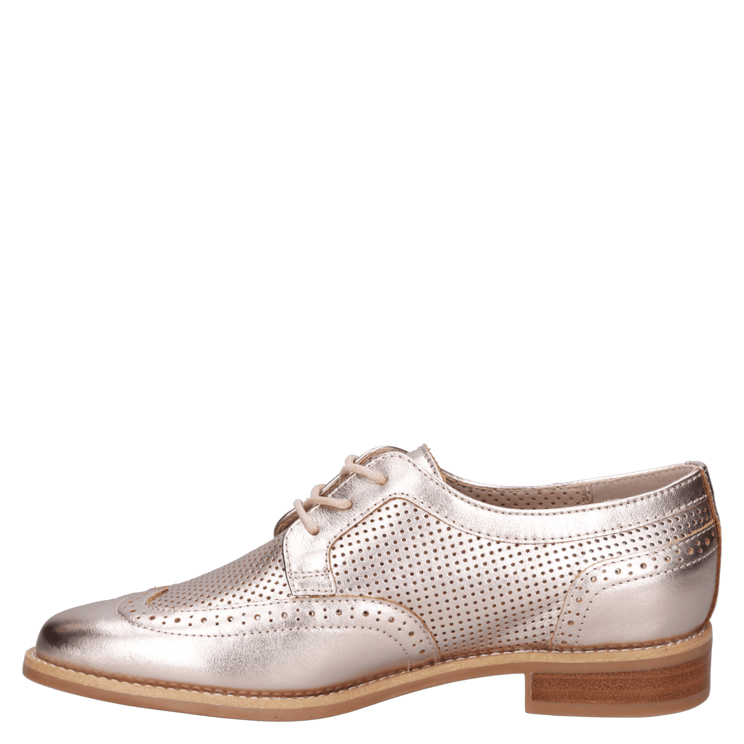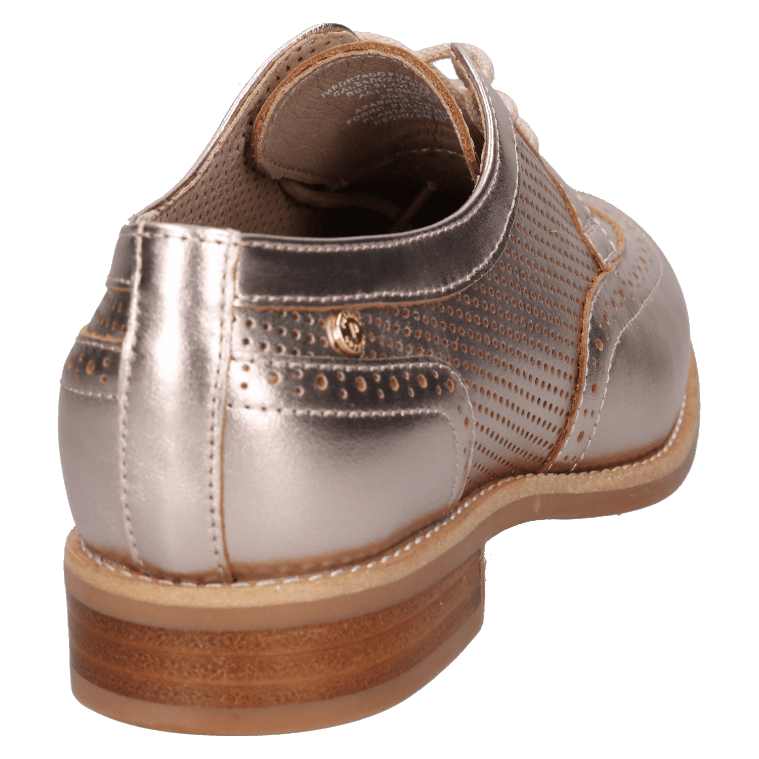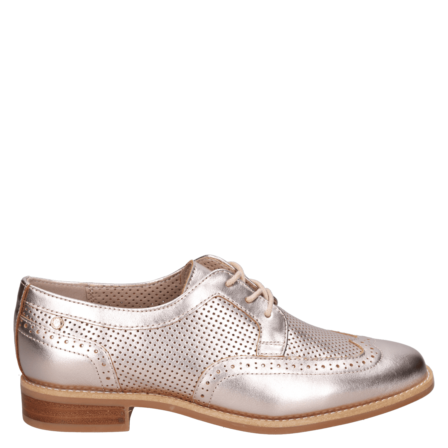 El zapato oxford de mujer de Pollini se destaca por su diseño tipo oxford, elaborado en cuero dorado metálico que aporta elegancia y sofisticación. Los perforados estilo brogue añaden un toque decorativo único. Su taco bajo de 3 cm y su suela de goma beige aseguran comodidad sin sacrificar estilo.
