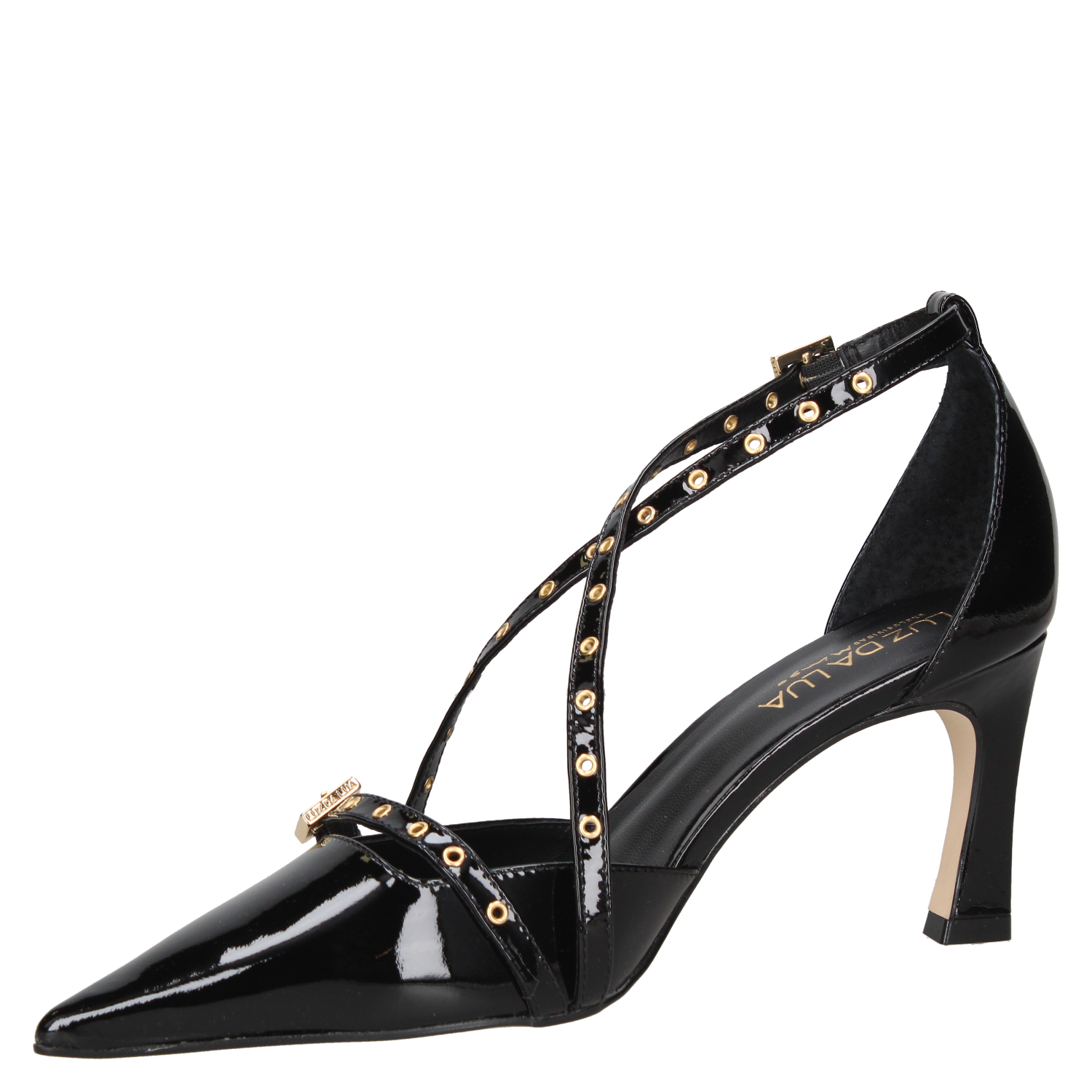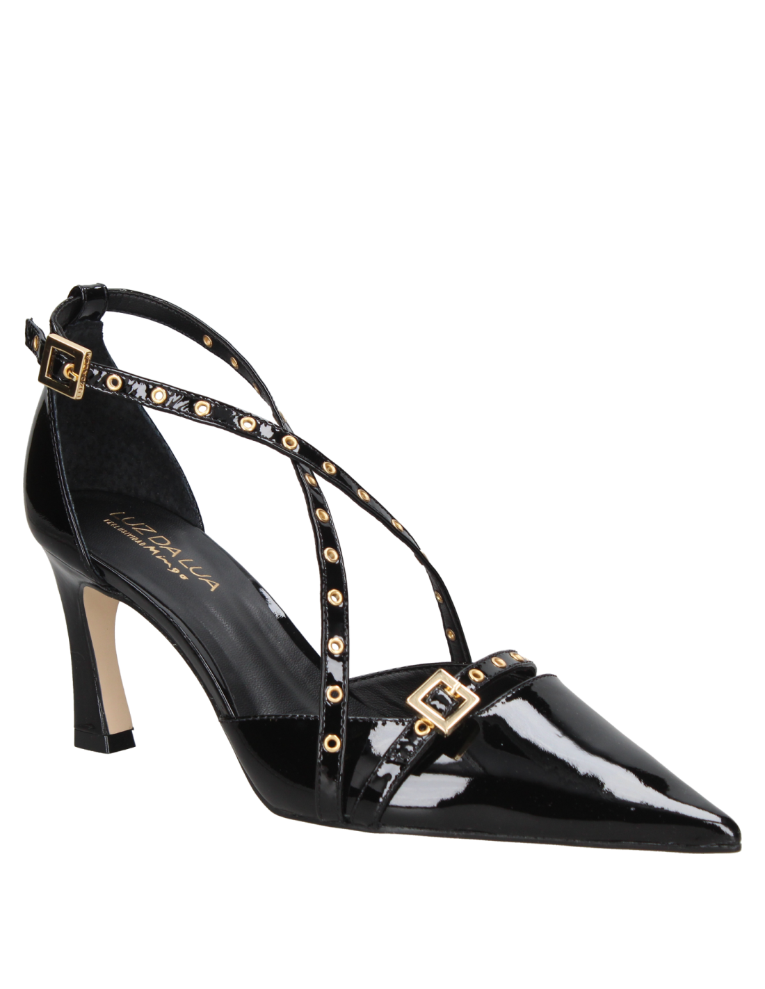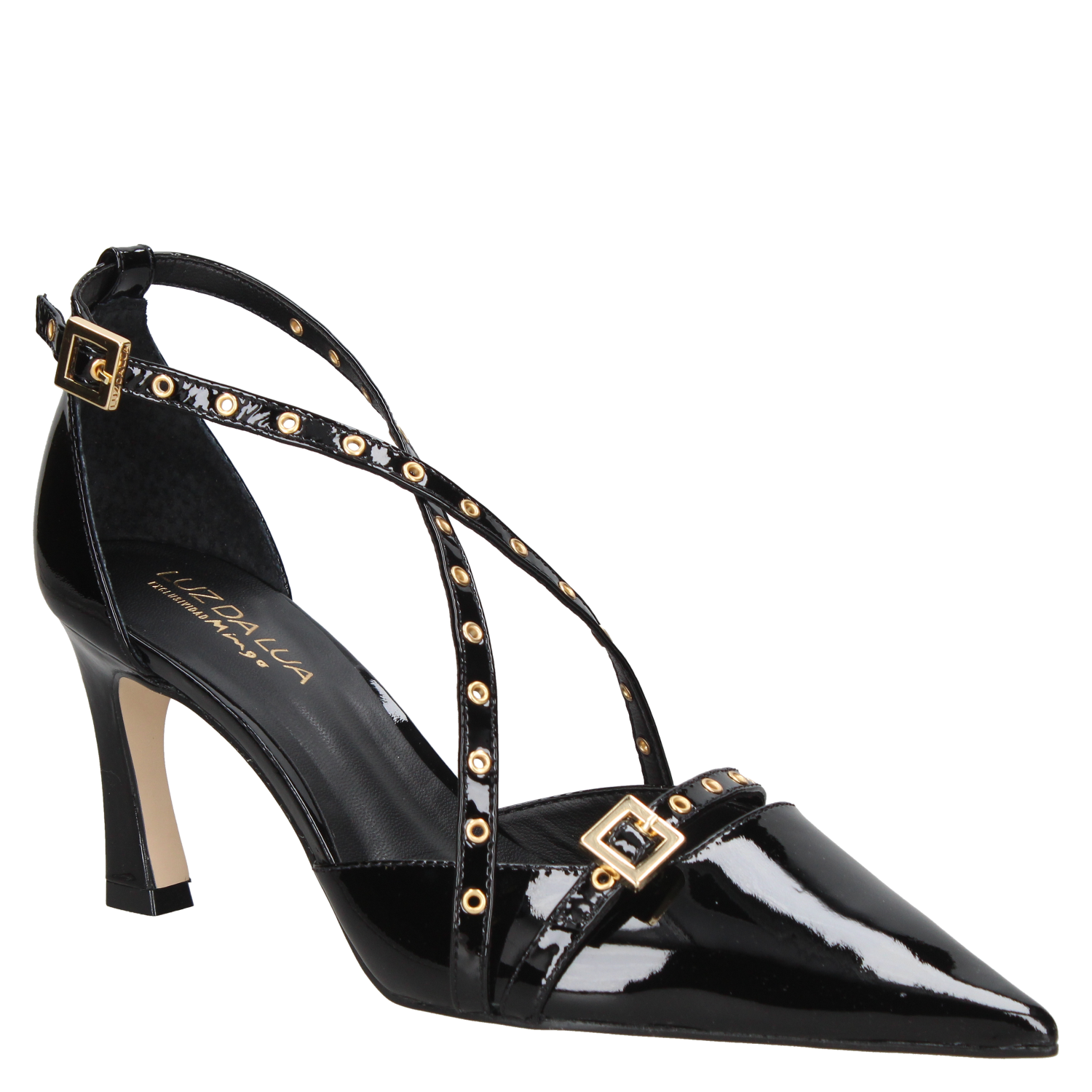 Descubre la elegancia del zapato stiletto de mujer de Luz Da Lua, un diseño de taco alto con exterior en 100% Cuero, acabado en charol. Su color negro clásico y las correas con ojales metálicos dorados aportan un toque sofisticado y moderno, ideal para quienes buscan un calzado formal y versátil tipo stiletto.