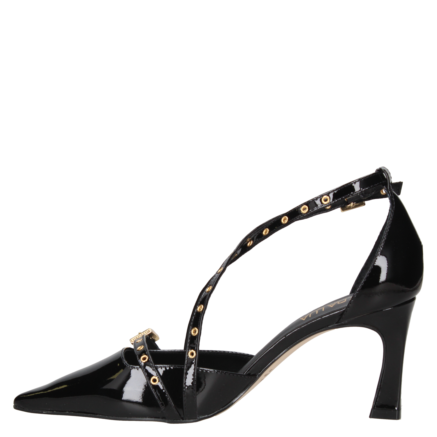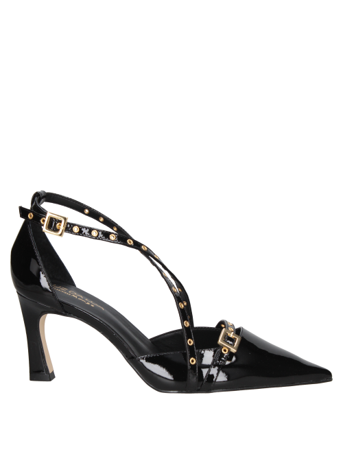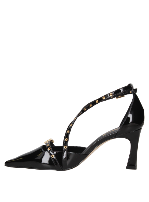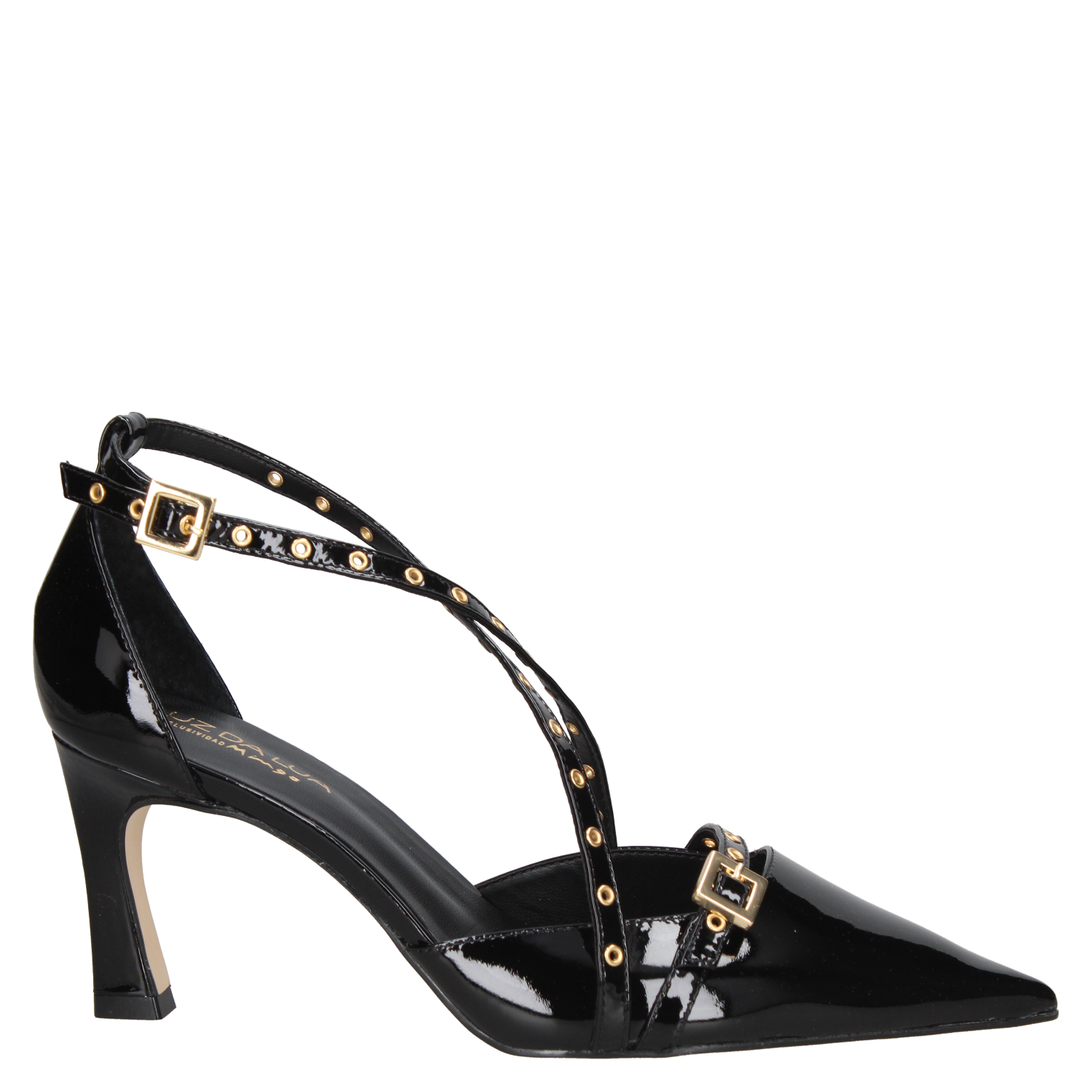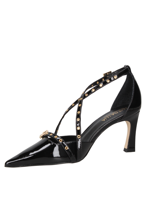 Descubre la elegancia del zapato stiletto de mujer de Luz Da Lua, un diseño de taco alto con exterior en 100% Cuero, acabado en charol. Su color negro clásico y las correas con ojales metálicos dorados aportan un toque sofisticado y moderno, ideal para quienes buscan un calzado formal y versátil tipo stiletto.