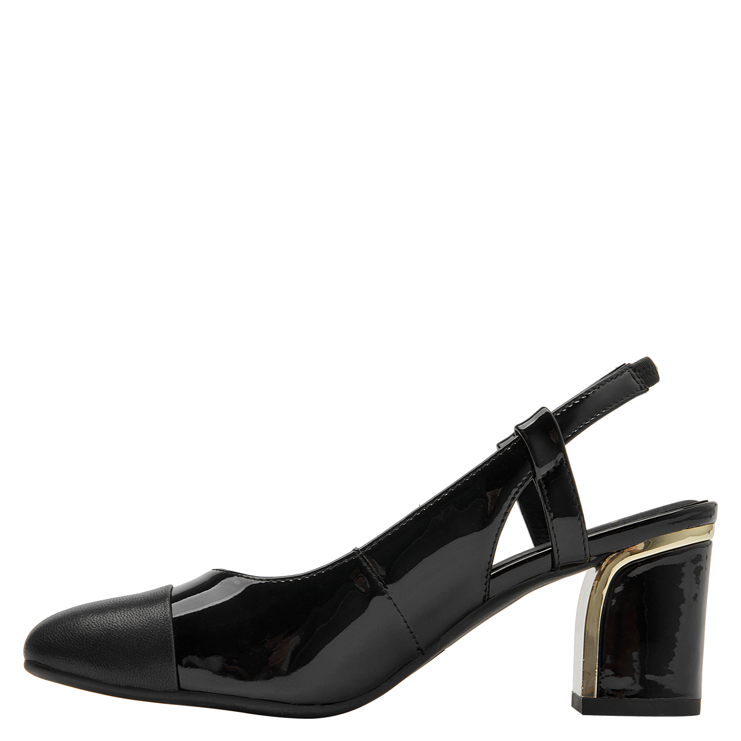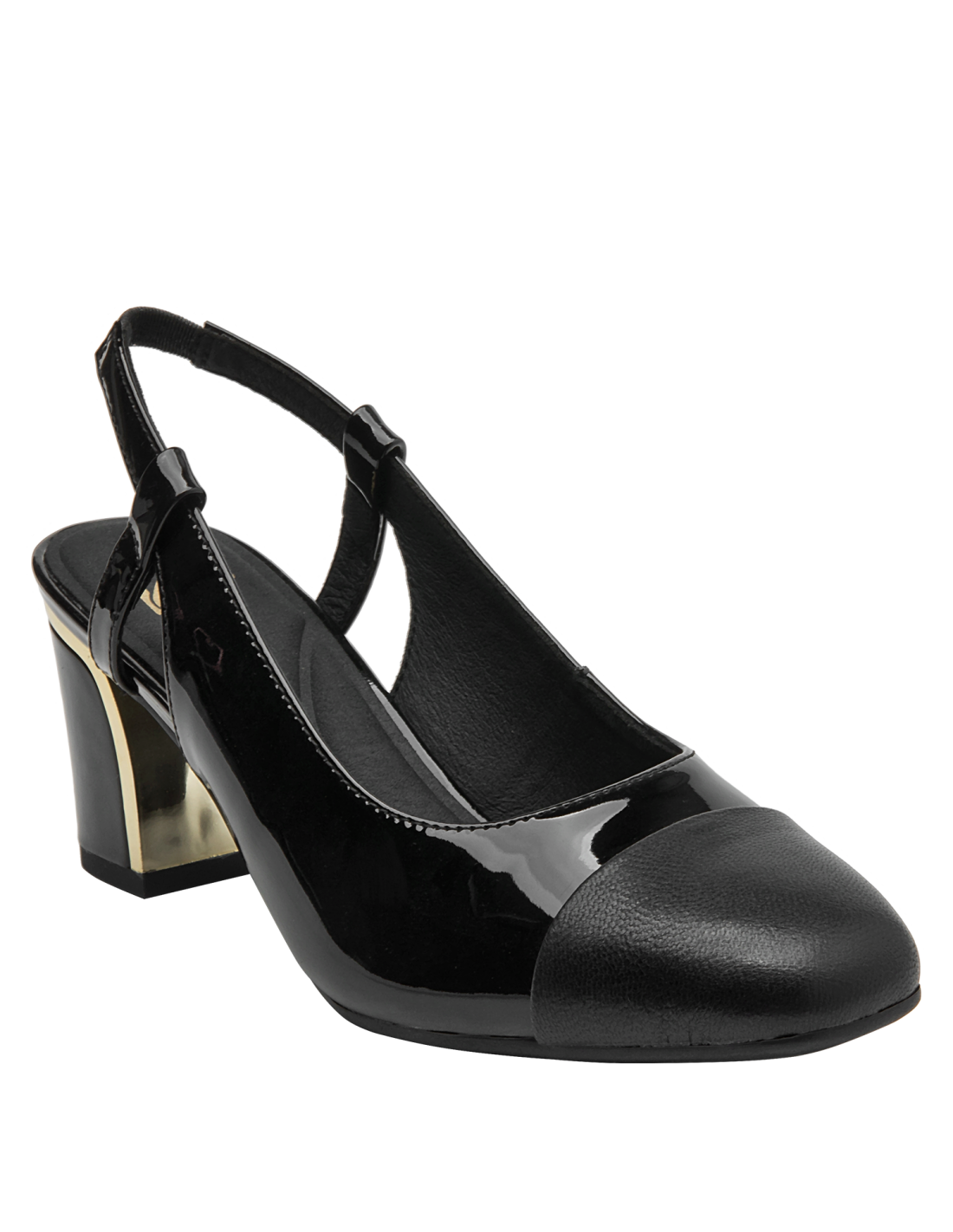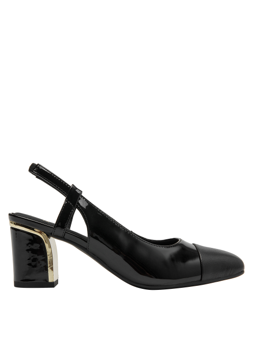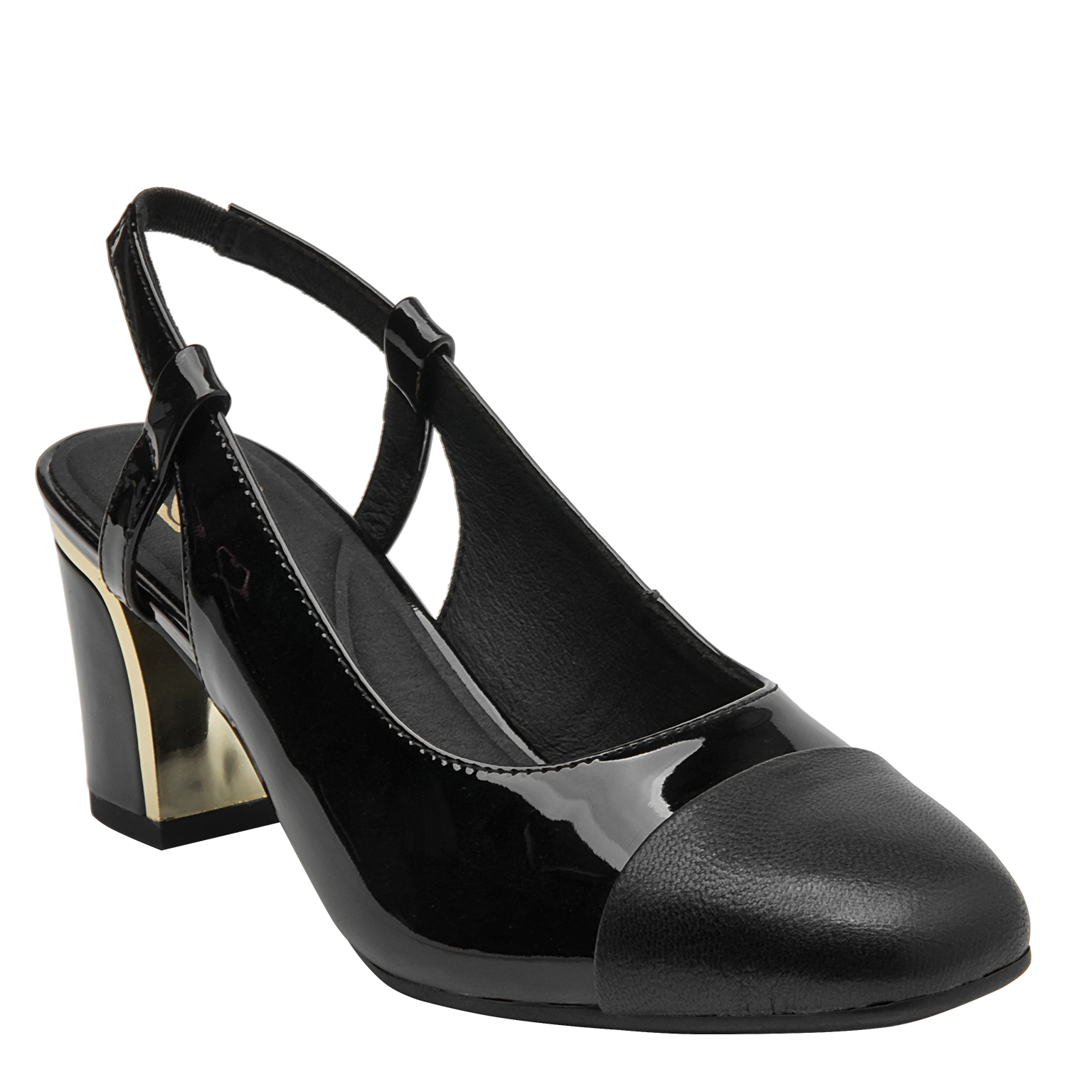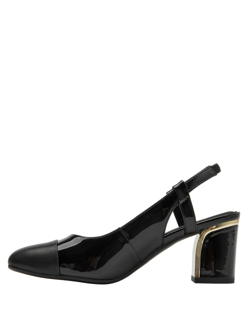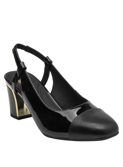 El zapato de mujer de 16 HRS combina elegancia y comodidad en un diseño que destaca por su acabado en cuero y charol negro brillante. Con una punta redonda y un taco bloque medio de 6.5 cm, ofrece un toque retro-chic ideal para quienes buscan un estilo sofisticado y moderno.