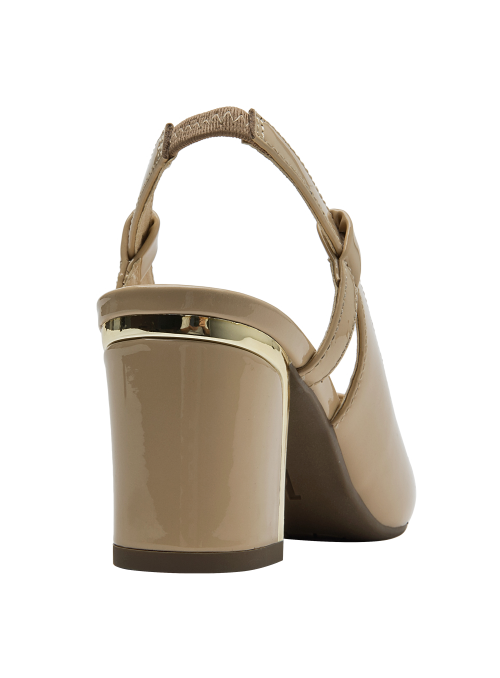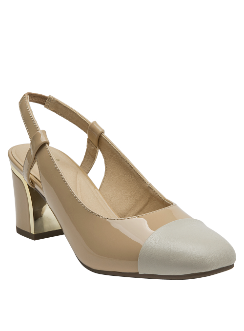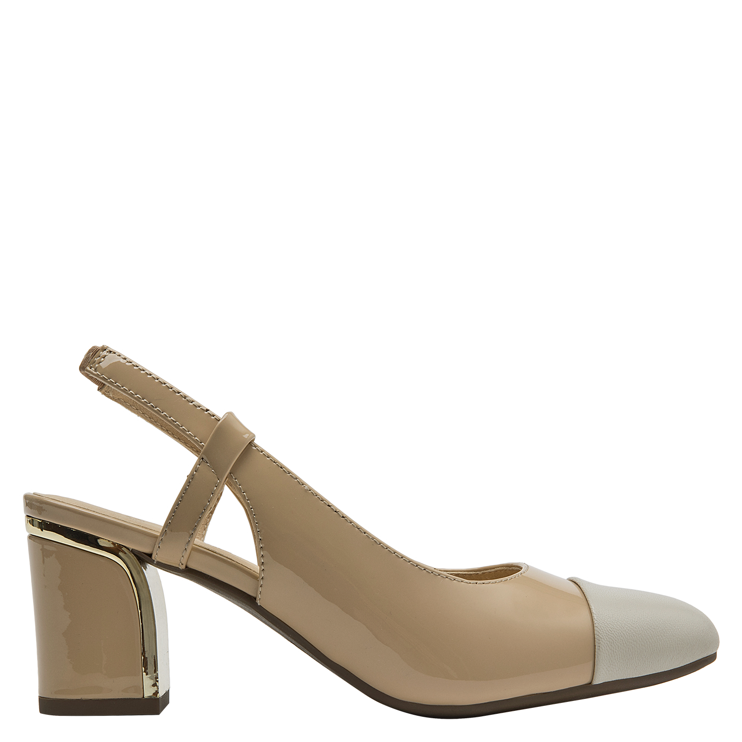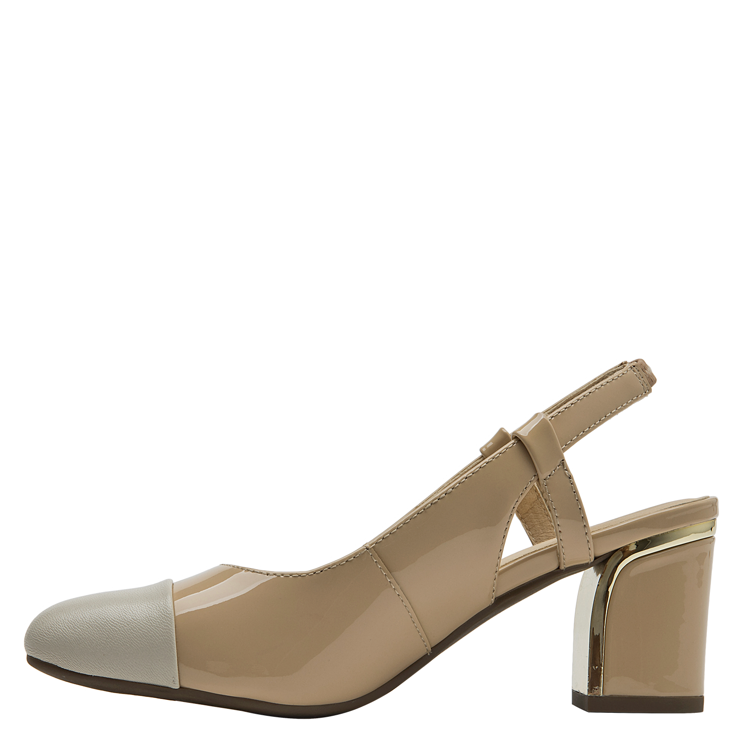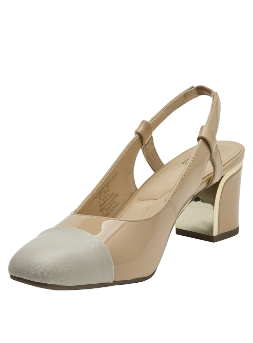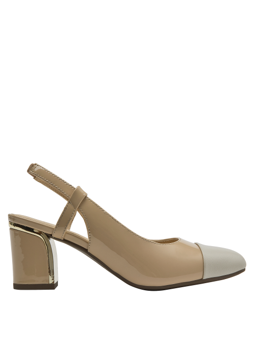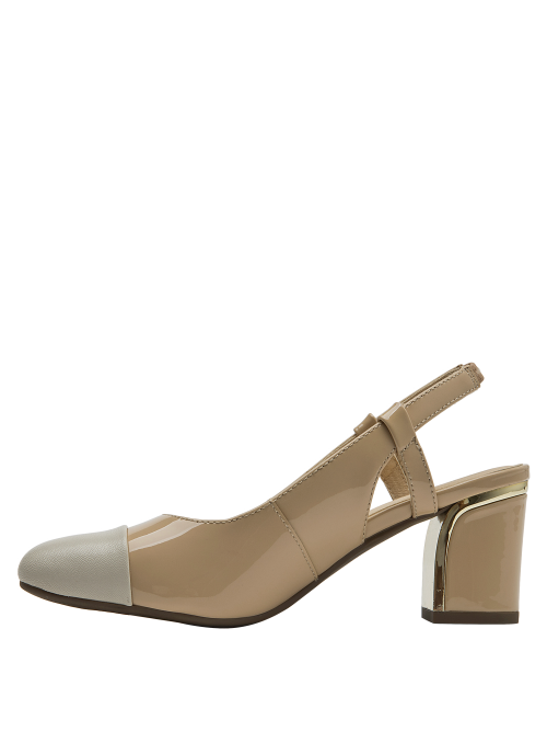 El zapato de mujer de 16 HRS destaca por su diseño elegante y sofisticado, ideal para eventos formales. Con un exterior de cuero charol que garantiza durabilidad y un acabado liso y brillante, su color beige brillante con puntera en tono más claro ofrece un toque clásico y versátil. La tira trasera ajustable y el taco de bloque medio de 6.5 cm aseguran comodidad durante largas jornadas.