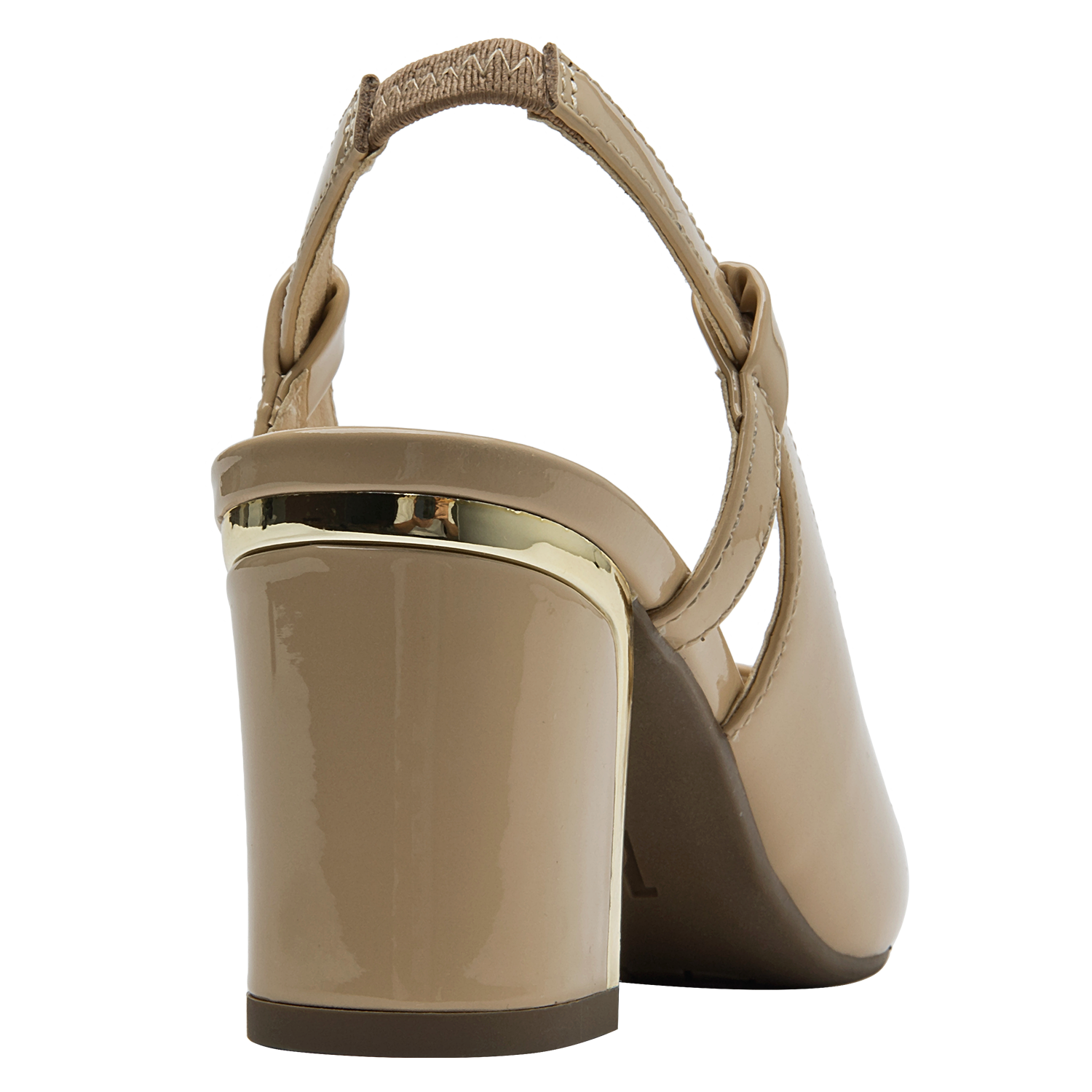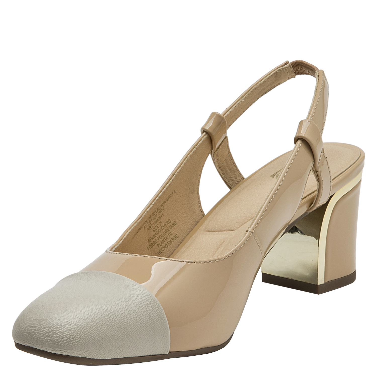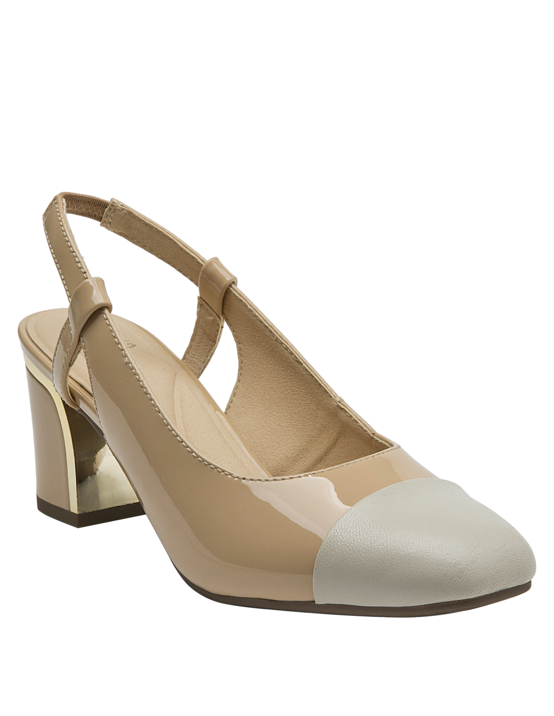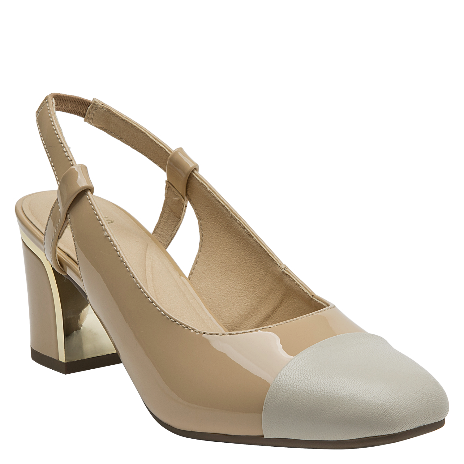 El zapato de mujer de 16 HRS destaca por su diseño elegante y sofisticado, ideal para eventos formales. Con un exterior de cuero charol que garantiza durabilidad y un acabado liso y brillante, su color beige brillante con puntera en tono más claro ofrece un toque clásico y versátil. La tira trasera ajustable y el taco de bloque medio de 6.5 cm aseguran comodidad durante largas jornadas.