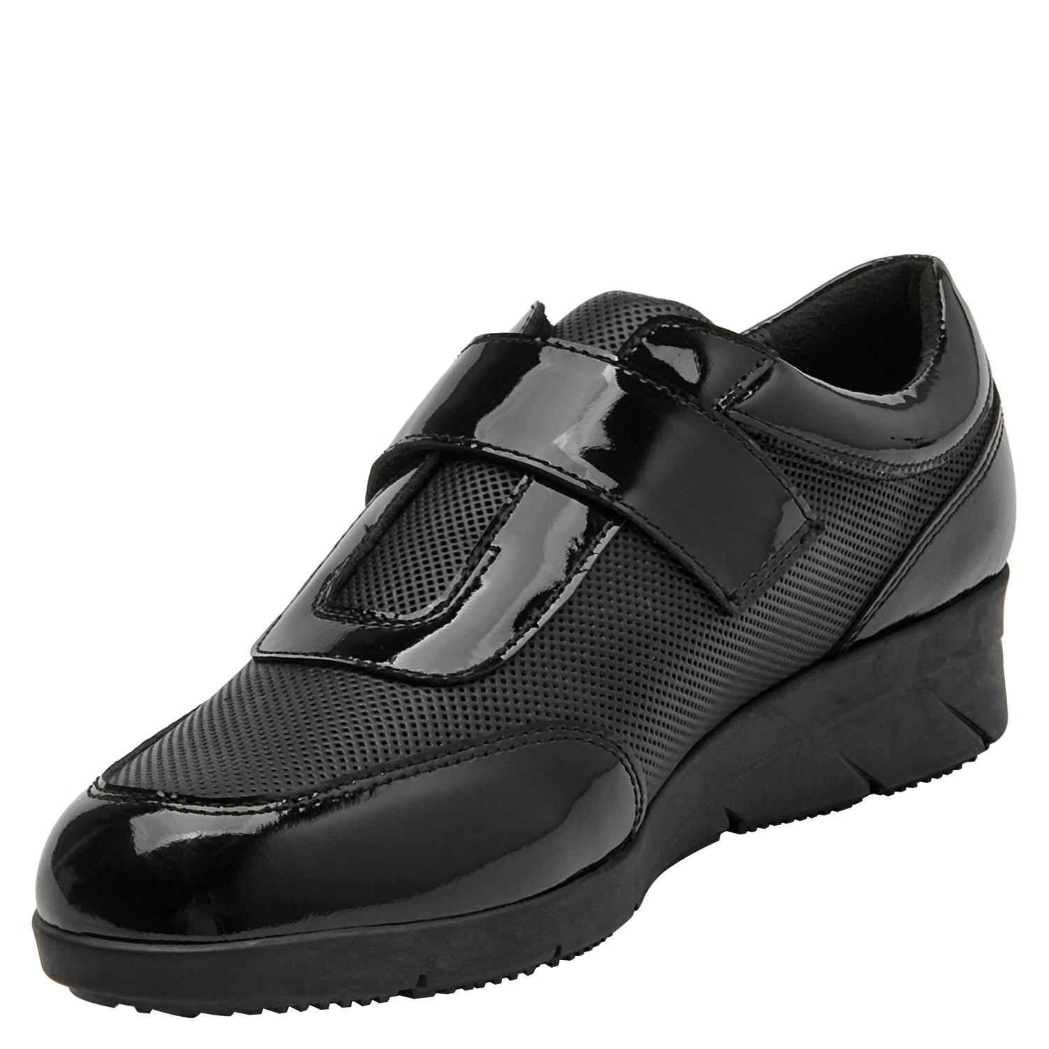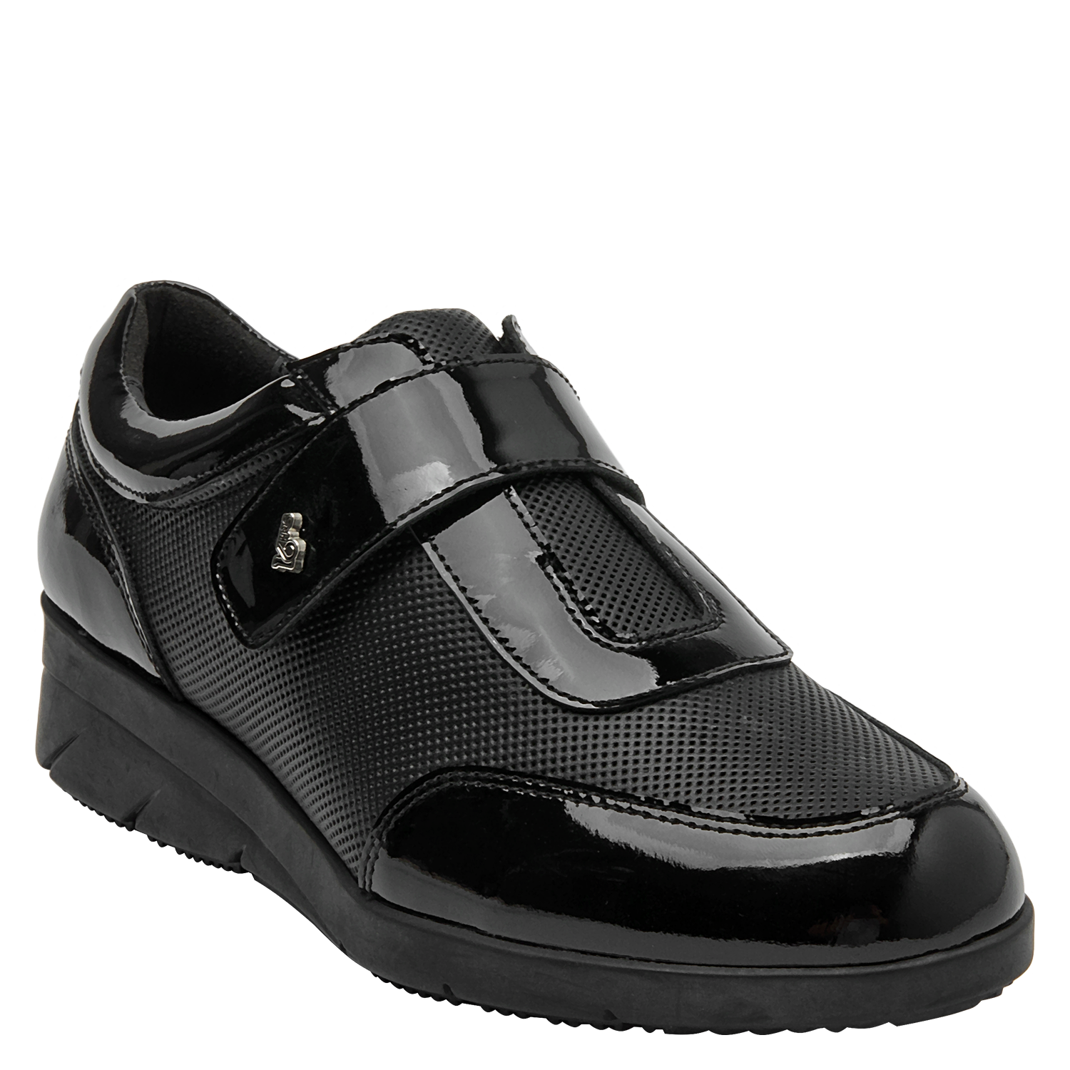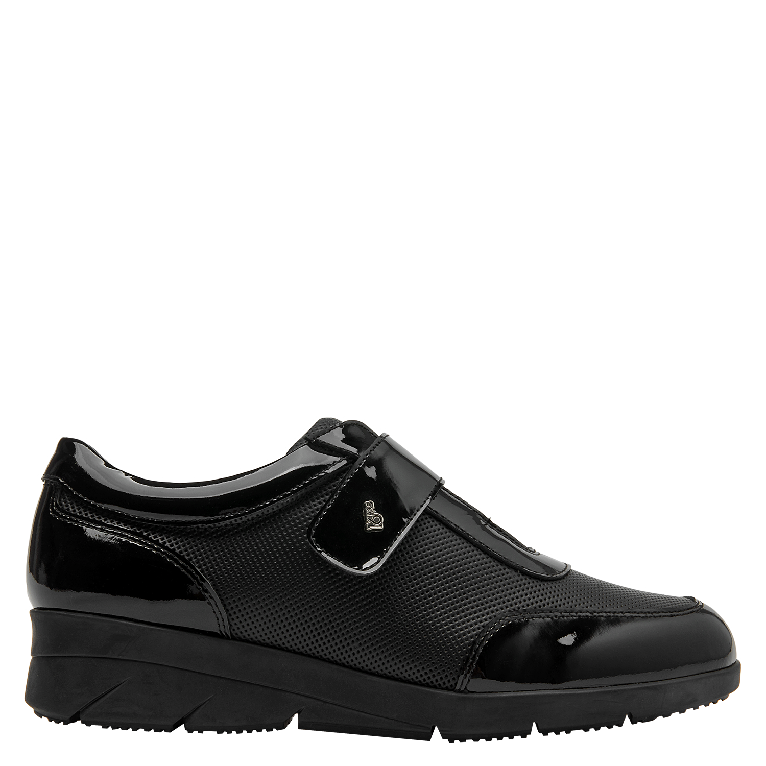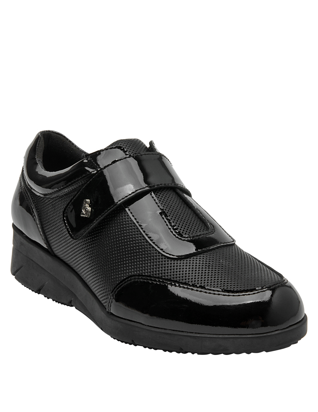 El Zapato de mujer de 16 HRS es la fusión perfecta entre elegancia y funcionalidad. Con un diseño moderno en cuero negro de acabado charol, este zapato destaca por su brillo y textura lisa, mientras que el cierre de velcro asegura un ajuste personalizado y práctico, ideal para quienes buscan comodidad sin sacrificar el estilo.