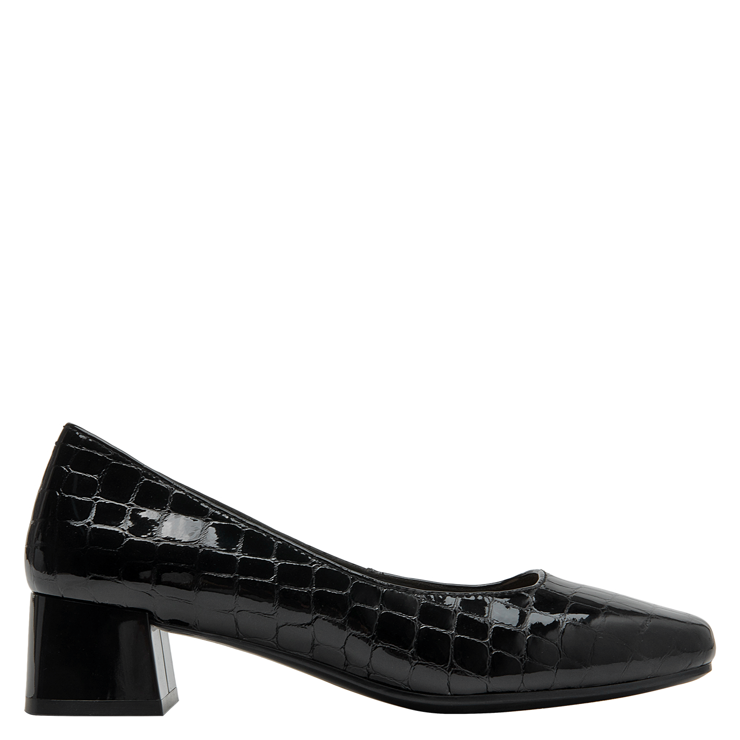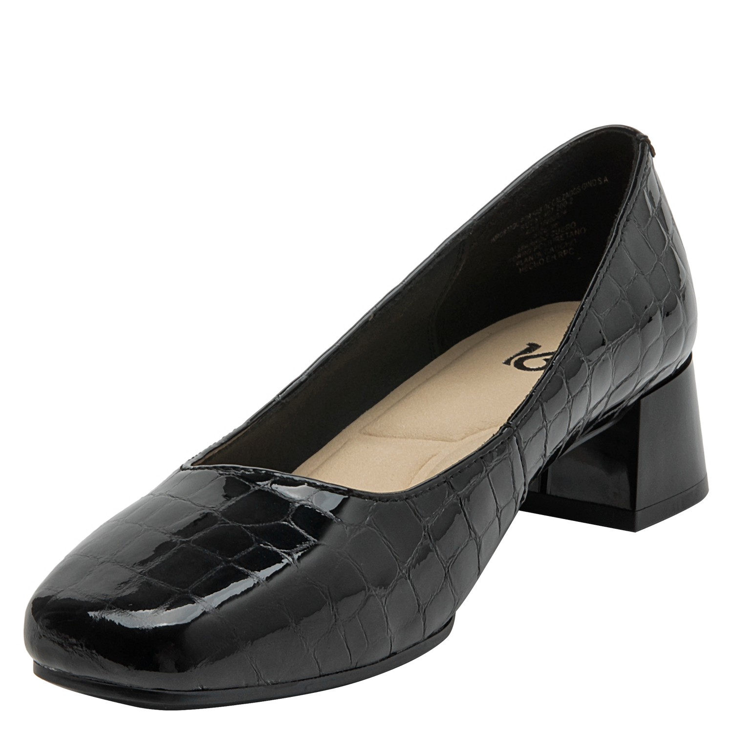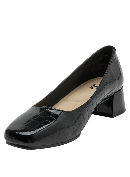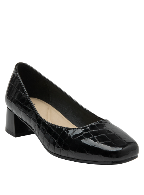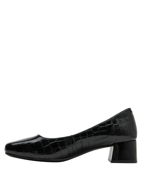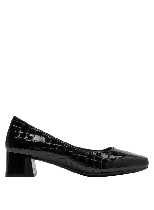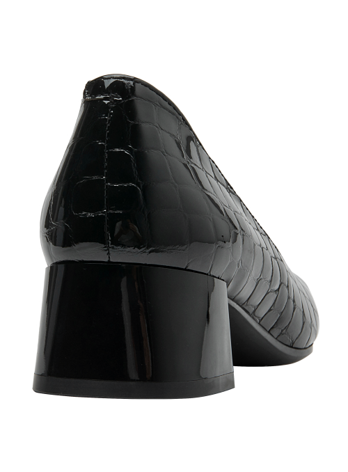 Zapato de cuero negro con diseño clásico y tacón bajo, perfecto para oficina. Calzado elegante de mujer en charol negro, versátil para ocasiones formales. Calzado femenino formal en charol negro, ideal para eventos corporativos. Diseño formal y elegante en cuero negro con patrón de cocodrilo. Zapato de mujer negro de cuero charol con textura de reptil y tacón cuadrado.