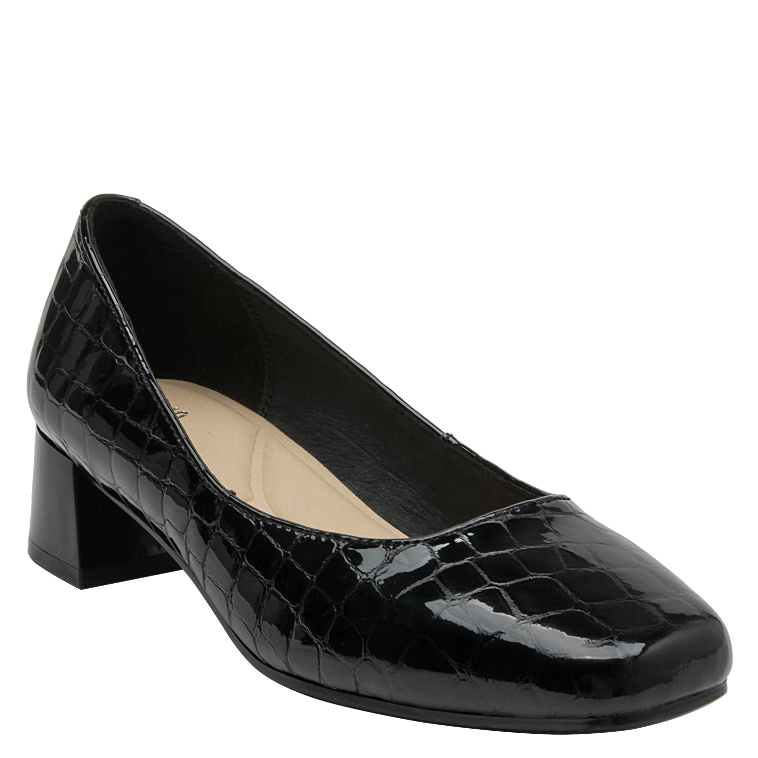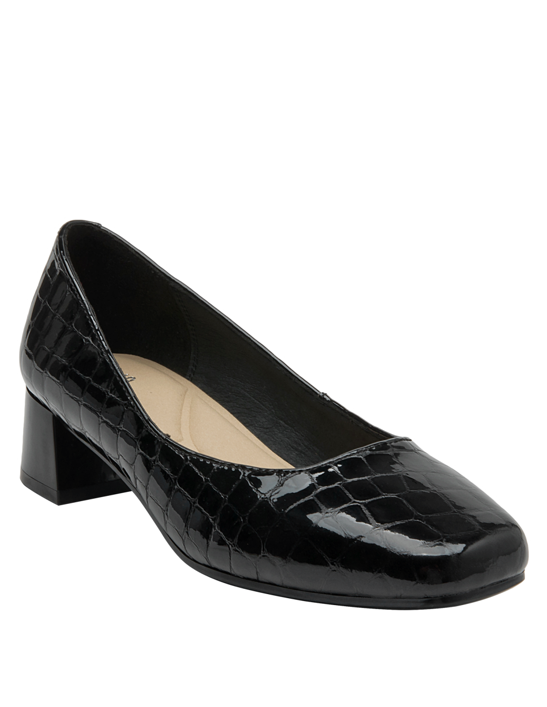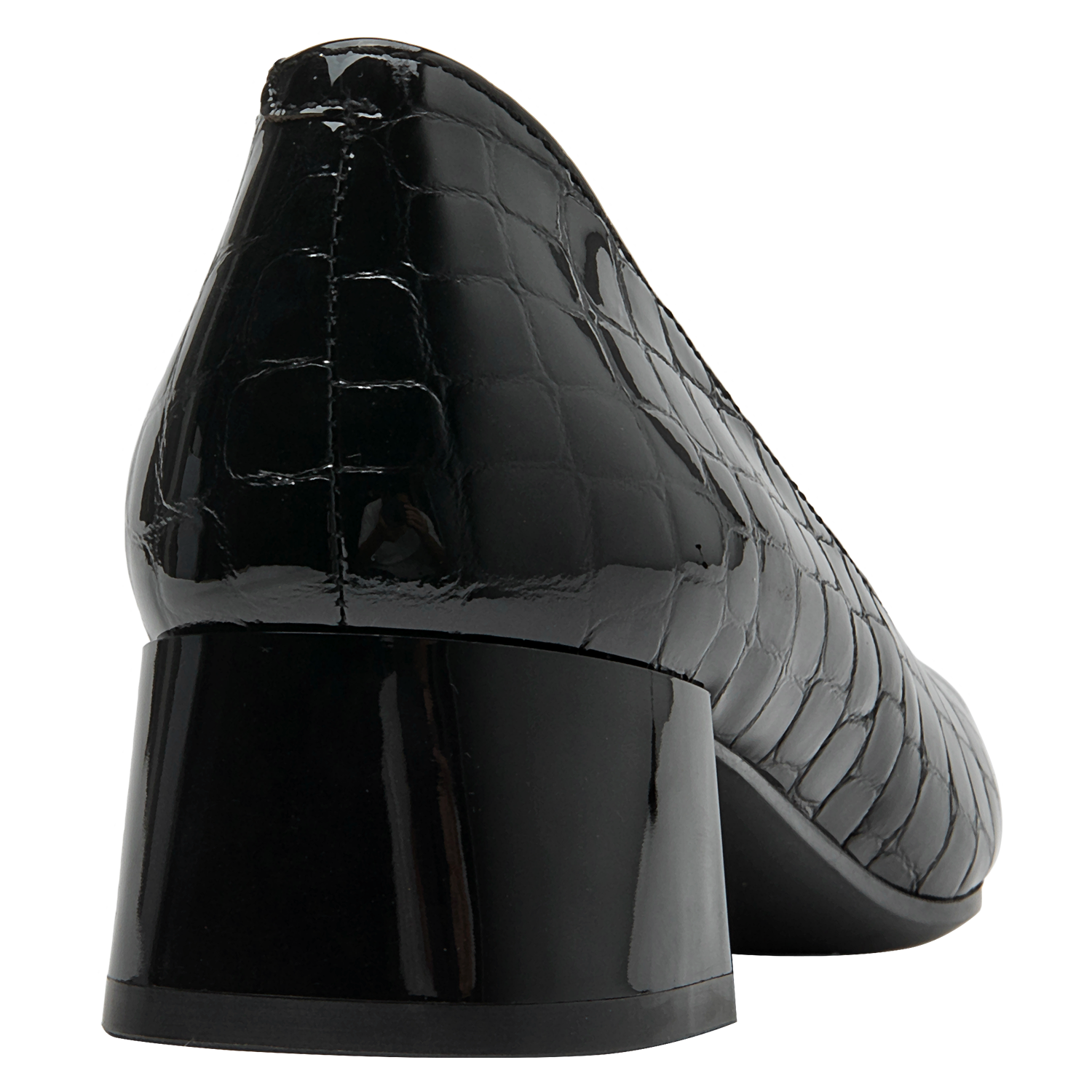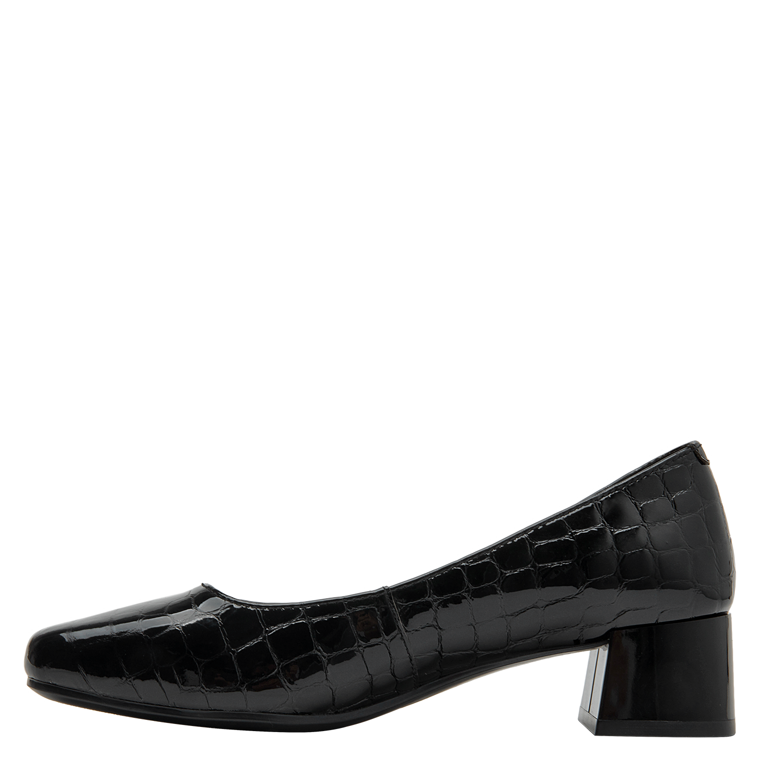 Zapato de cuero negro con diseño clásico y tacón bajo, perfecto para oficina. Calzado elegante de mujer en charol negro, versátil para ocasiones formales. Calzado femenino formal en charol negro, ideal para eventos corporativos. Diseño formal y elegante en cuero negro con patrón de cocodrilo. Zapato de mujer negro de cuero charol con textura de reptil y tacón cuadrado.