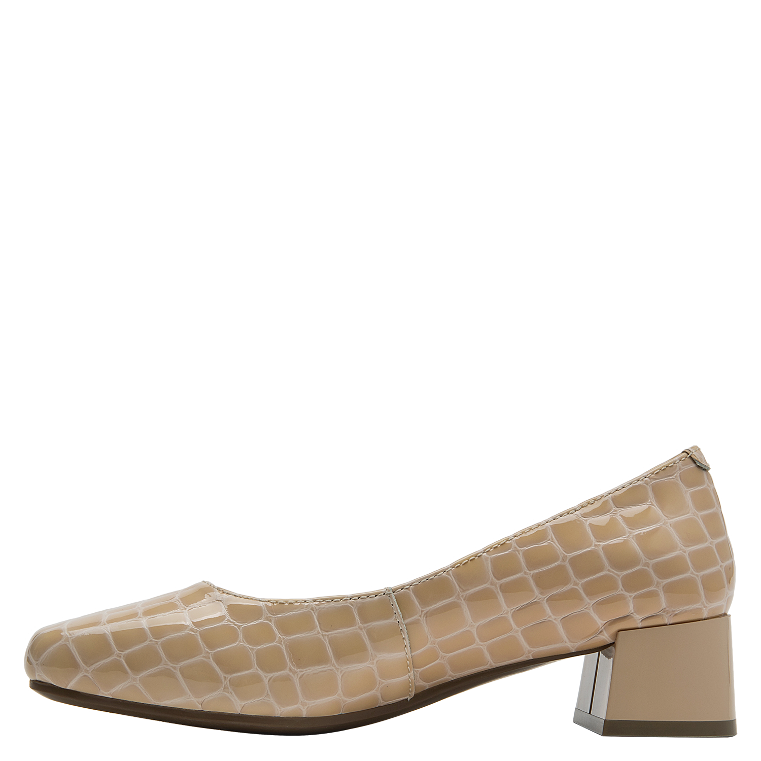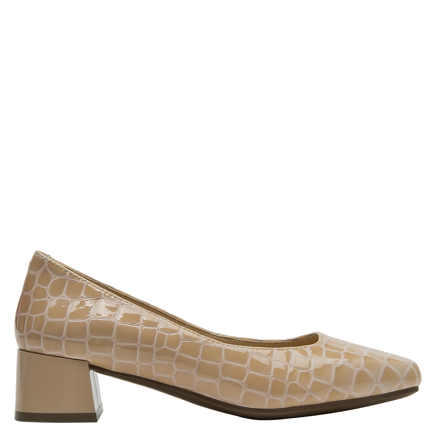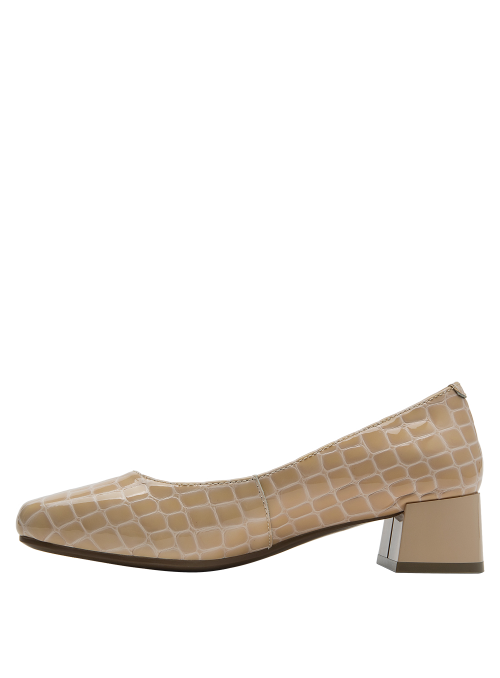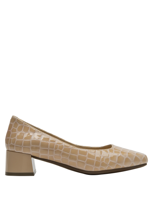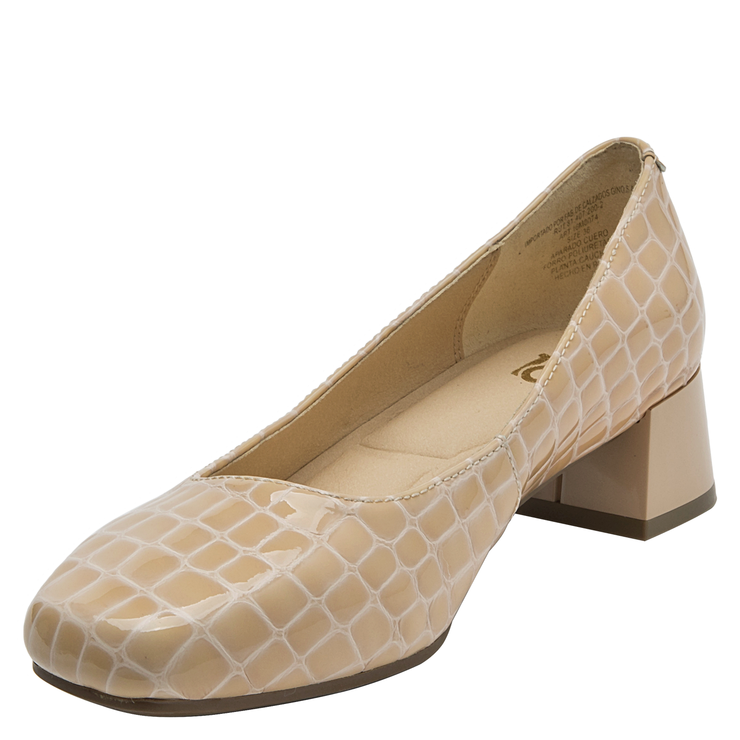 El zapato de mujer de 16 HRS deslumbra con su diseño elegante y sofisticado, confeccionado en cuero charol con acabado que imita la piel de cocodrilo. Este zapato formal en tono nude, con taco medio de 5 cm, ofrece un toque de lujo y exclusividad, ideal para quienes buscan calzado de alta calidad y diseño minimalista.