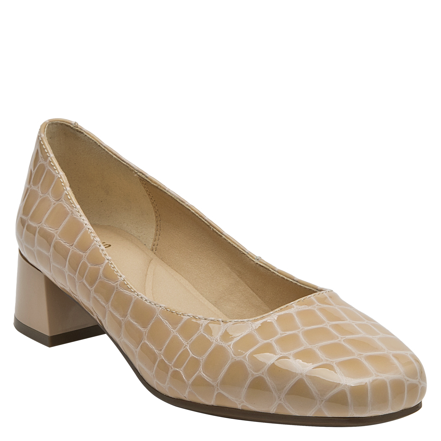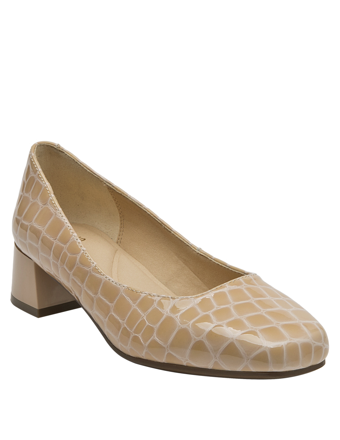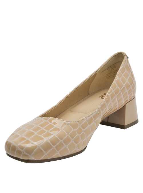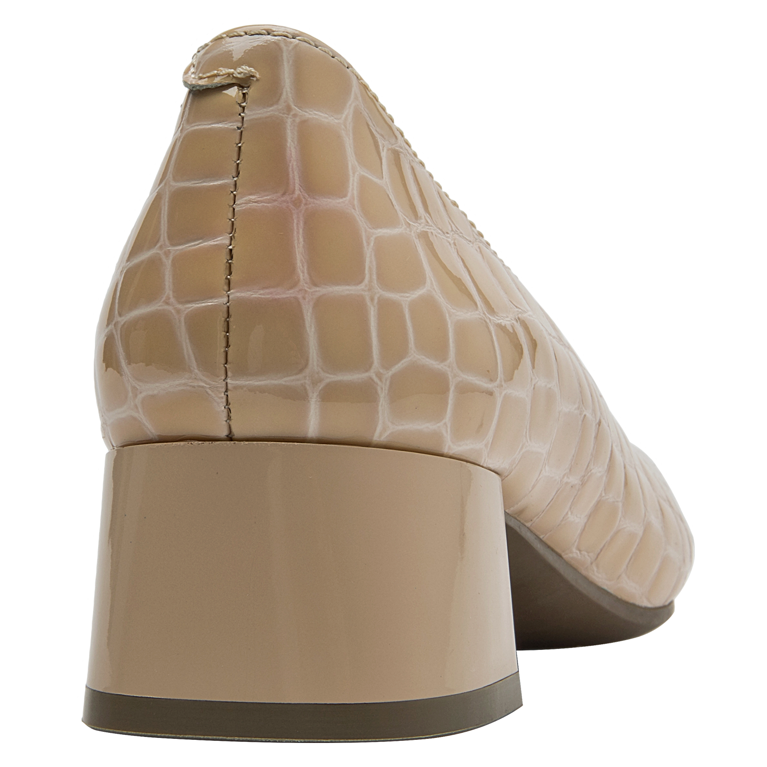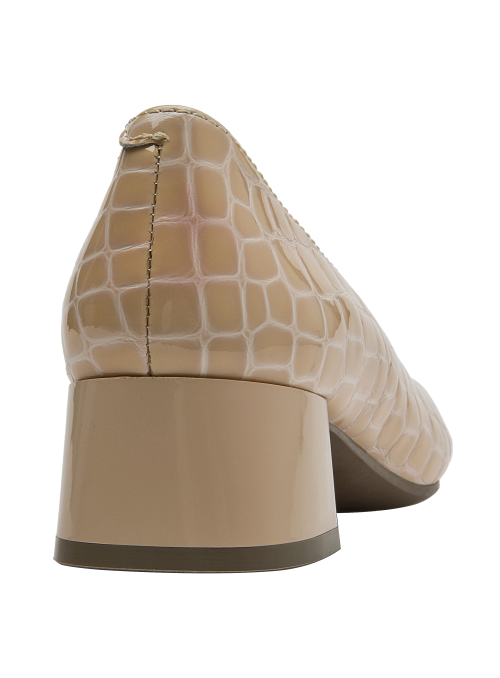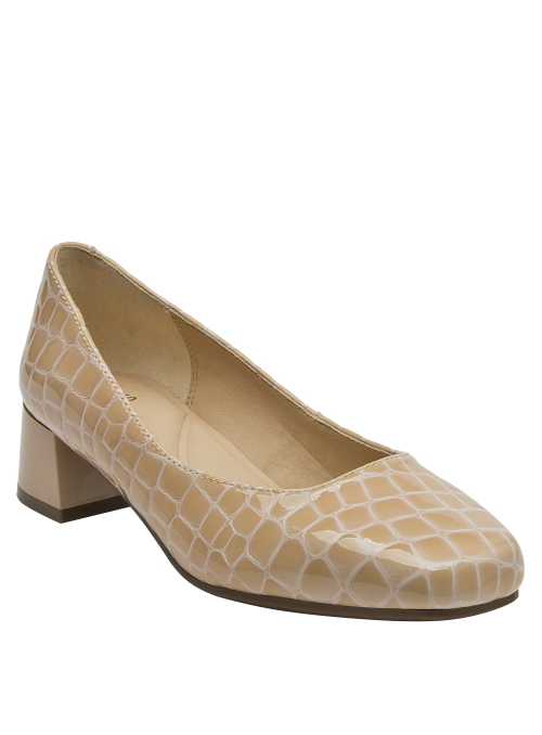 El zapato de mujer de 16 HRS deslumbra con su diseño elegante y sofisticado, confeccionado en cuero charol con acabado que imita la piel de cocodrilo. Este zapato formal en tono nude, con taco medio de 5 cm, ofrece un toque de lujo y exclusividad, ideal para quienes buscan calzado de alta calidad y diseño minimalista.