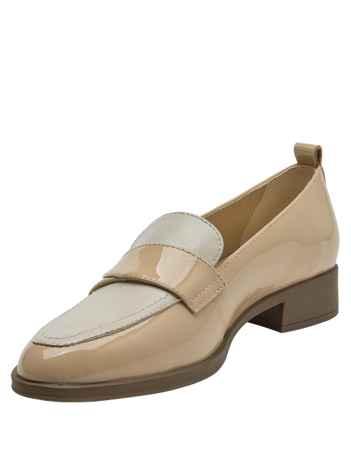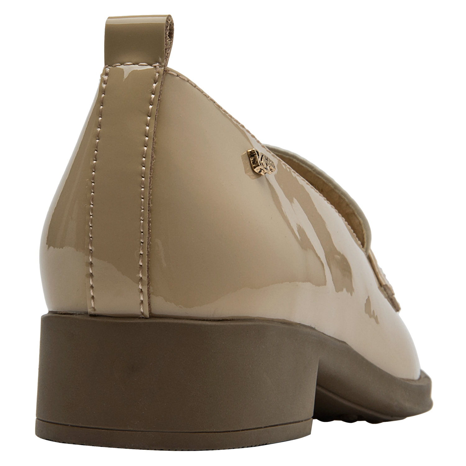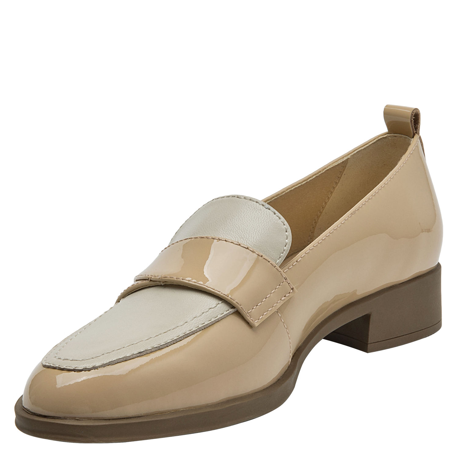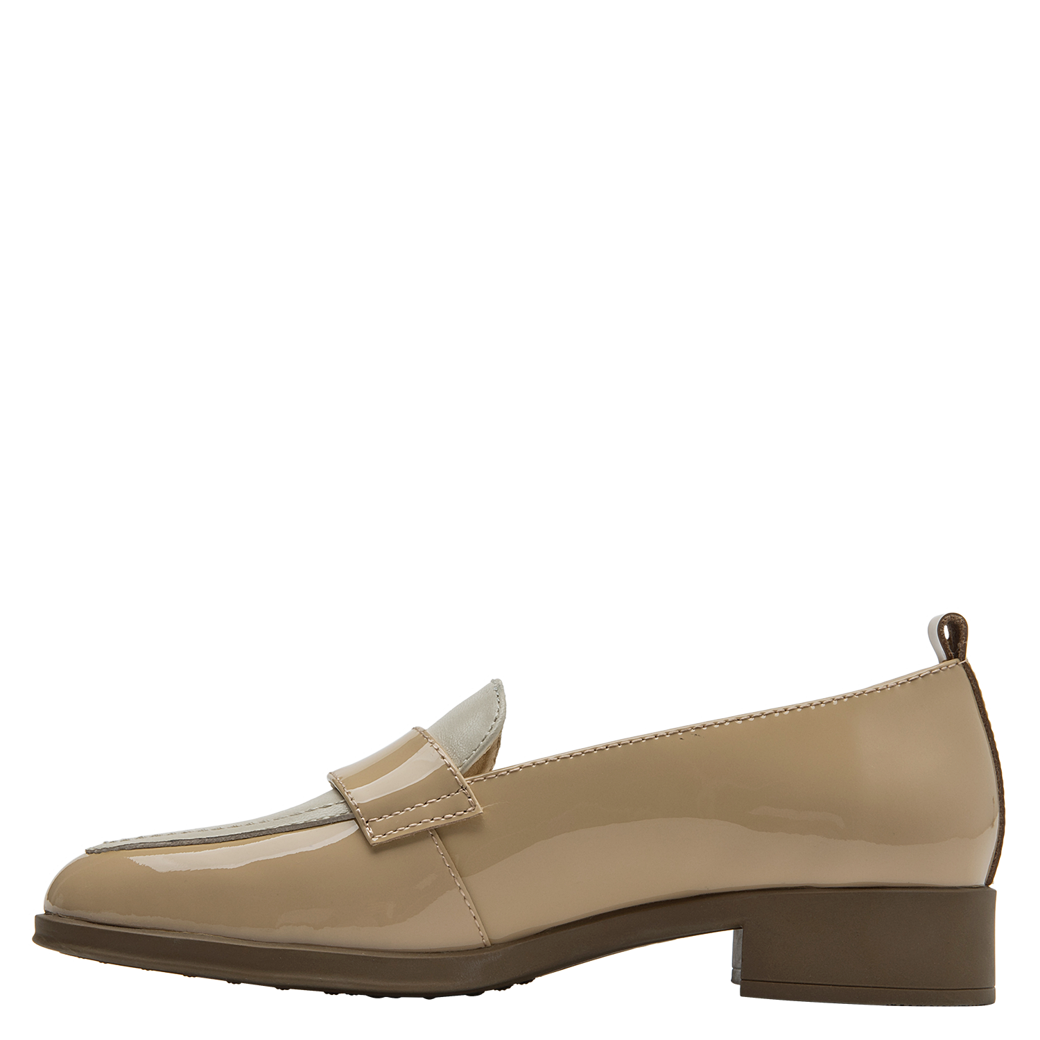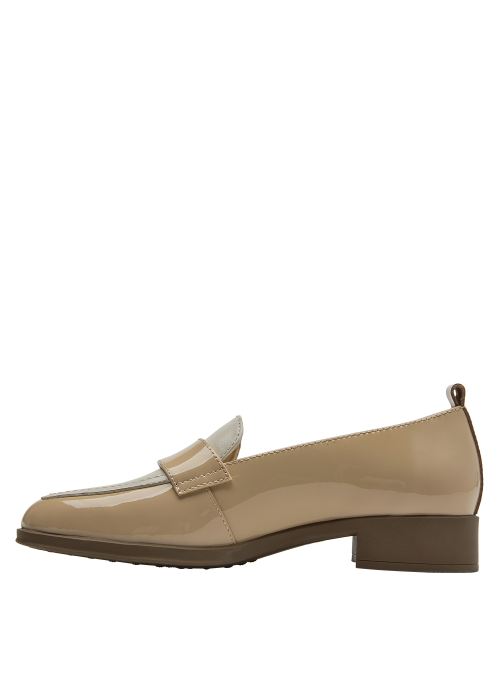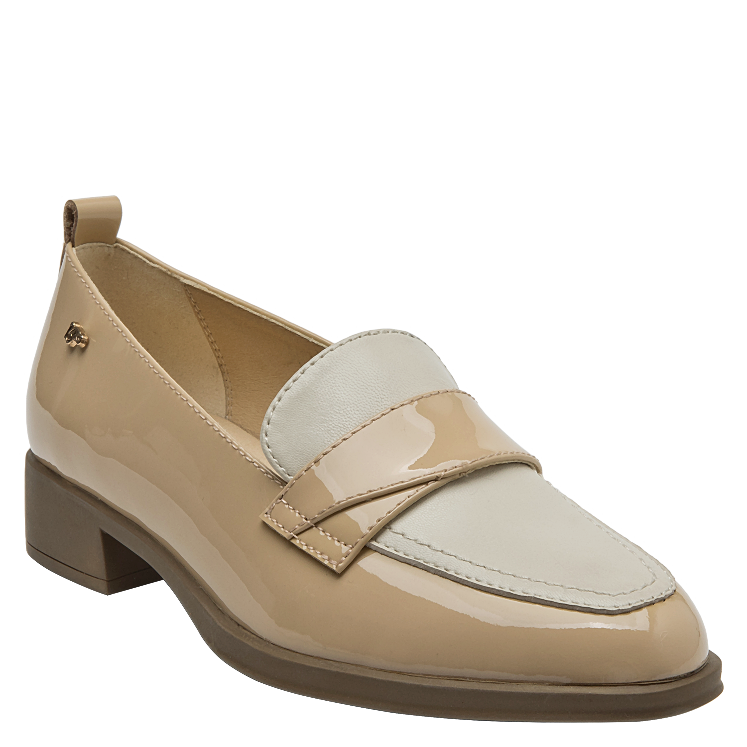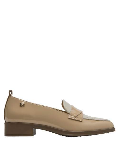 El mocasín de mujer de 16 HRS es un calzado elegante que combina un diseño moderno con un acabado en charol brillante. Su sobria paleta de colores beige y crema, junto con el detallado decorativo en la lengüeta, le otorgan un aire sofisticado y versátil. Con un taco bajo de bloque de 2.5 cm y una punta redonda, es ideal para quienes buscan estilo y comodidad.