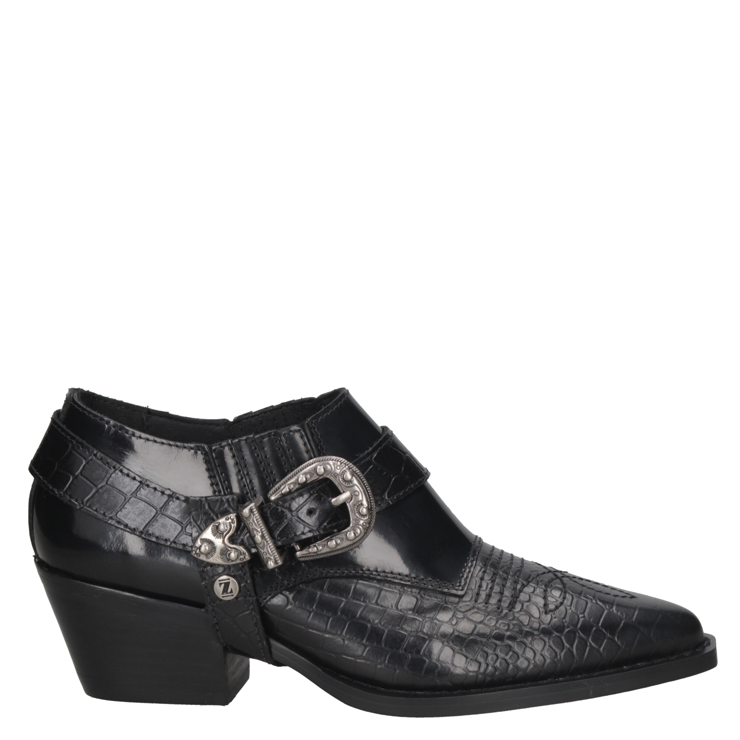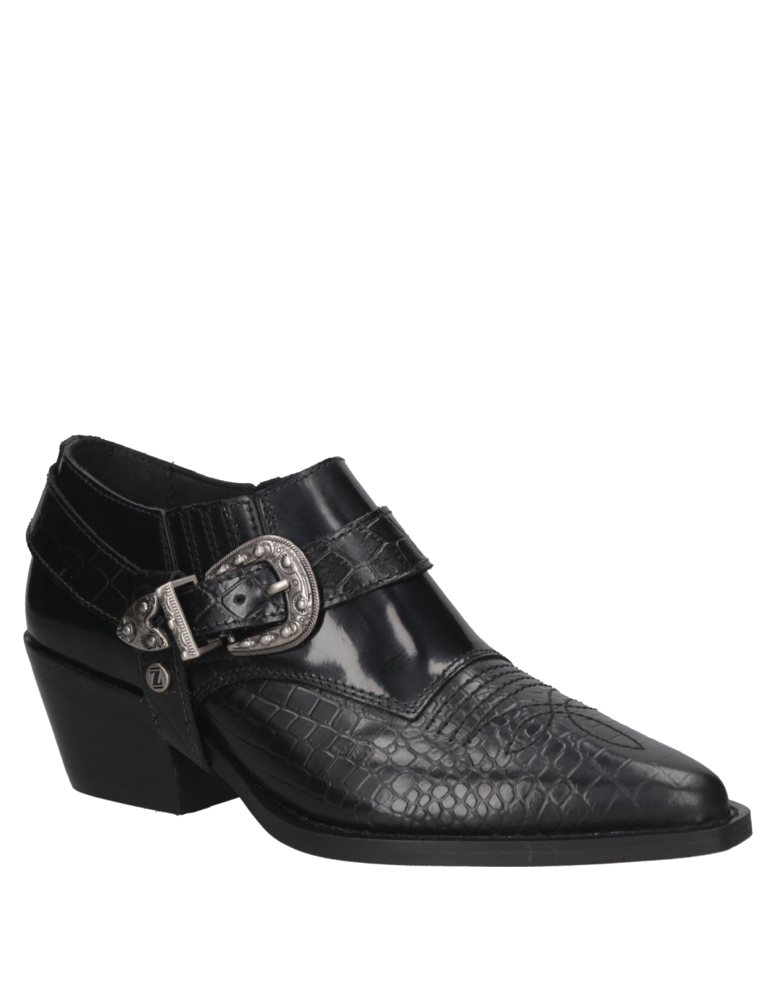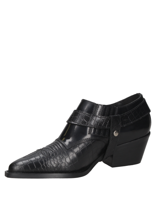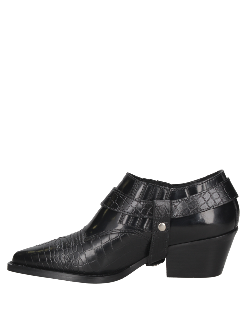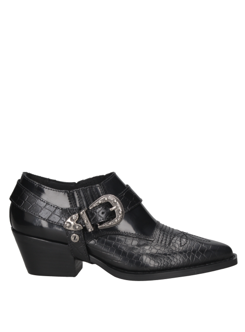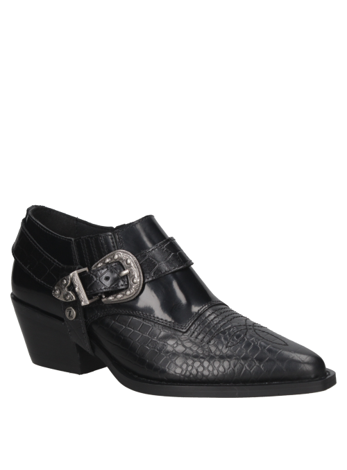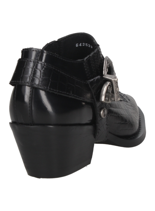 El zapato vaquero de mujer de Zappa fusiona lo elegante con un toque cowboy, destacándose en tendencias urbanas sofisticadas. Confeccionado en cuero negro y textura de reptil, su hebilla metálica plateada y taco bajo de 6.5 cm ofrecen un estilo moderno y cómodo, ideal para quienes buscan un look exótico y refinado.
