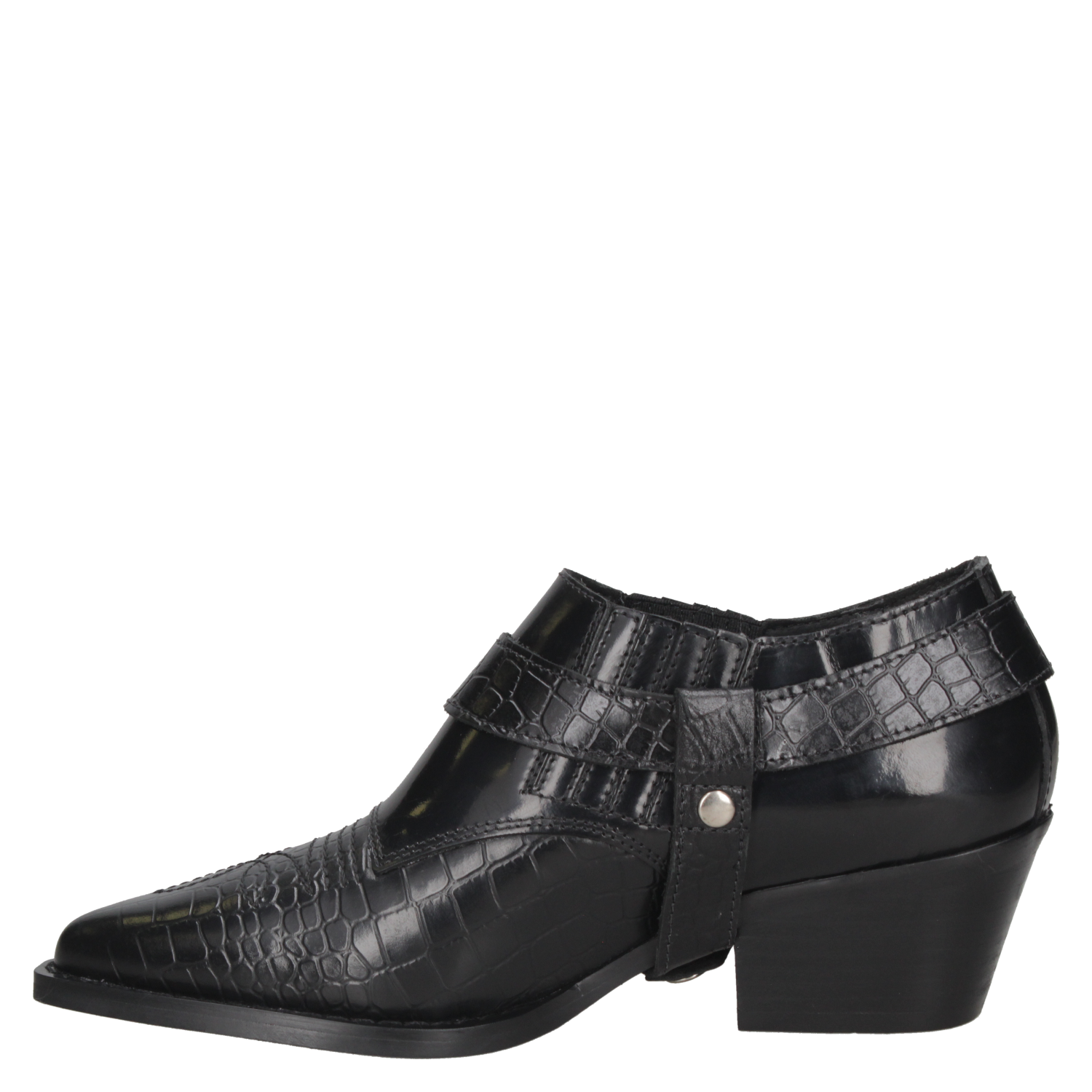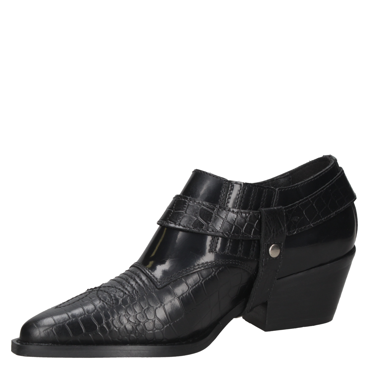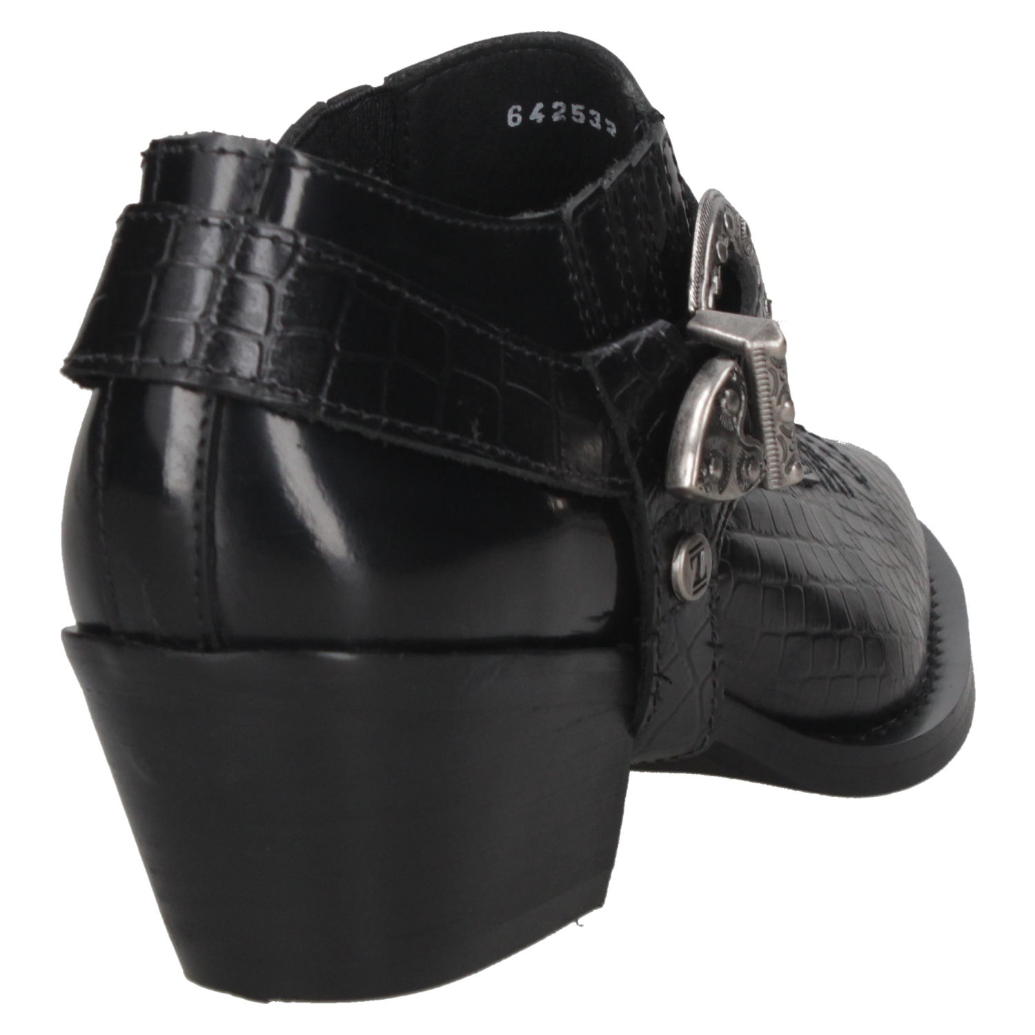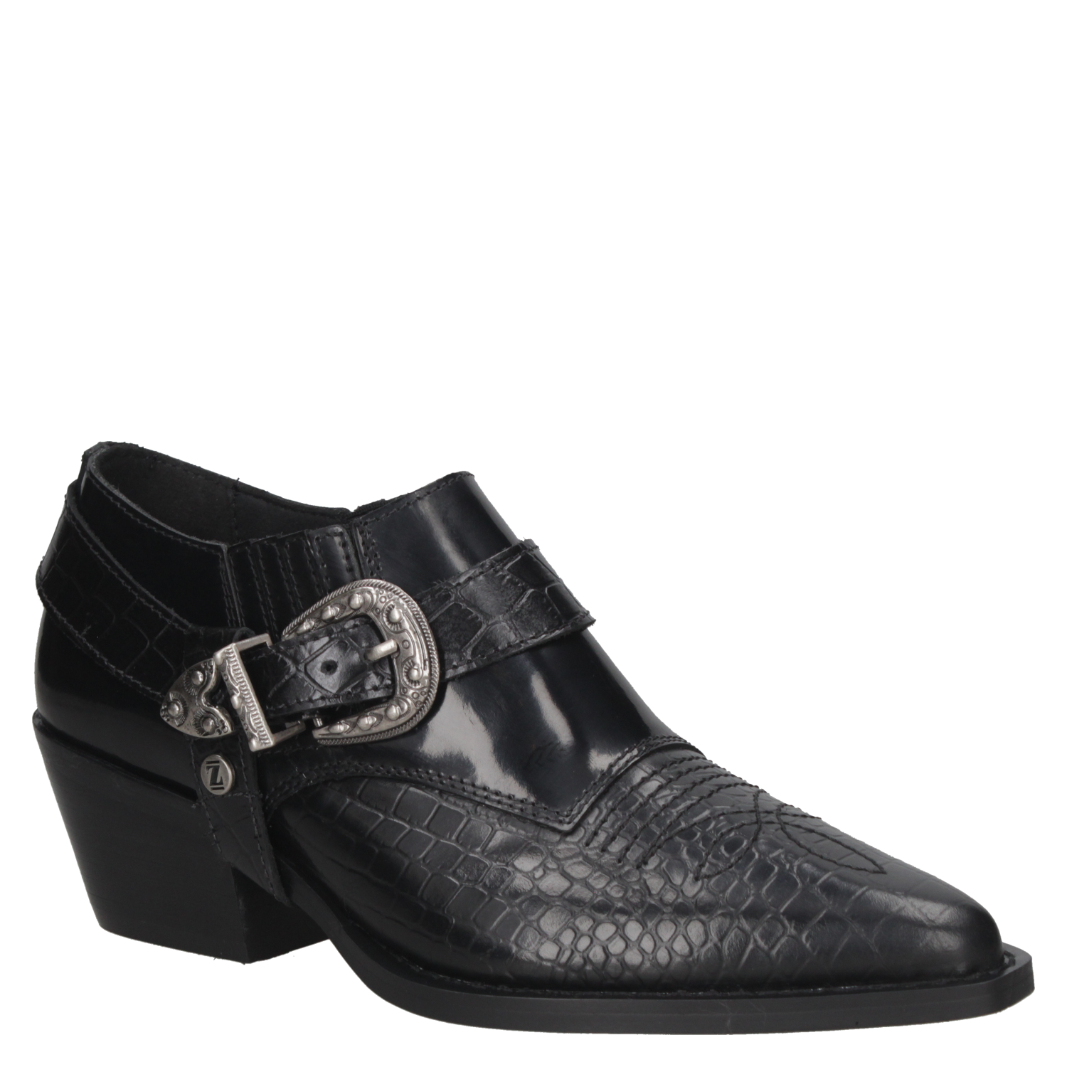 El zapato vaquero de mujer de Zappa fusiona lo elegante con un toque cowboy, destacándose en tendencias urbanas sofisticadas. Confeccionado en cuero negro y textura de reptil, su hebilla metálica plateada y taco bajo de 6.5 cm ofrecen un estilo moderno y cómodo, ideal para quienes buscan un look exótico y refinado.